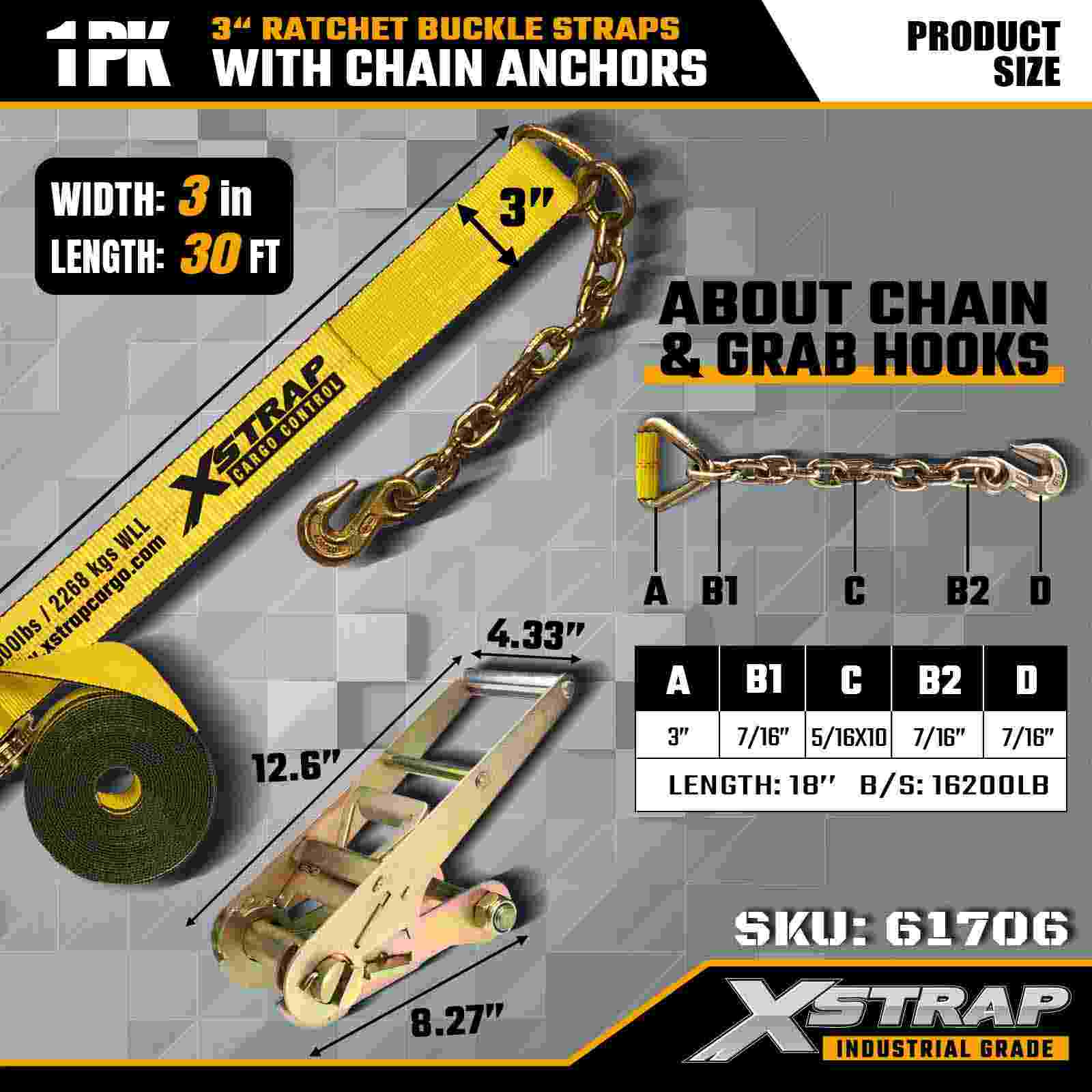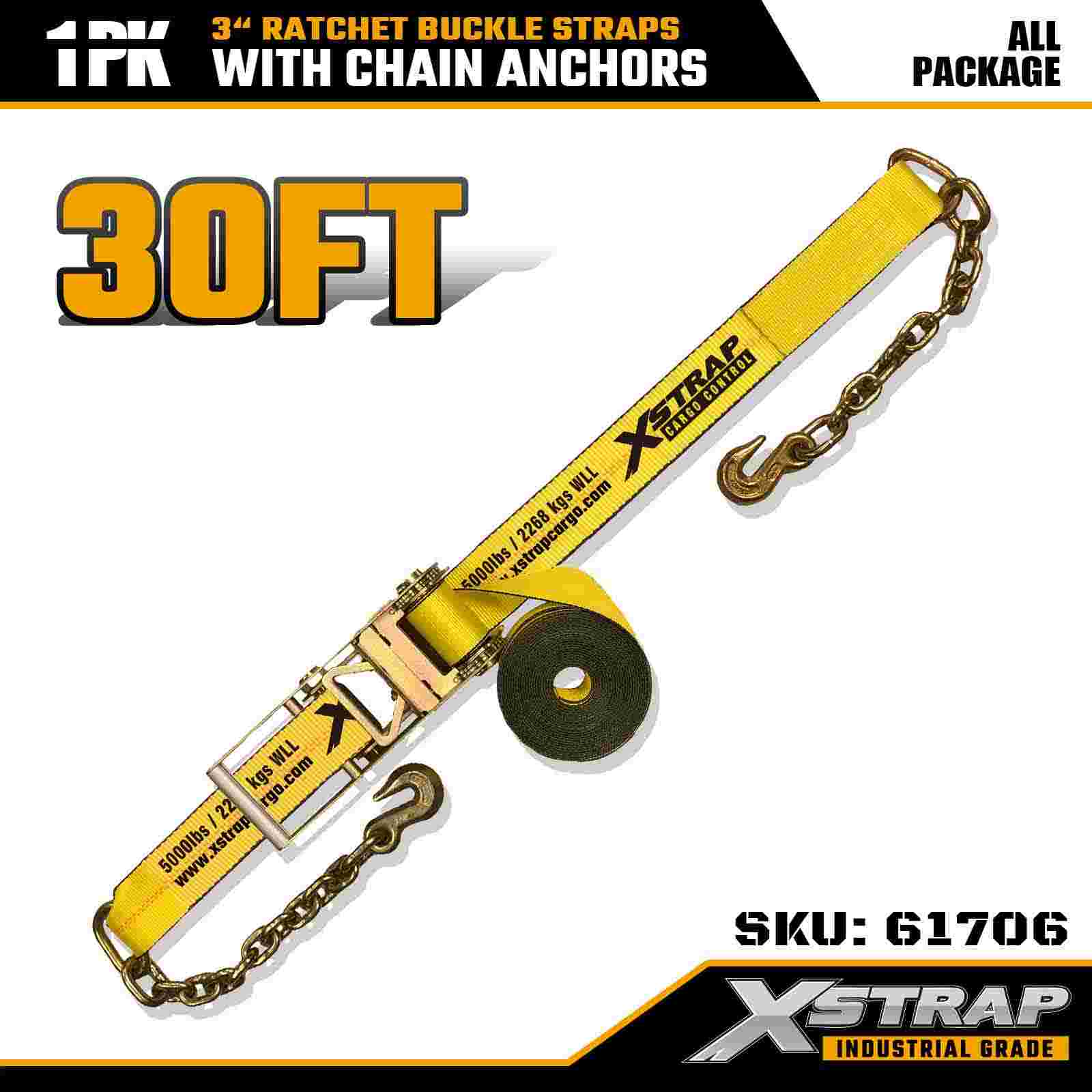 De Xstrap 61706 3" x 30ft ratelgespriem (1-pack) is ontworpen voor het vastzetten van zware ladingen, met gesmede kettingankers en een hoogspanningsratelsysteem. Met een WLL van 5.000 lbs en een breeksterkte van 15.000 lbs levert hij betrouwbare prestaties voor diepladers, machinetransport en industrieel vervoer.
