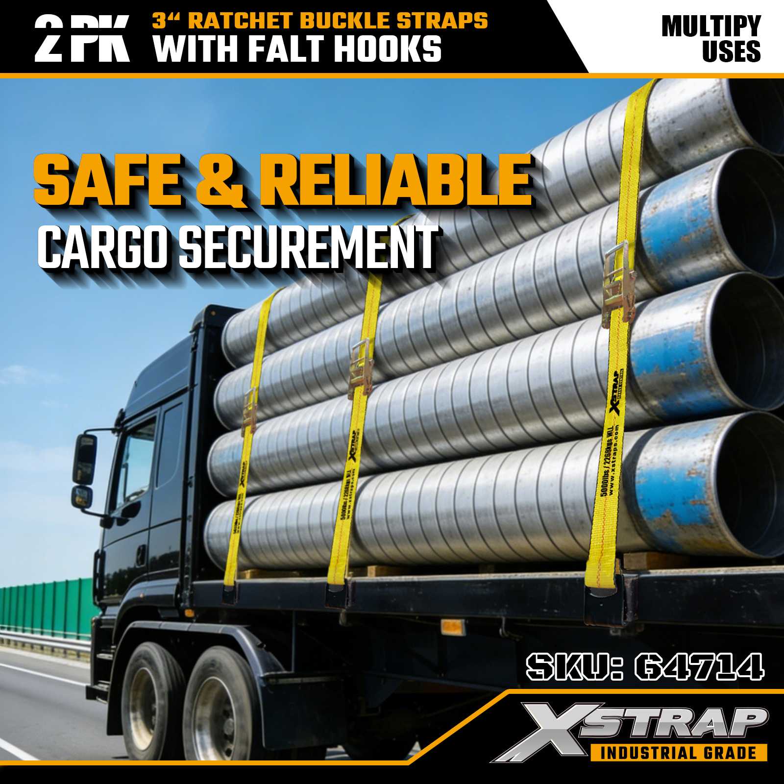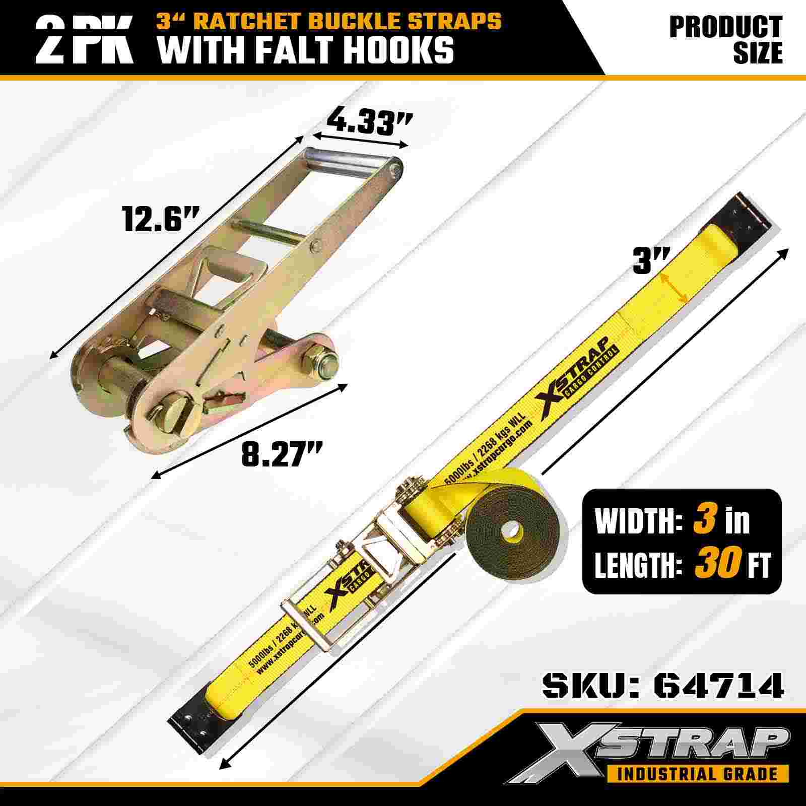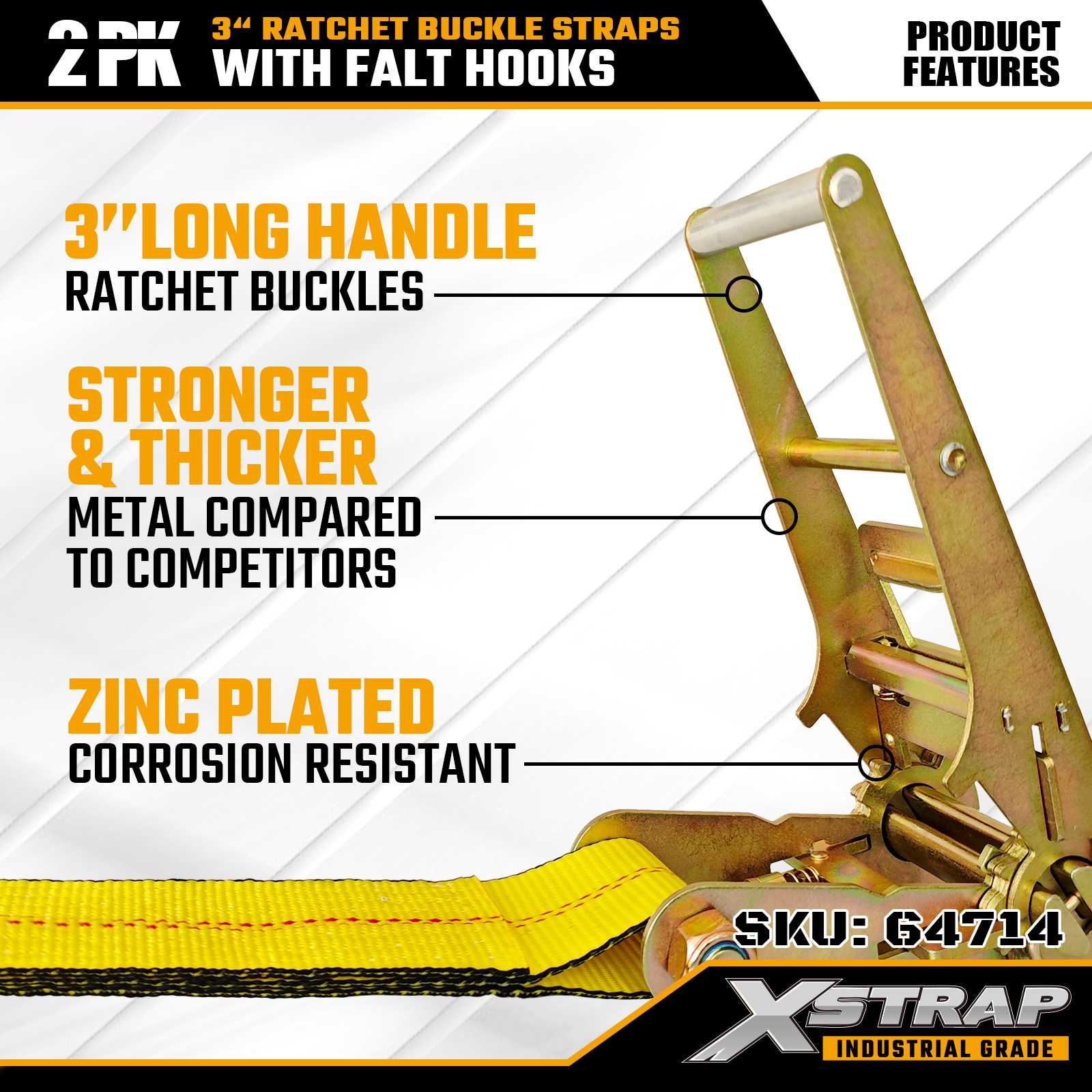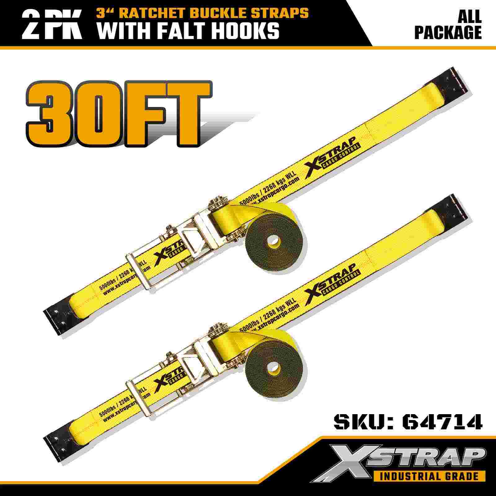 Xstrap 64714 3" x 30ft ratelgespriemen (2-pack) - Platte haken, 5.000 lbs laadvermogen, 15.000 lbs breeksterkte. Deze heavy-duty riemen zijn ontworpen voor professionele ladingscontrole en bieden een groter bereik en dual-pack-gemak voor vrachtwagens, aanhangwagens en industrieel transport.