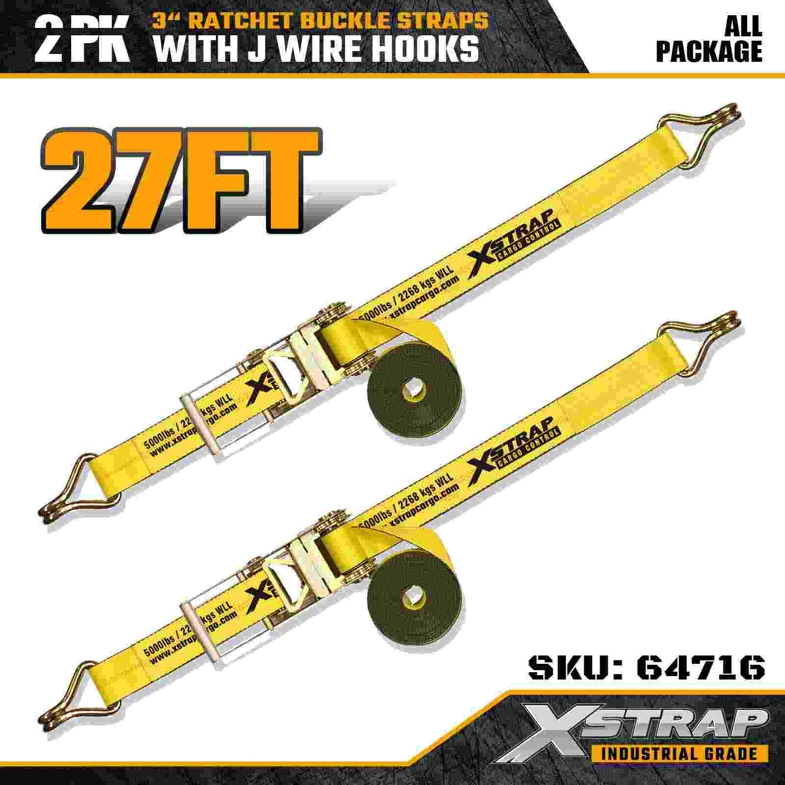 Xstrap 64716 3" x 27ft ratelgespriemen (2-pack) zijn ontworpen voor professionele ladingzekering, met zeer sterke draadhaken en een duurzaam ratelmechanisme. Met een werklastlimiet van 5.000 lbs en een breeksterkte van 15.000 lbs leveren deze riemen betrouwbare prestaties voor diepladers, transport van apparatuur en industriële transporttaken.