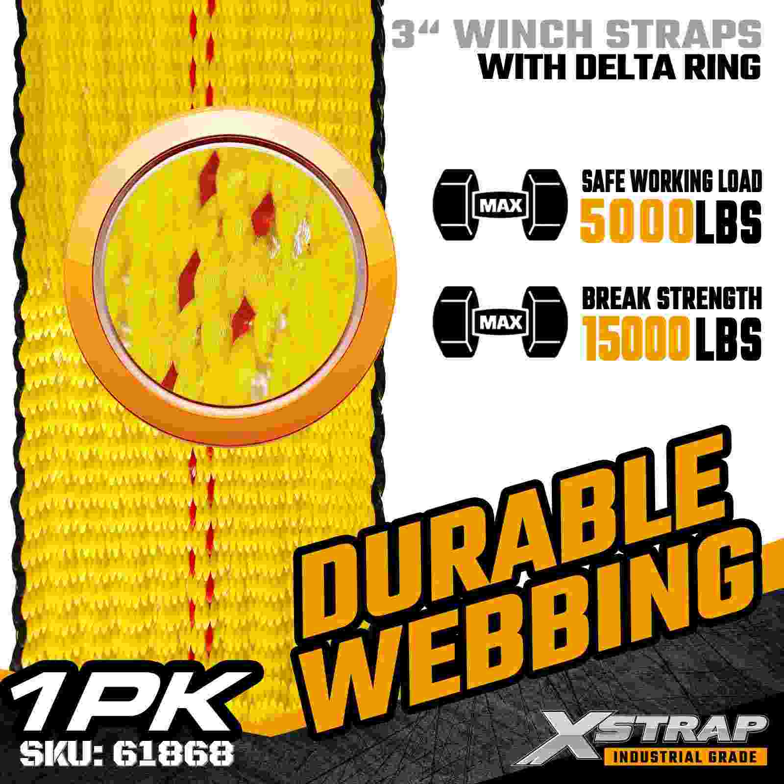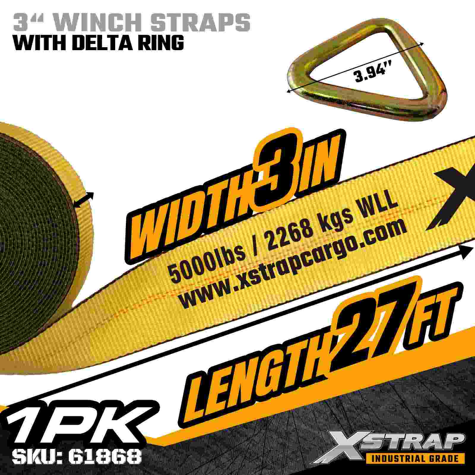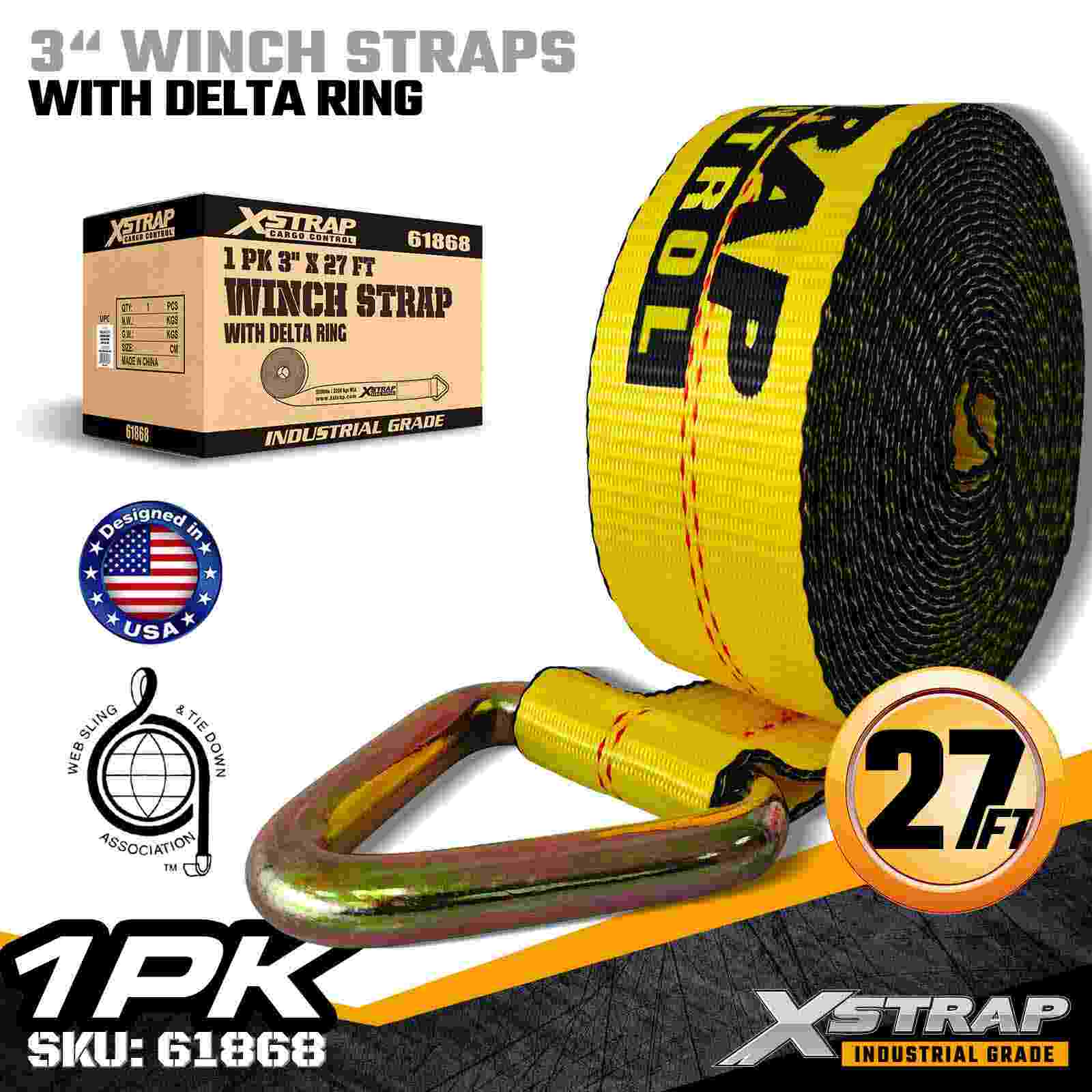 De Xstrap 61868 3" x 27ft standaard lierband is een oplossing voor het vastzetten van vracht voor zwaar gebruik, ontworpen voor diepladers en transport met hoge capaciteit. Deze 3 inch lierband is voorzien van een versterkte Delta-ring en een extra brede 3-inch polyester band en levert een werklastlimiet van 5.000 lbs en een breeksterkte van 15.000 lbs. Hij is ideaal voor het vastzetten van extra grote ladingen zoals timmerhout, staal, machines en industriële goederen. vracht tijdens veeleisende transportwerkzaamheden.