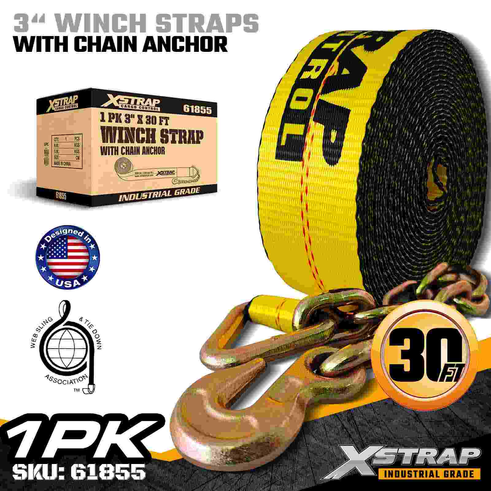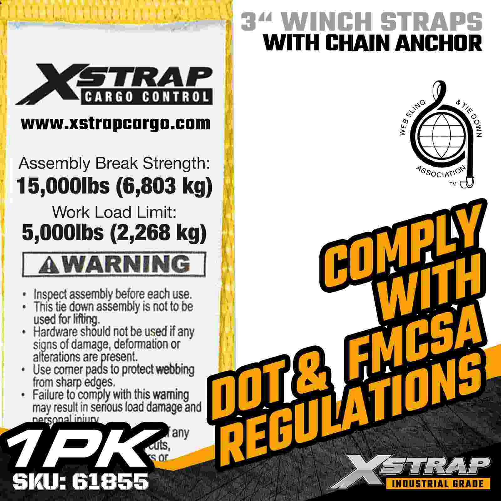 De Xstrap 61855 3" x 30ft standaard lierband is een heavy-duty industriële ladingbevestigingsband ontworpen voor diepladers en extra grote vracht. Uitgerust met een gesmeed kettinganker en extra brede 3-inch polyester band, levert deze 3 inch lierband een werklastlimiet van 5.000 lbs en een breeksterkte van 15.000 lbs. De verlengde lengte van 9 meter maakt hem ideaal voor het vastzetten van bredere, hogere of onregelmatig gevormde lasten die extra bereik en stabiliteit vereisen.