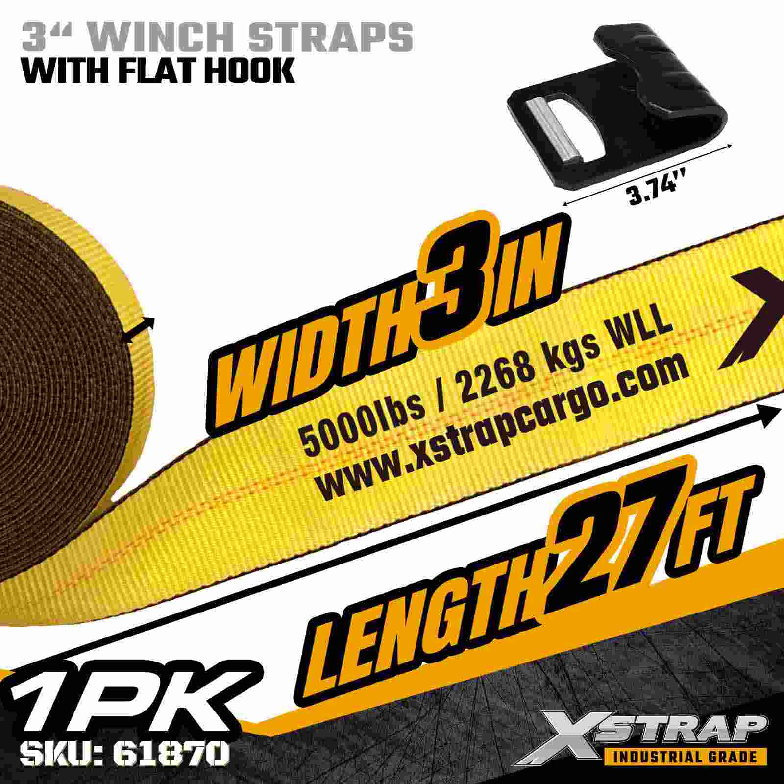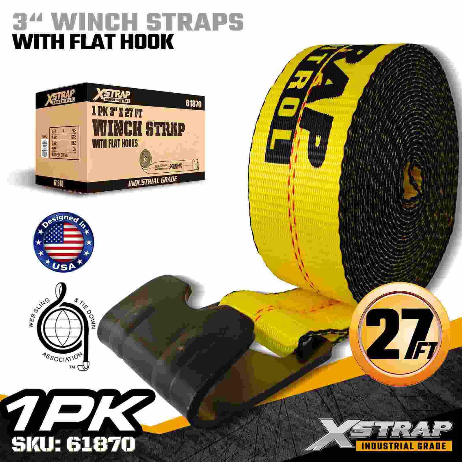 De Xstrap 61870 3" x 27ft standaard lierband is een heavy-duty vrachtbevestigingsband ontworpen voor diepladers en transport met hoge capaciteit. Deze 3 inch lierband is voorzien van een versterkte platte haak en een extra brede 3-inch polyester band en levert een werklastlimiet van 5.000 lbs en een breeksterkte van 15.000 lbs. Hij is ideaal voor het vastzetten van hout, staal, machines en industriële vracht tijdens veeleisend transport. operaties.
