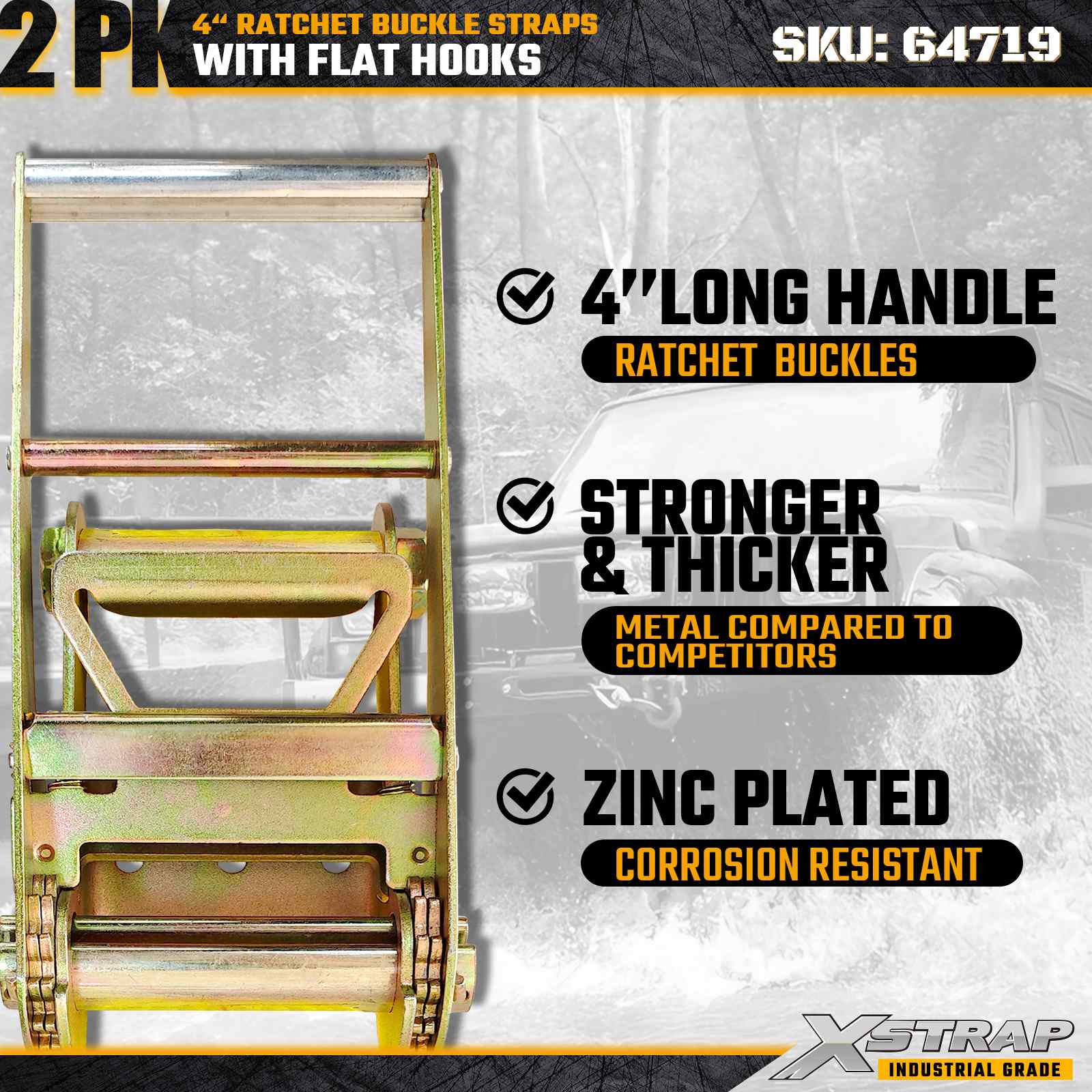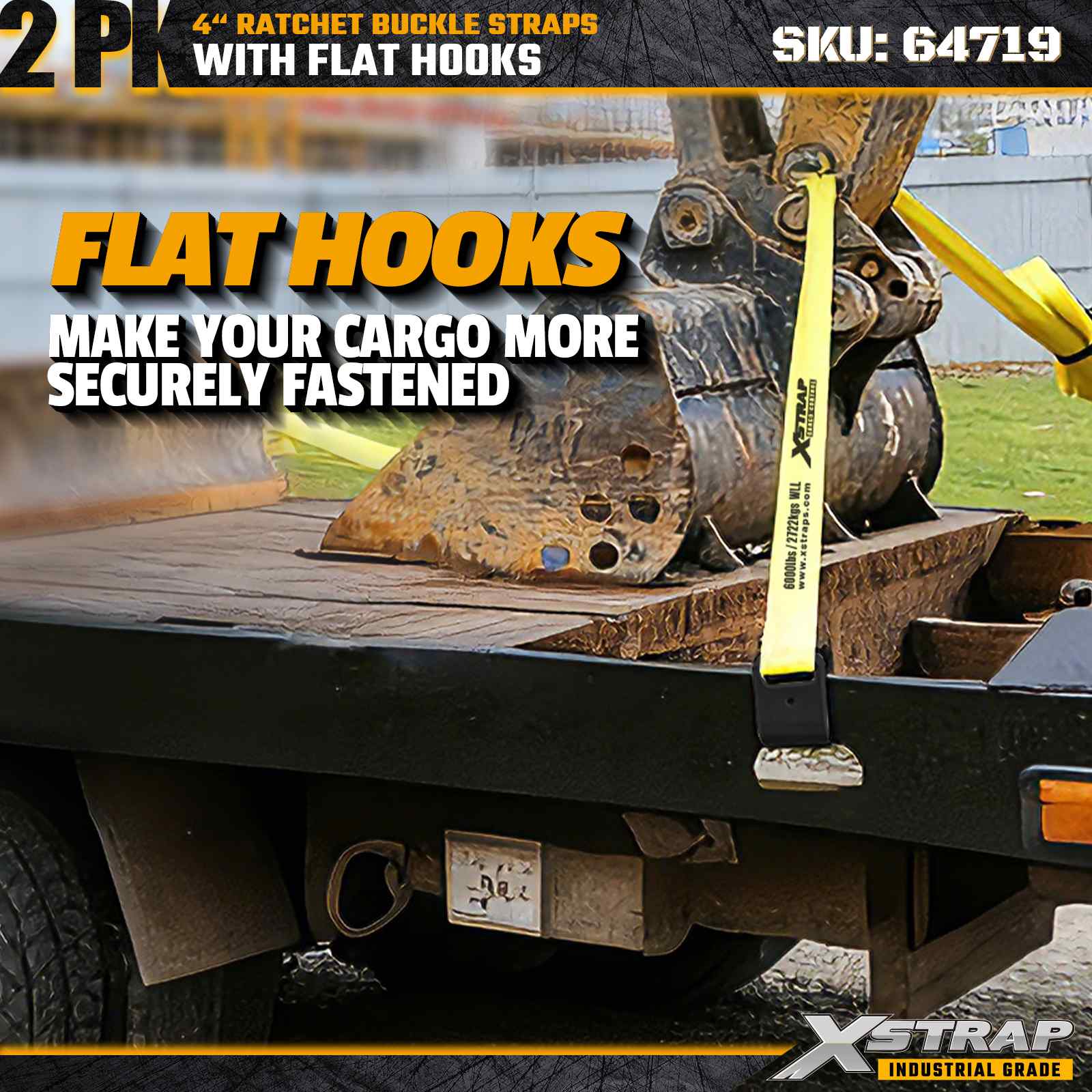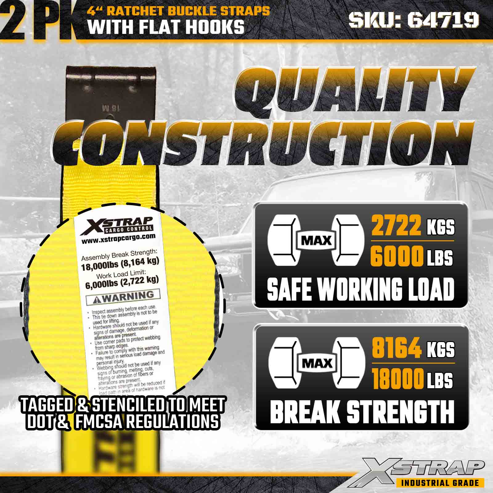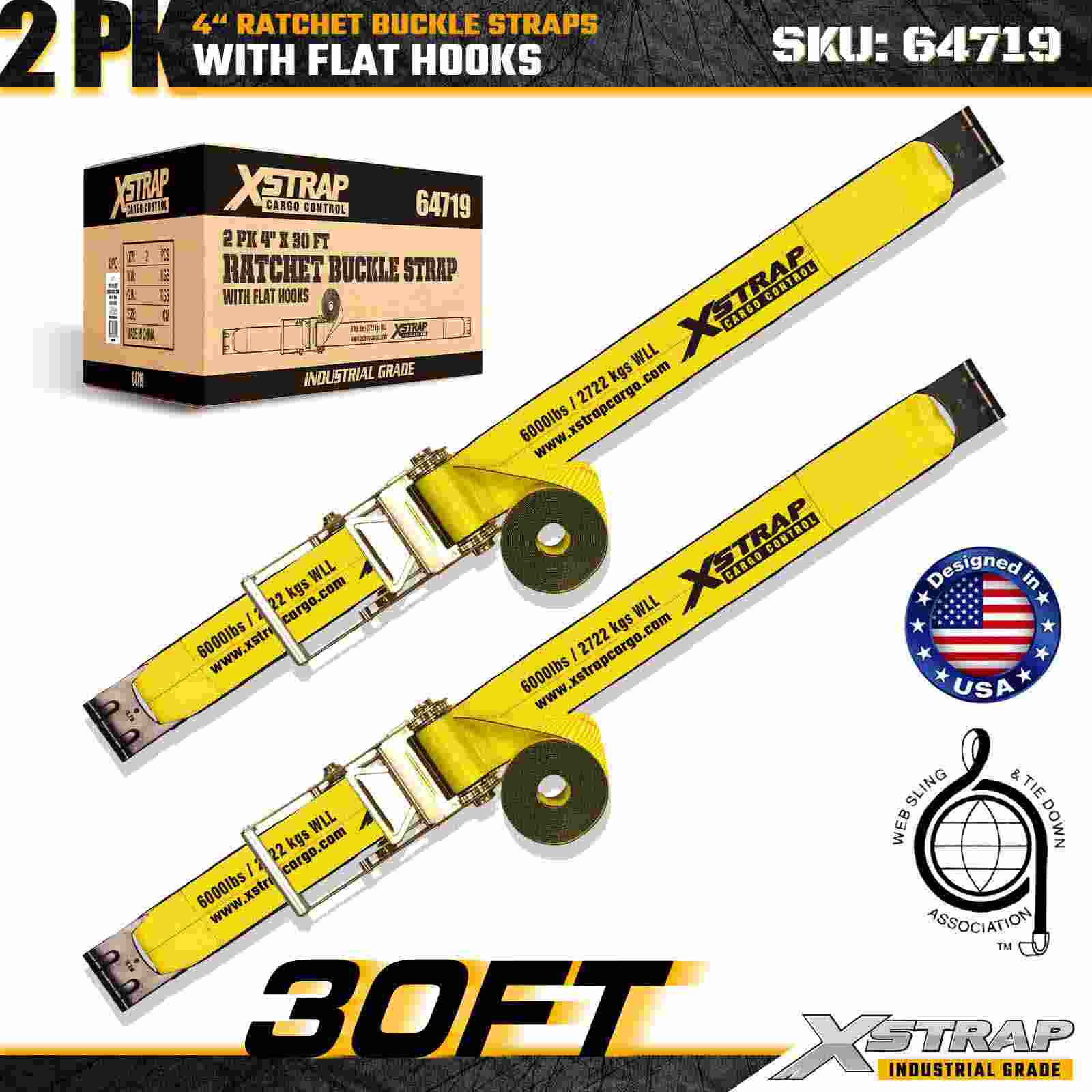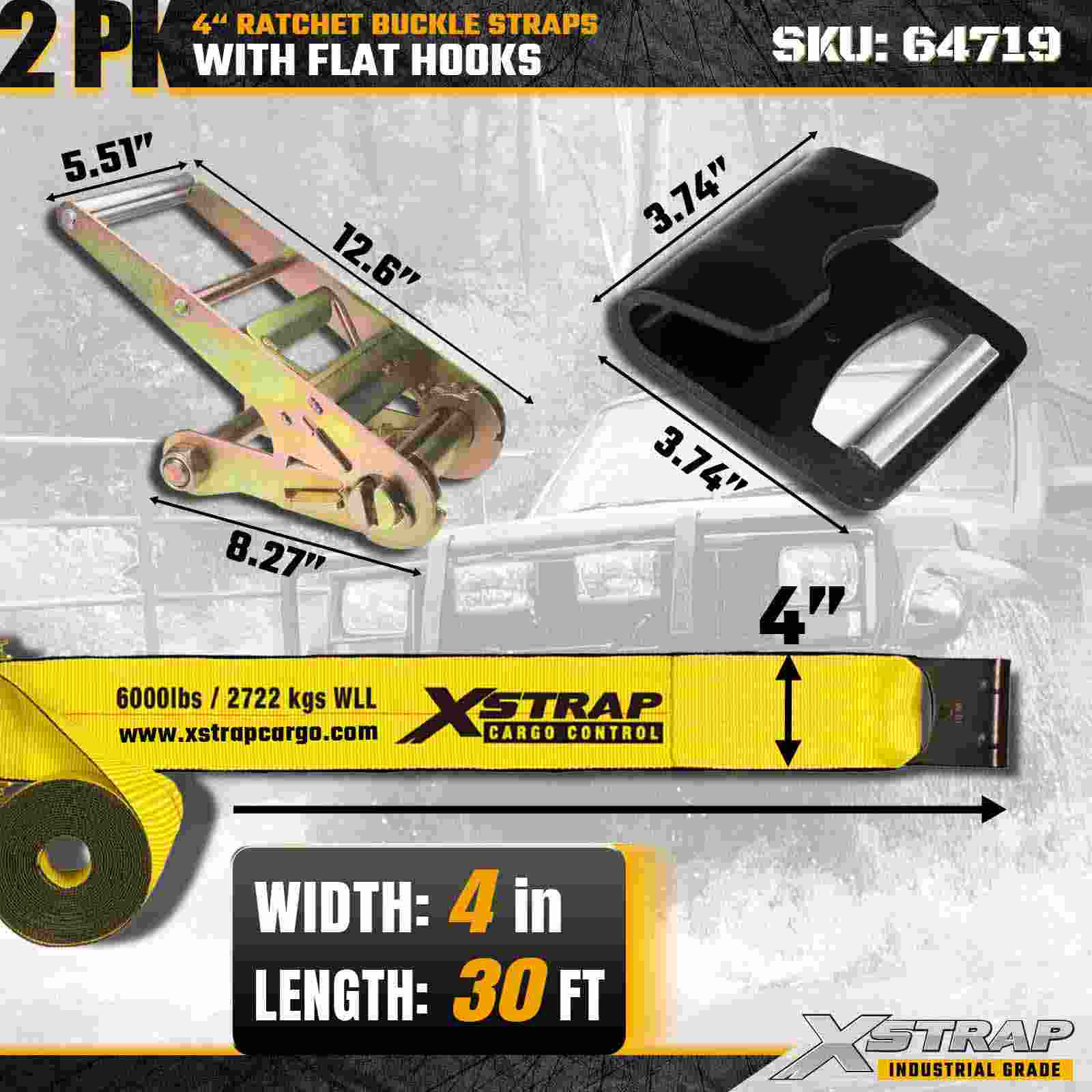 De Xstrap 64719 4" x 30ft ratelgespriemen (2-pack) zorgen voor een stevige ladingzekering met versterkte platte haken en een duurzaam ratelmechanisme. Ze hebben een draagkracht van 6.000 lbs WLL en 18.000 lbs breeksterkte en zijn ideaal voor het vervoeren van diepladers, machinetransport en industriële vrachttoepassingen.