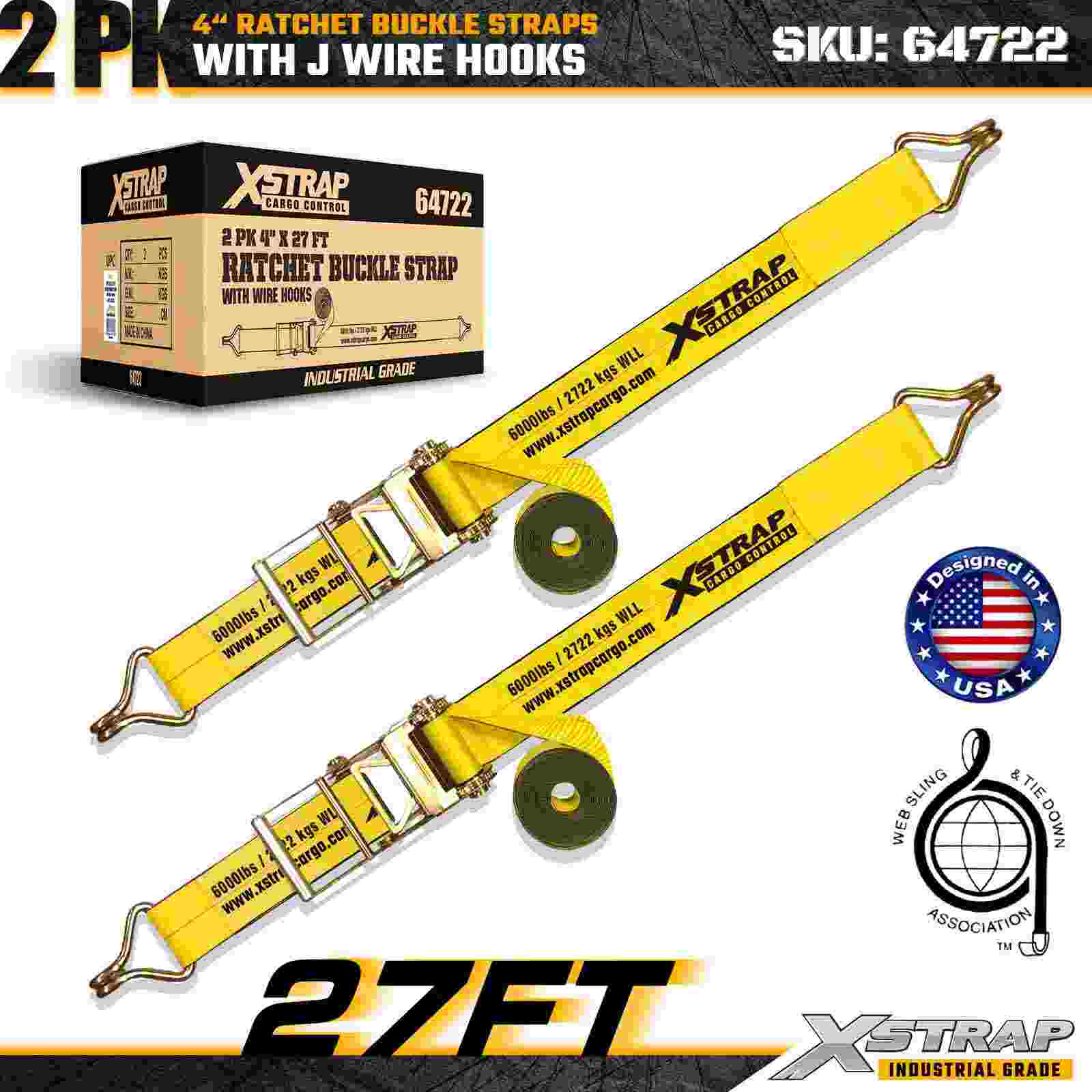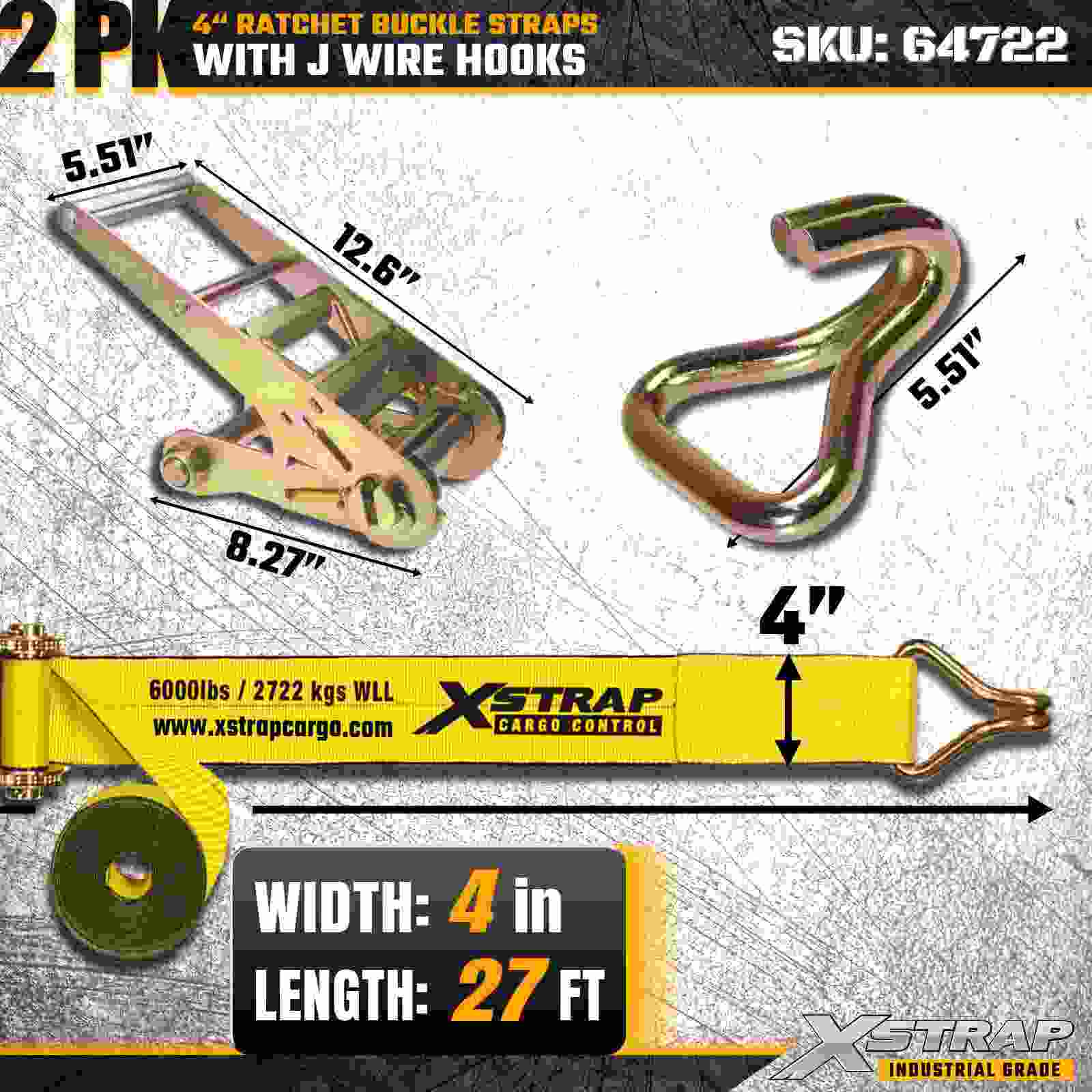 De Xstrap 64722 4" x 27ft ratelgespriemen (2-pack) zijn ontworpen voor het vastzetten van zware ladingen, met versterkte draadhaken en een duurzaam ratelmechanisme. Met een werklastlimiet van 6.000 lbs en een breeksterkte van 18.000 lbs zijn deze riemen ideaal voor het vervoeren van diepladers, machinetransport, timmerhout, stalen lasten en industriële vrachttoepassingen.