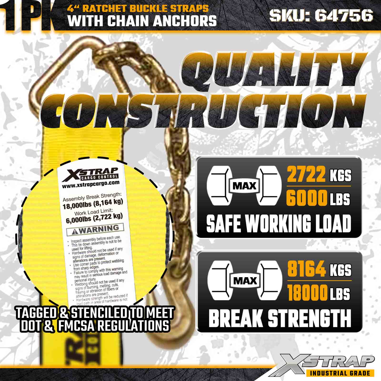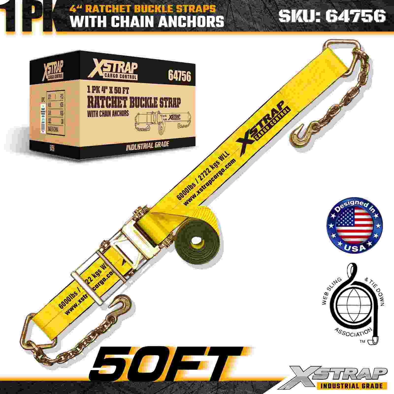De Xstrap 64756 4" x 50ft ratelgespriem (1-pack) is ontworpen voor het vastzetten van lading onder extreme omstandigheden, met robuuste kettingankers en een versterkt ratelmechanisme. Met een werklastlimiet van 6.000 lbs en een breeksterkte van 18.000 lbs is deze extralange band is ideaal voor extra grote ladingen, machinetransport, staalvervoer en industriële logistiek die een maximaal bereik en maximale betrouwbaarheid vereisen.