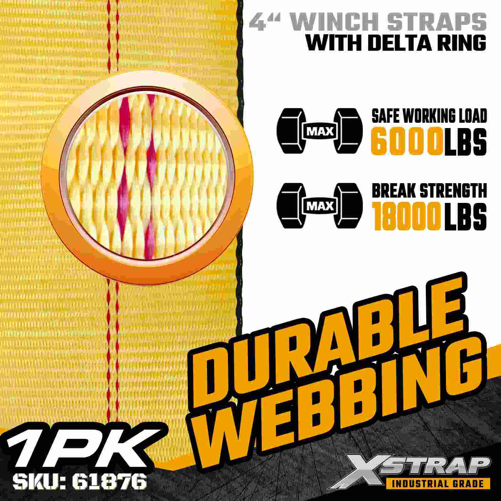 De Xstrap 61876 4" x 27ft standaard lierband is een premium heavy-duty vrachtbevestigingsband ontworpen voor diepladers en industrieel transport. Deze 4" lierband is voorzien van een versterkte Delta-ring en een ultrabrede 4-inch polyester band en levert een werklastlimiet van 6.000 lbs en een breeksterkte van 18.000 lbs. Het Delta Ring-ontwerp biedt multi-directionele ladingaangrijping, waardoor hij ideaal is voor het vastzetten van complexe of oneffen vracht die vereist verbeterde stabiliteit en flexibele verankering.