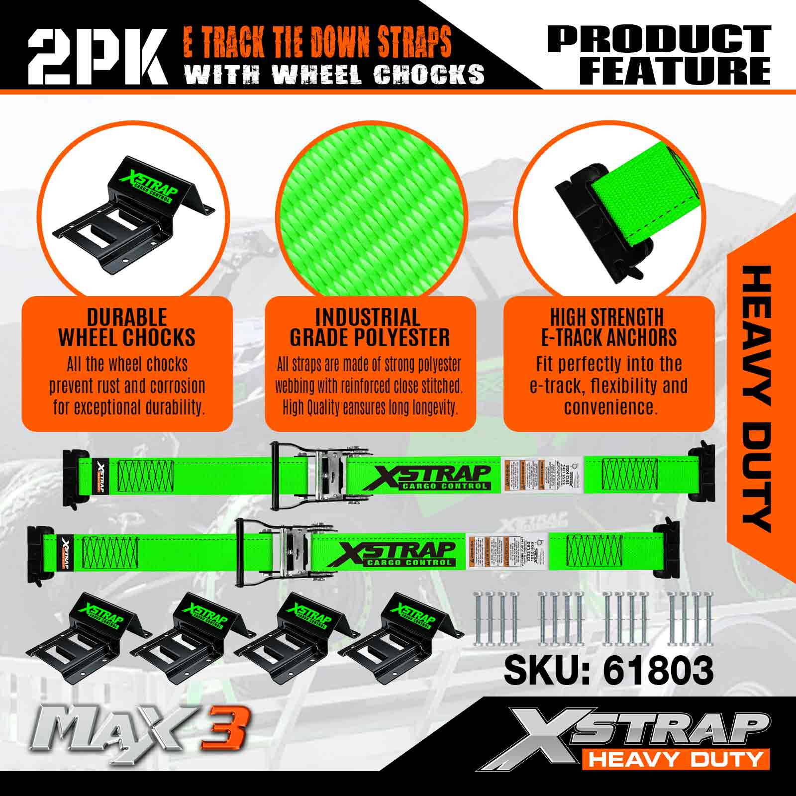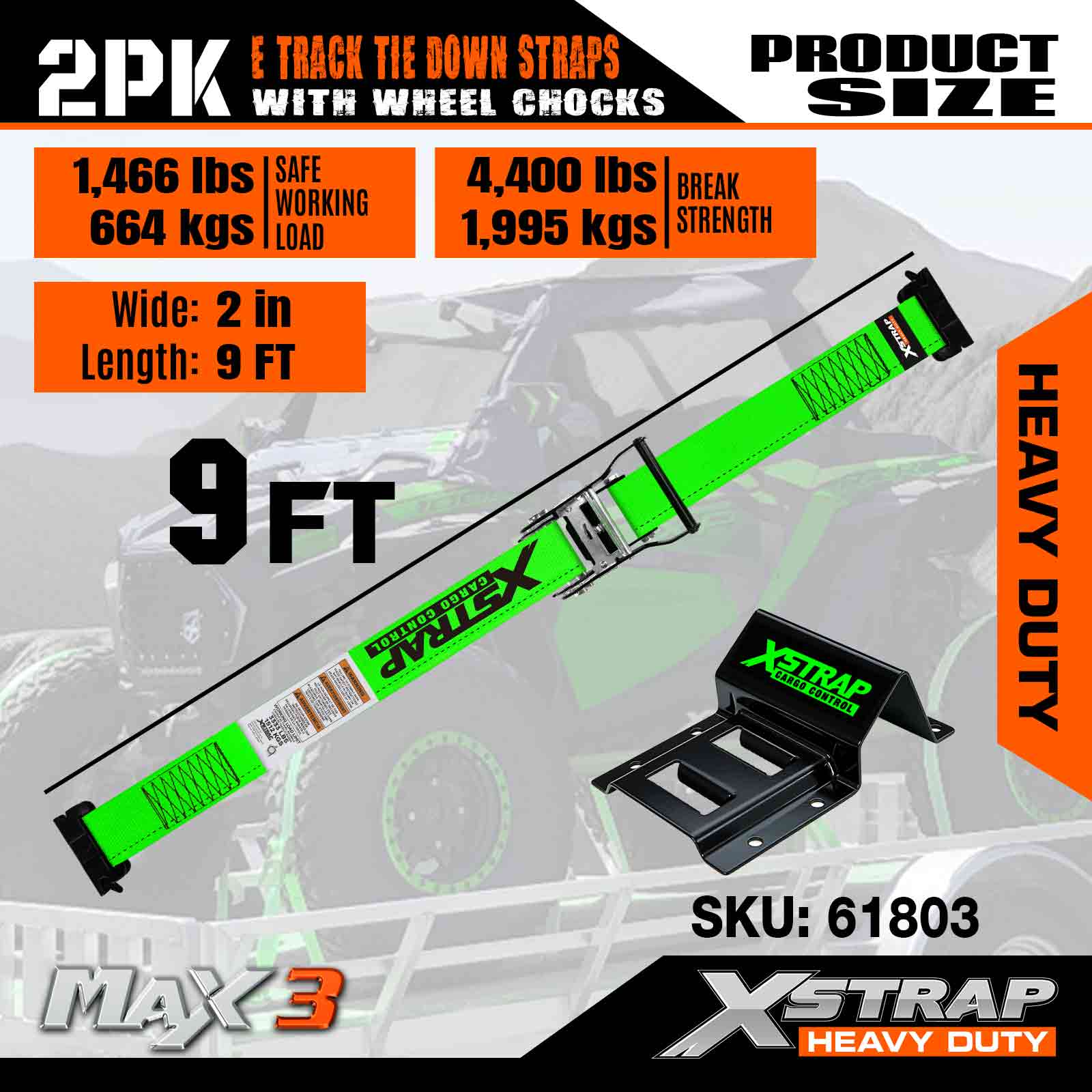 Xstrap E-Track wielblokbevestigingsset, 2 inch * 9 ft zware riemen voor autotrailer UTV ATV, ratelbevestigingen met bandenriemen (2 stuks)