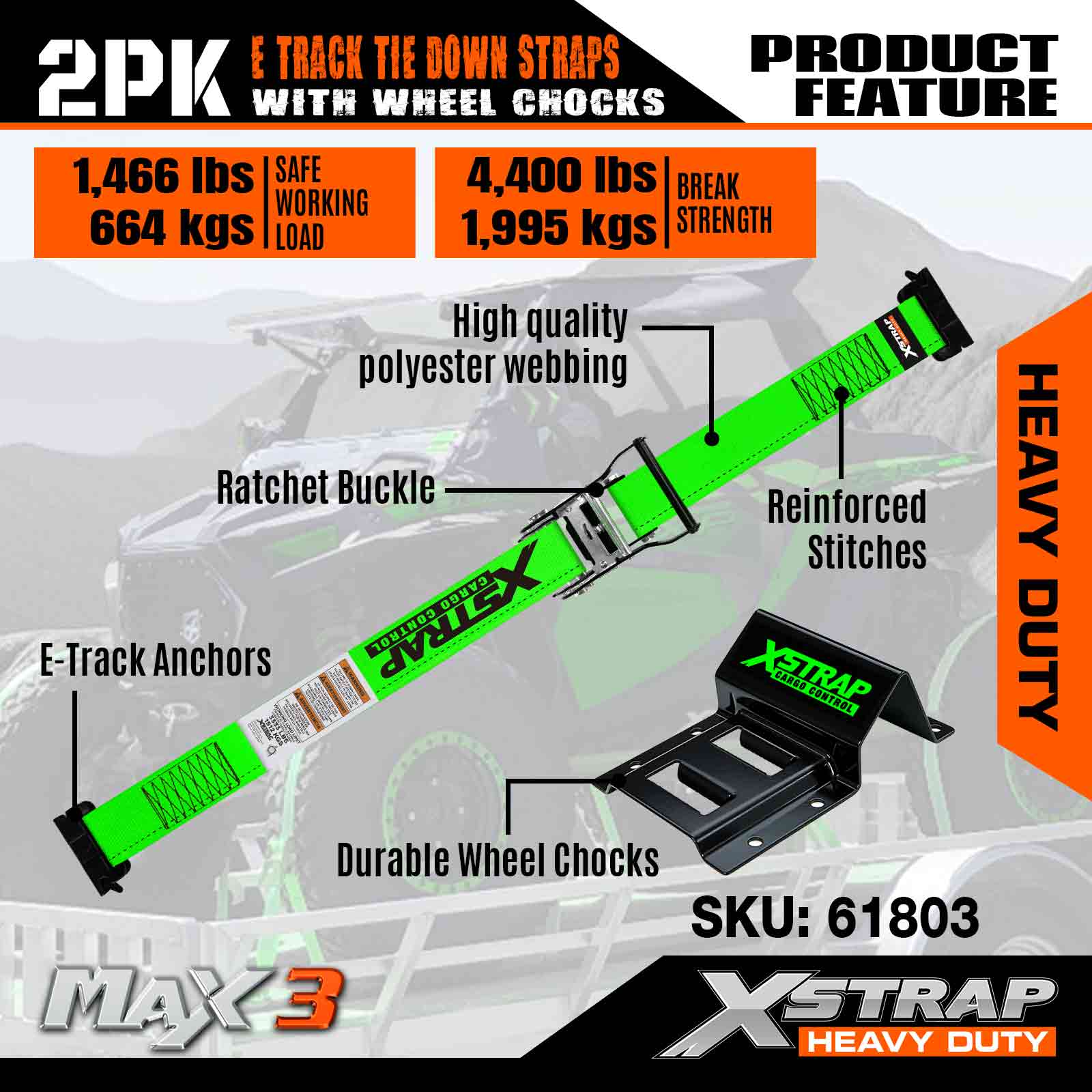 - Moeiteloze installatie - Rijd gewoon met uw ATV over de op de vloer geïnstalleerde blokken totdat de banden er goed tussen passen. Wikkel vervolgens de E-Track-riemen om de banden en klik ze stevig vast in de E-Track-gleuven op de wielkeggen. Het is een eenvoudig proces dat zorgt voor een snelle en eenvoudige installatie voor het beveiligen van uw voertuig.