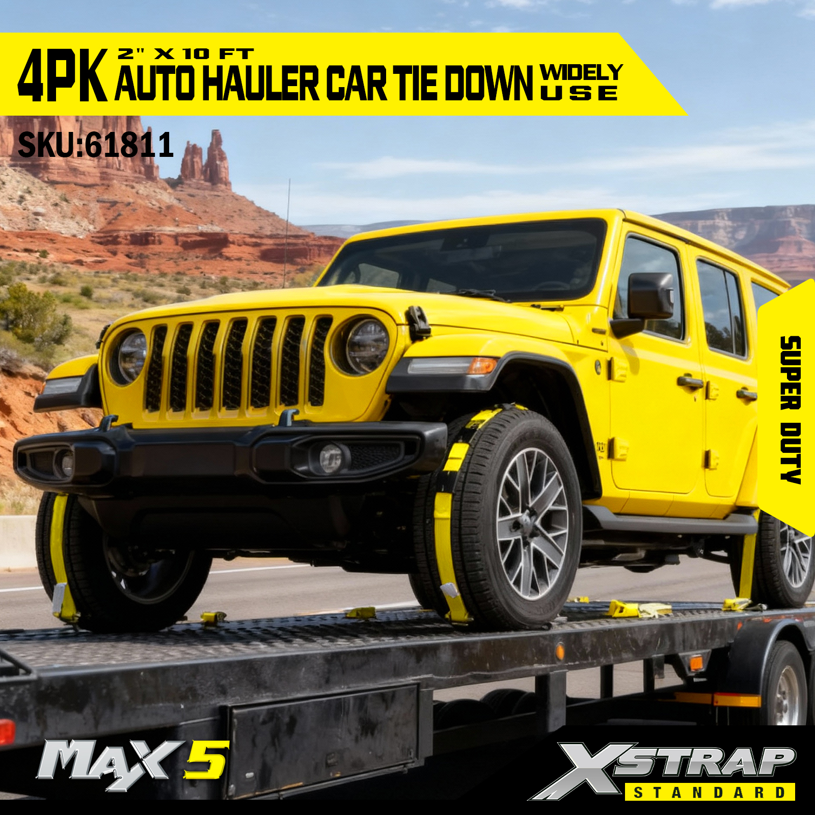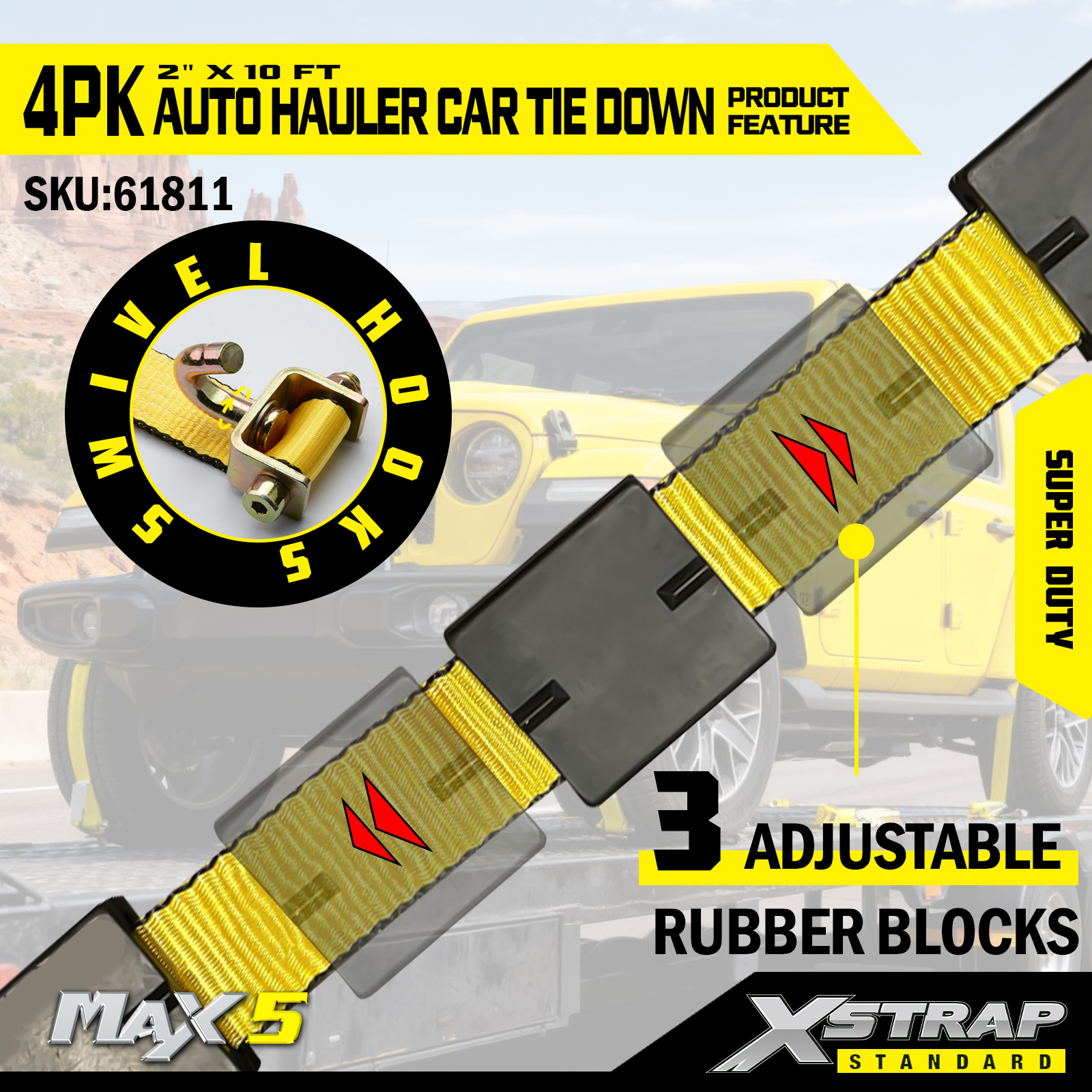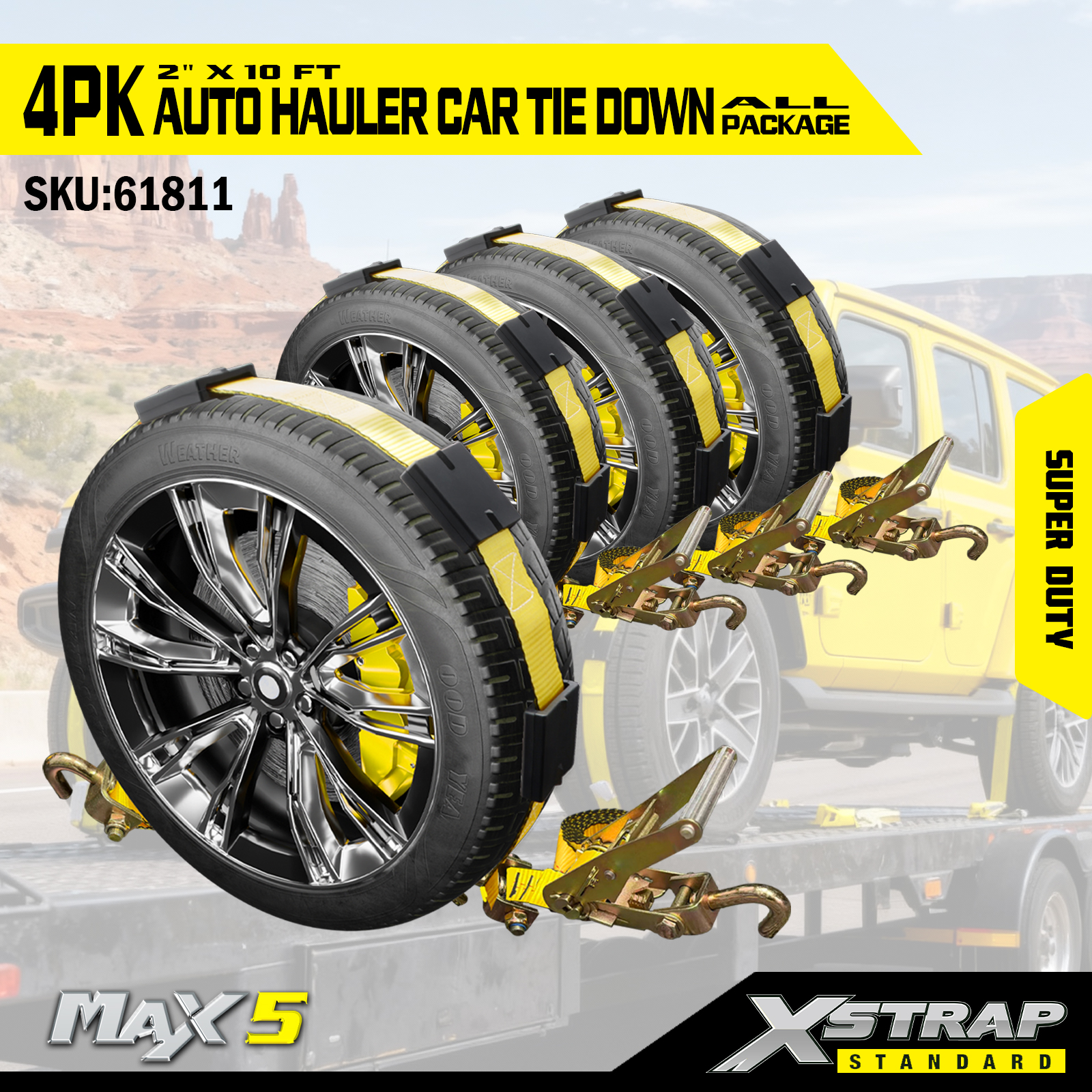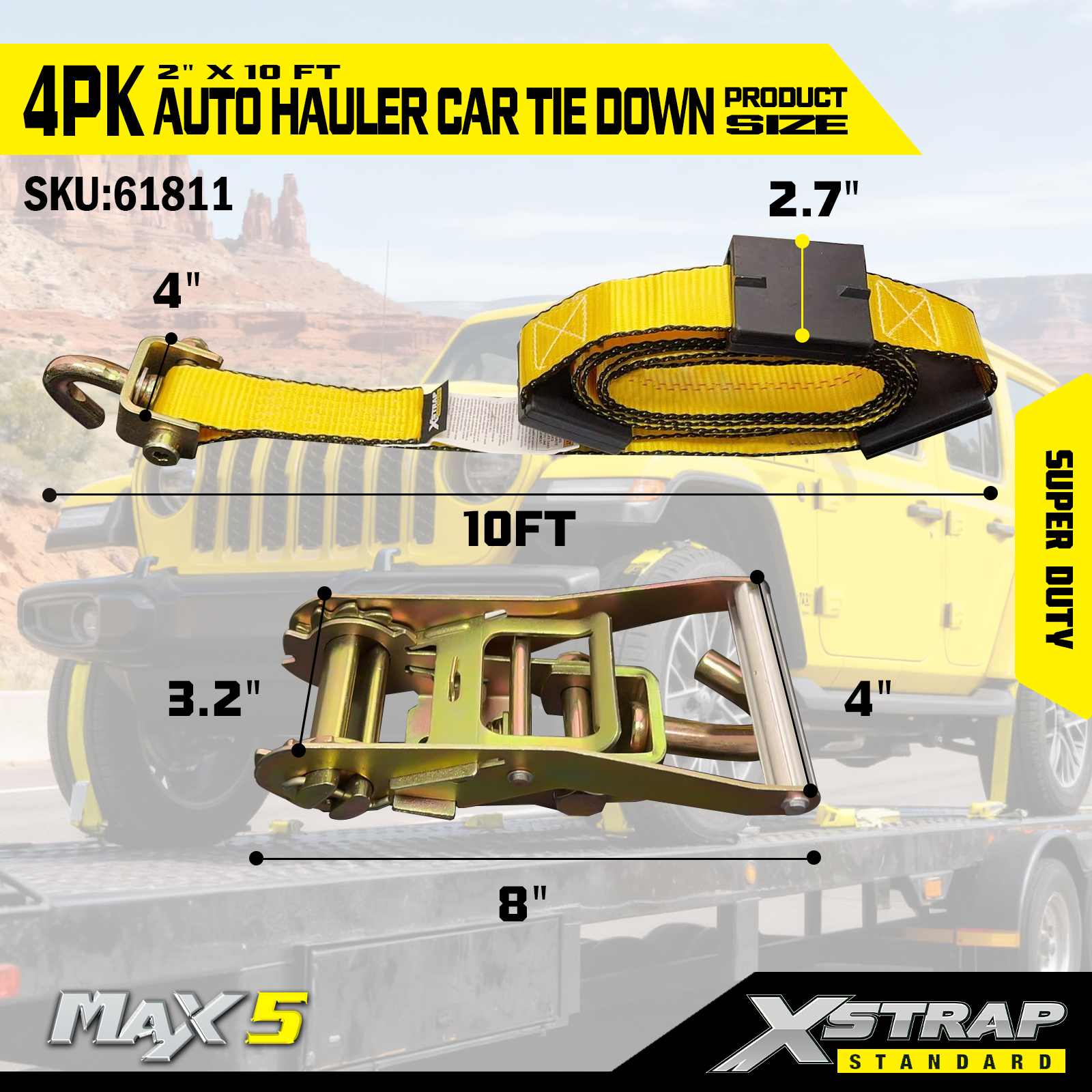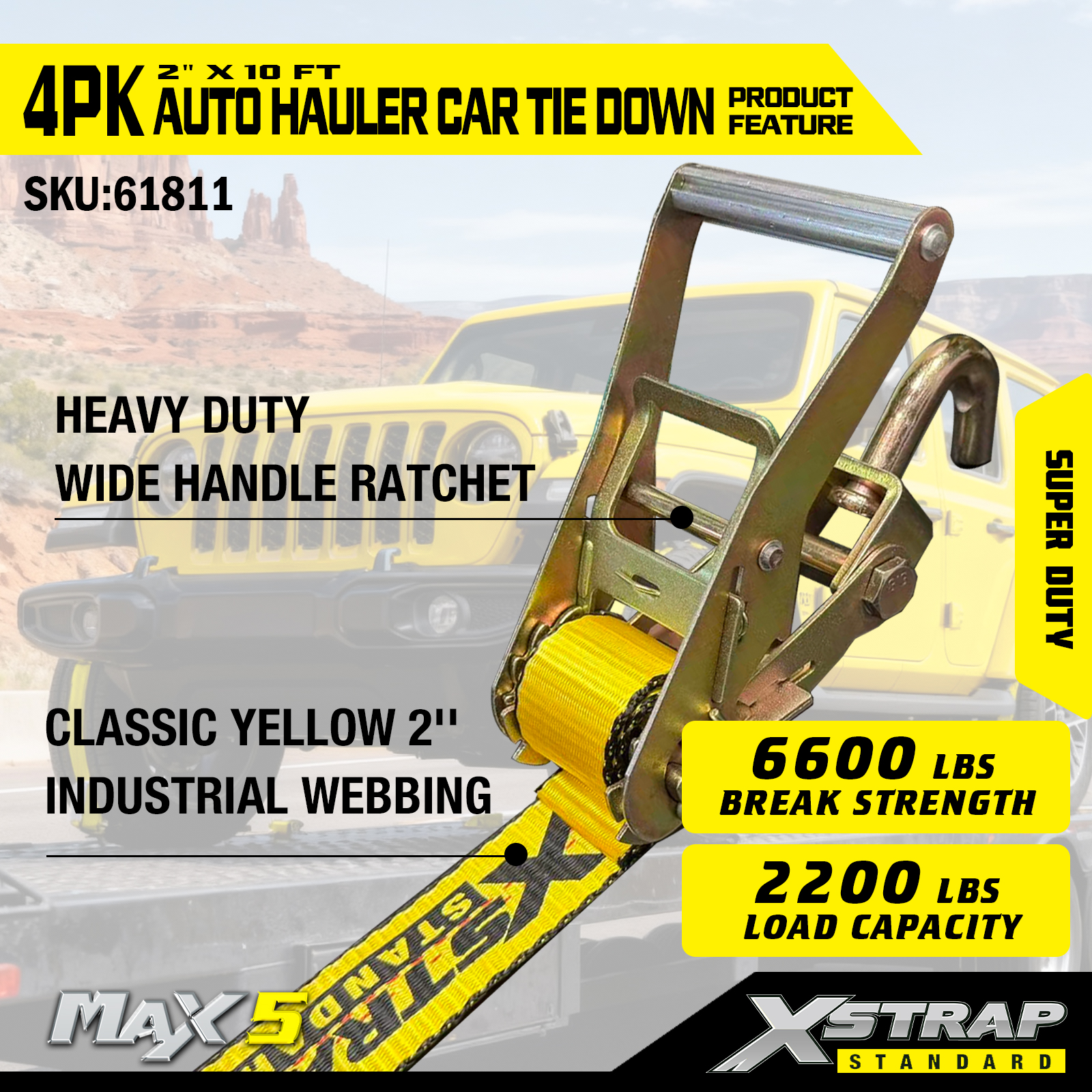 - Super Duty-prestaties: elke band heeft een veilige werklast van 2.200. De veilige werklast is op het waarschuwingslabel van elke spanband gestempeld voor eenvoudige inspectie, en is gebouwd om zware voertuigen en veeleisende transportscenario's te hanteren.