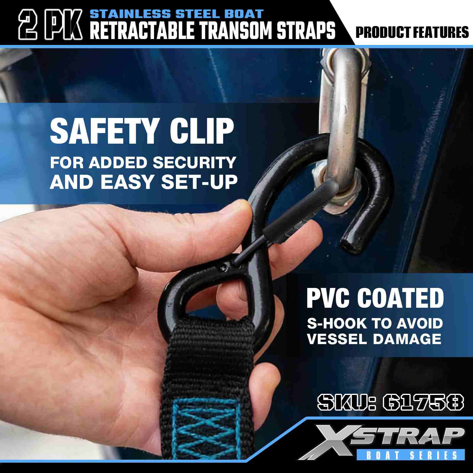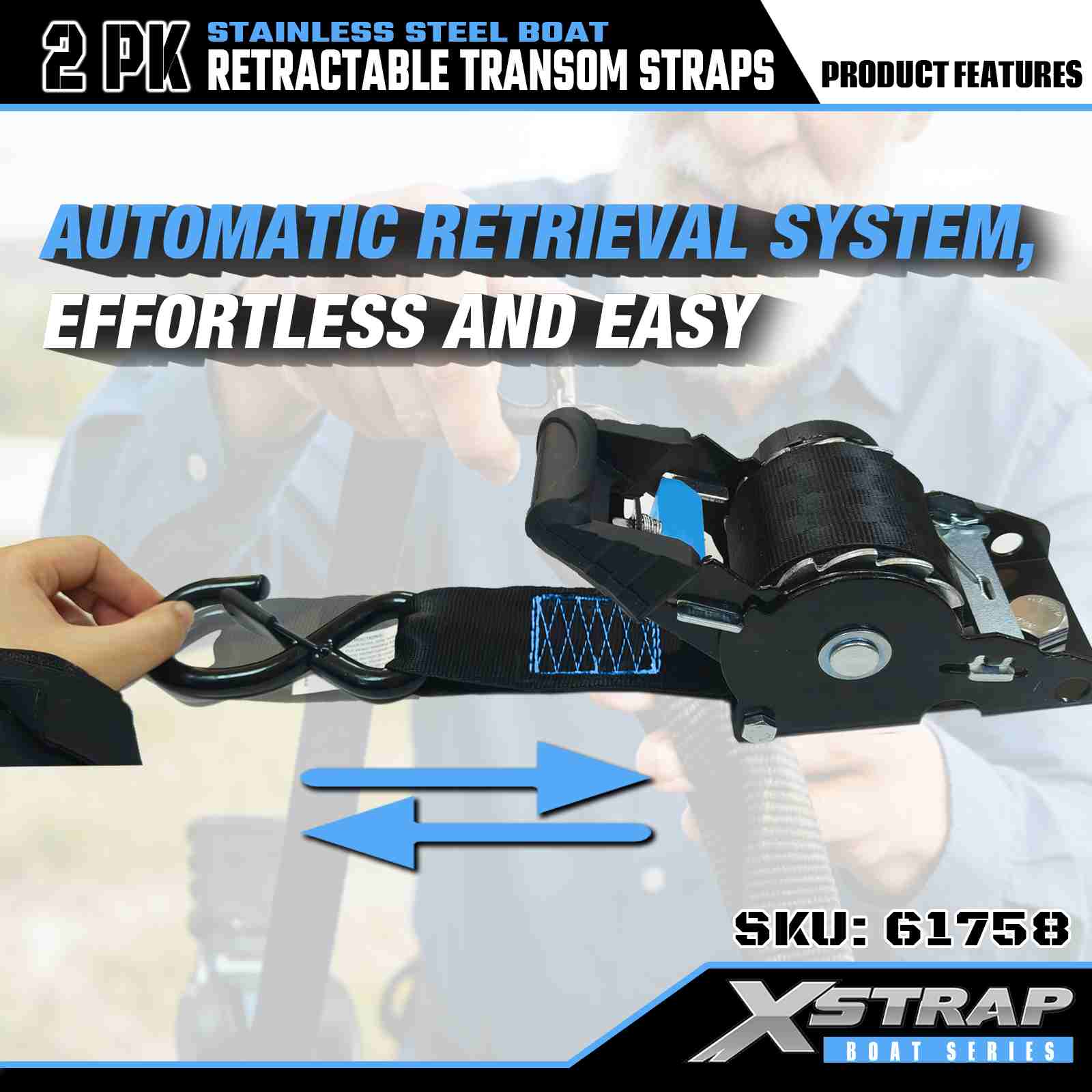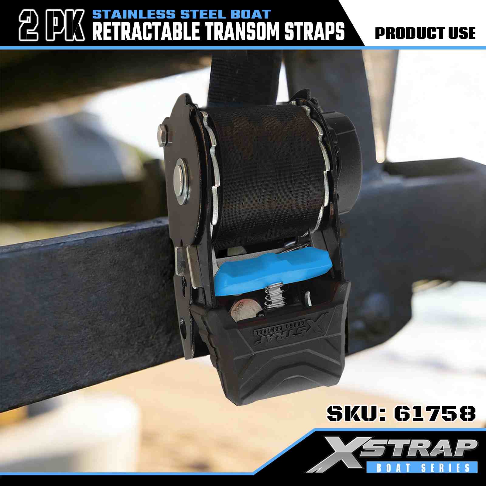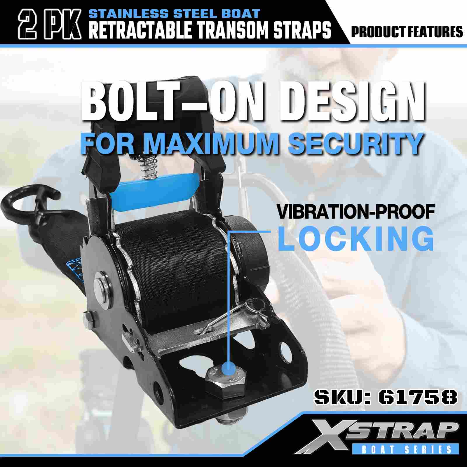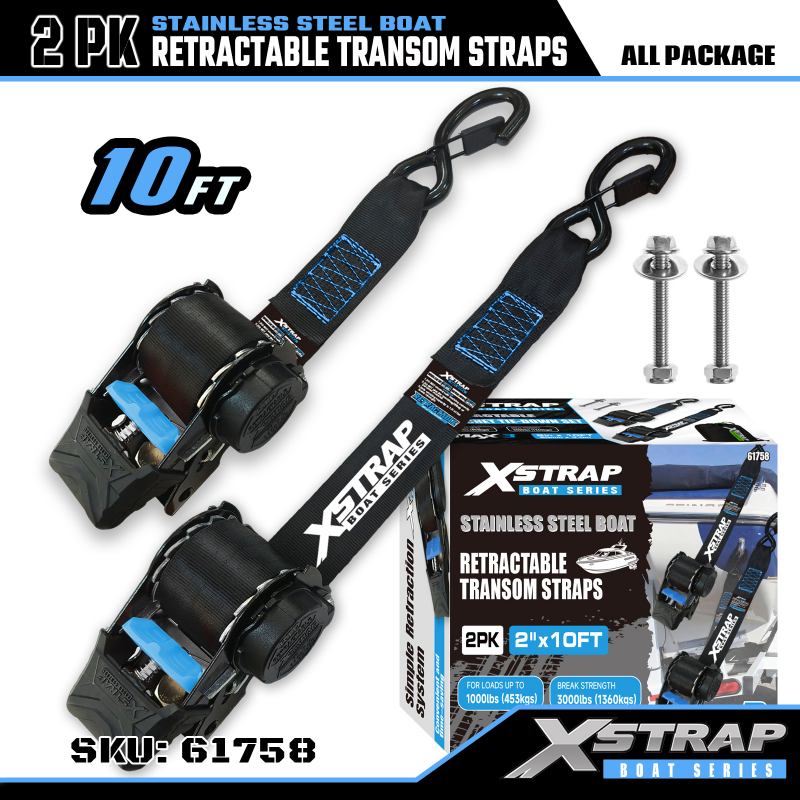 Xstrap 2PK boot intrekbare spiegelriem met veiligheids-S-haken, 2" x 3,6' polyester vastbindriem intrekbare riem, 1000 lbs capaciteit vrachtspanbanden met veiligheids-S-haak voor de serieuze professional om vrachttrailer, platbedtrailer, skiboot, kleine auto vast te zetten.