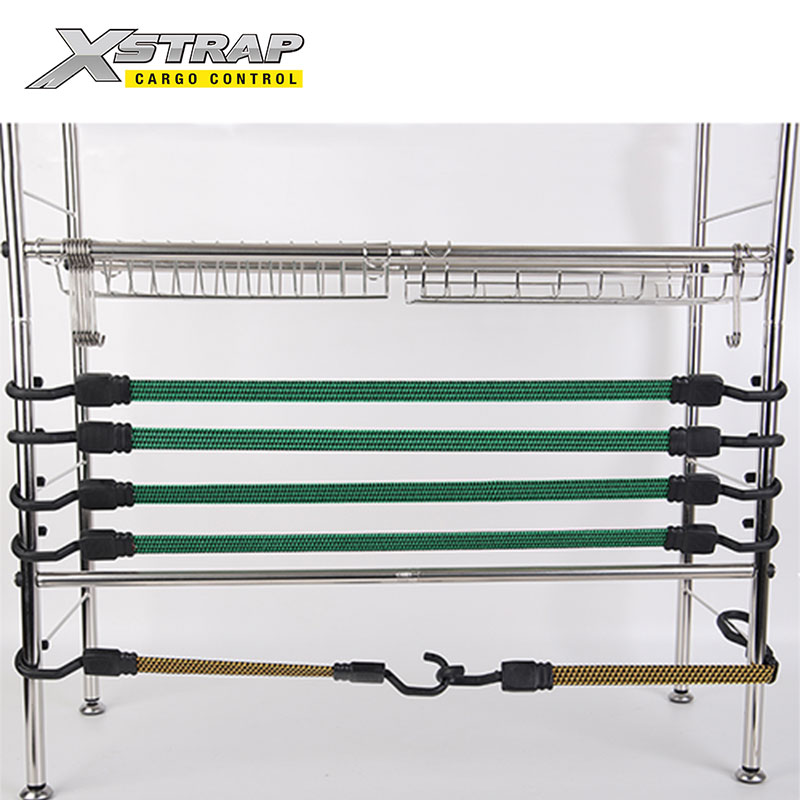 Dit zijn onze platte bungeekoorden met haken. Zwaar uitgevoerde platte bungeekoorden met haken worden gebruikt voor kamperen, rekdak, aanhangwagen en vrachtcontrole.