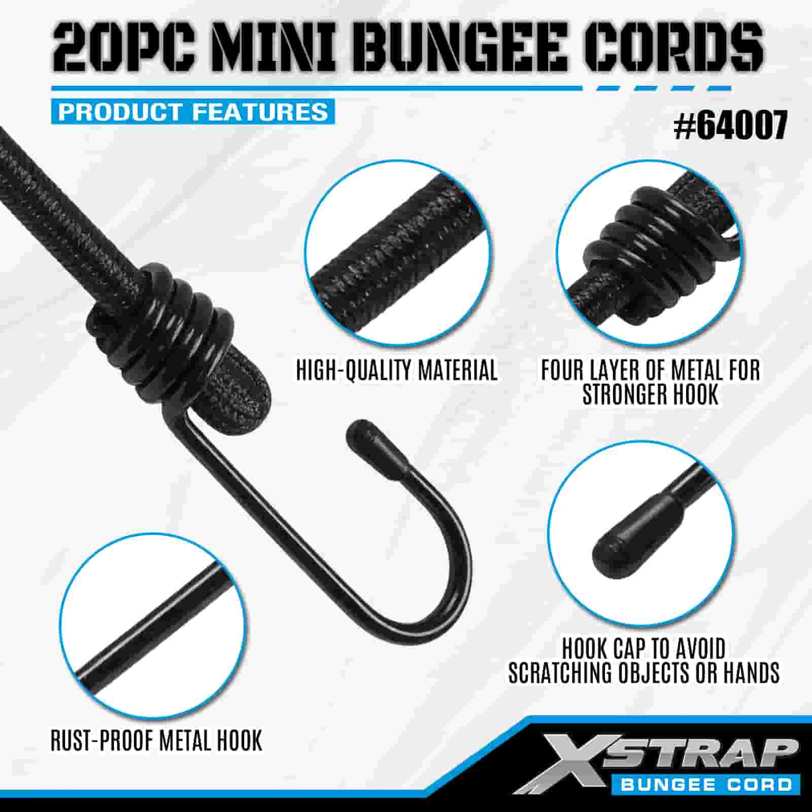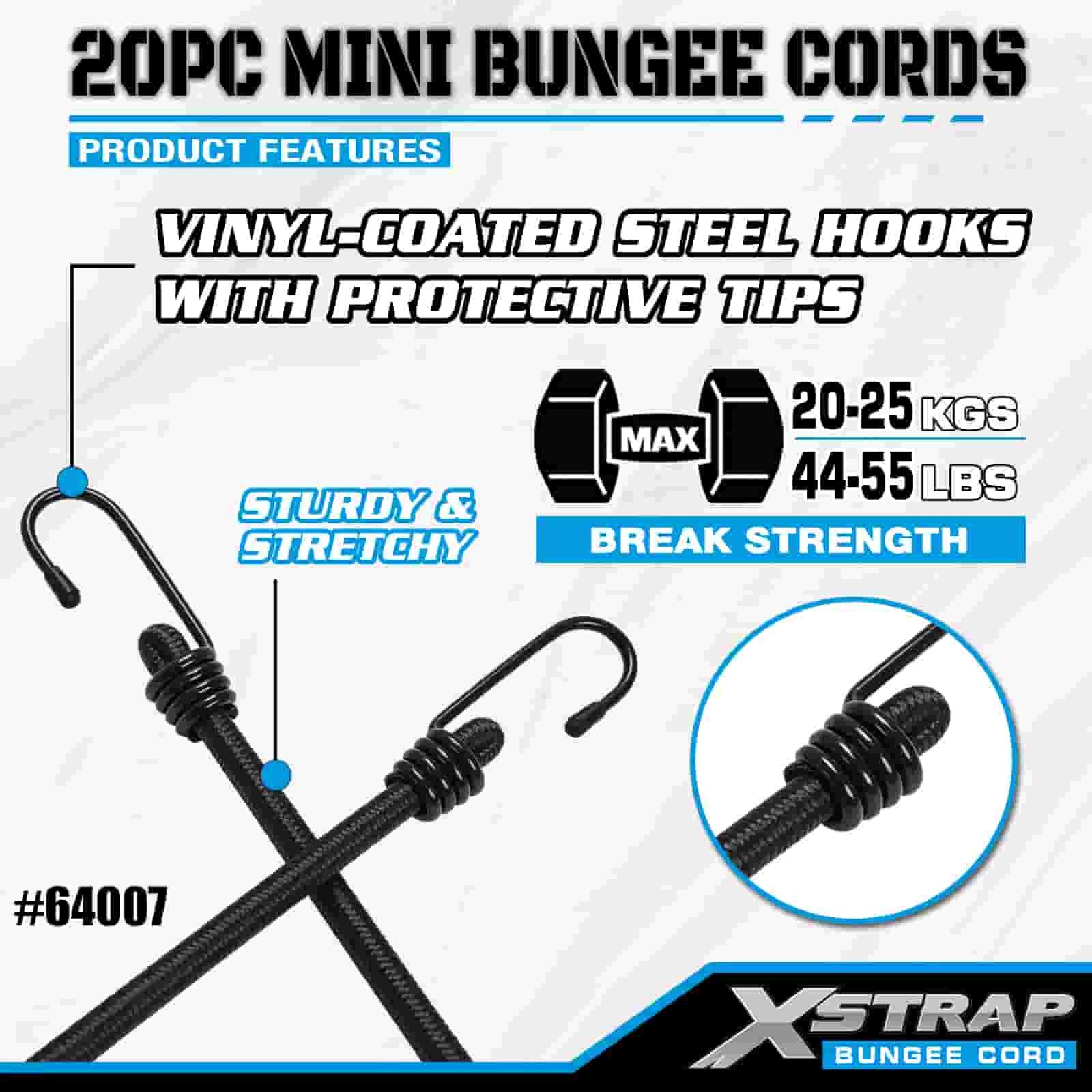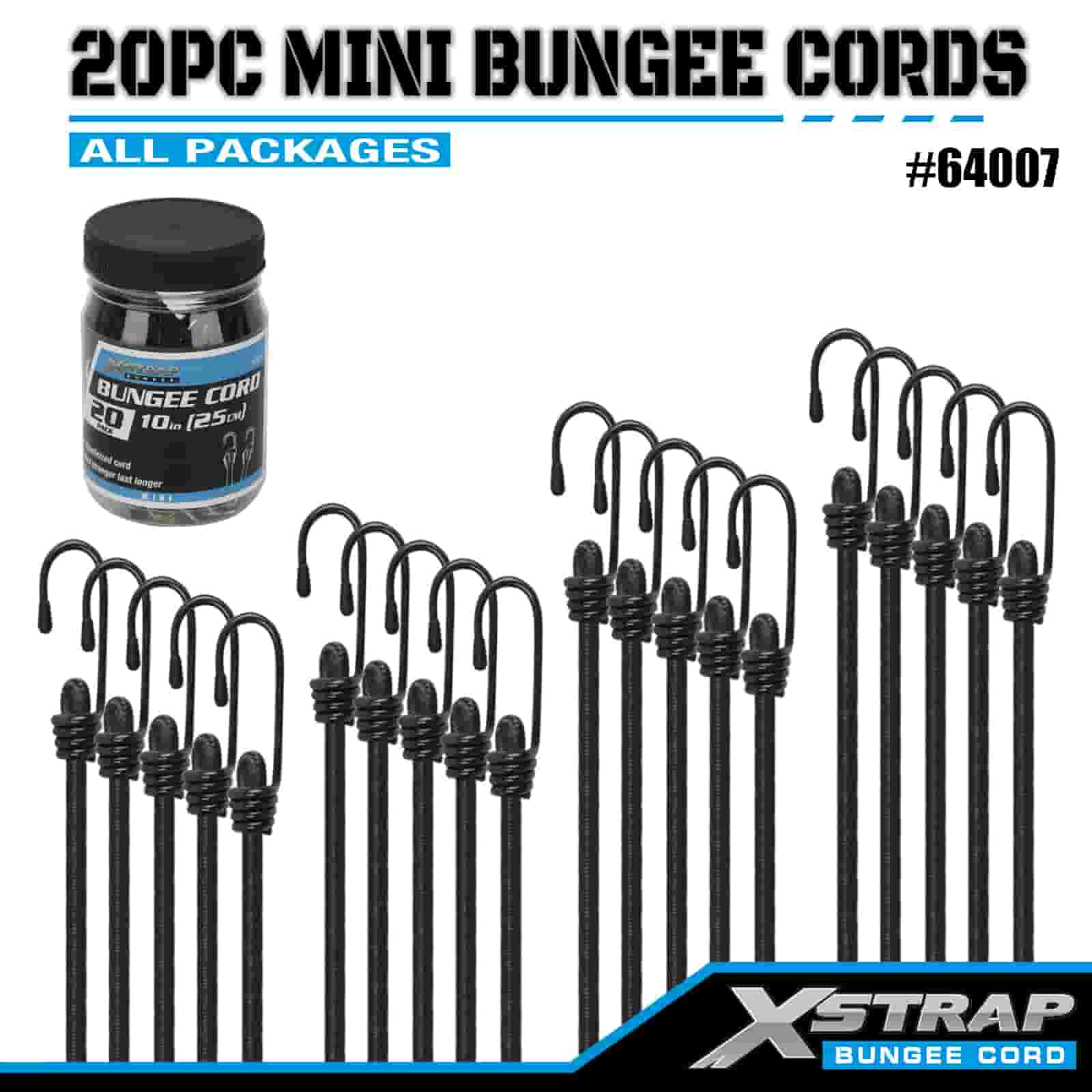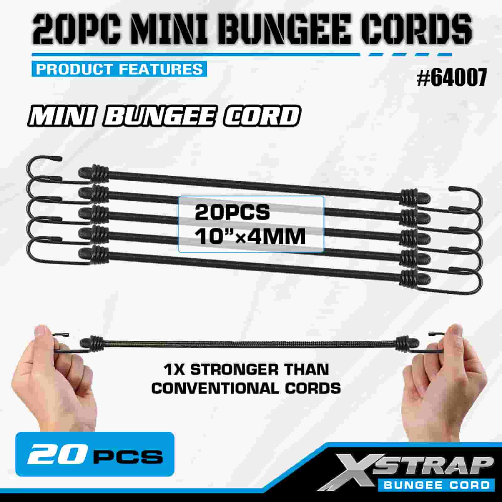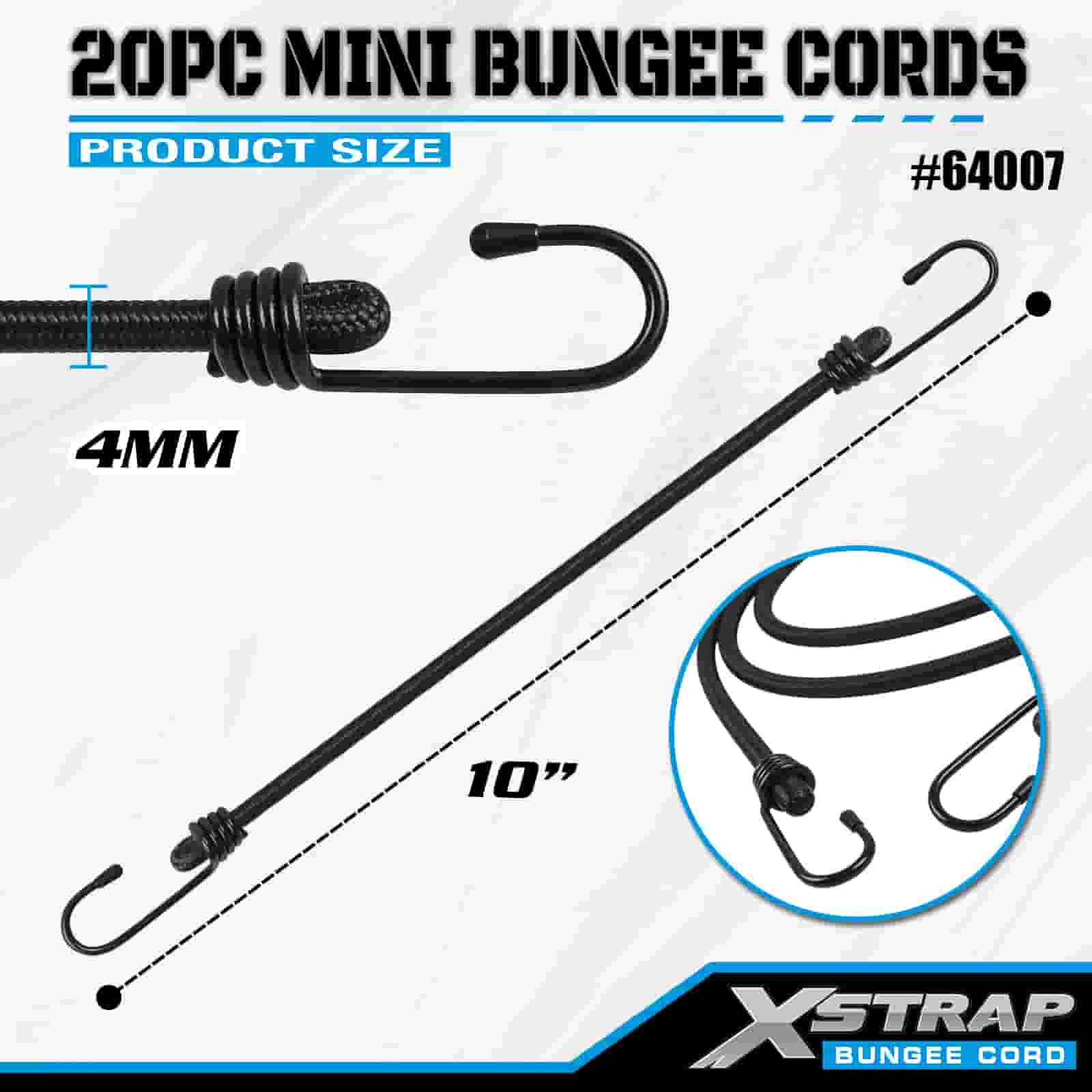 Xstrap 20PK MINI Bungee-koorden 4 mm x 10", 44-55 lbs breeksterkte met stalen haken met beschermende uiteinden en standaard veerhaken.