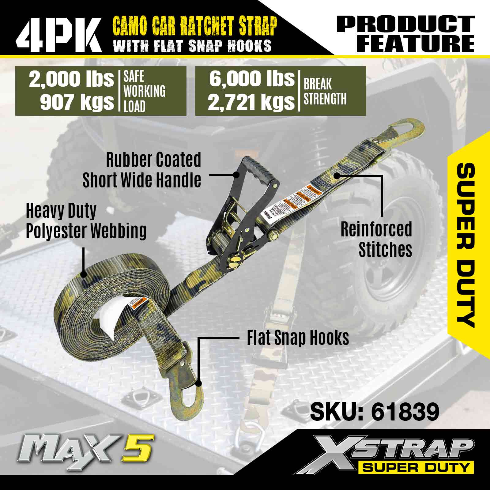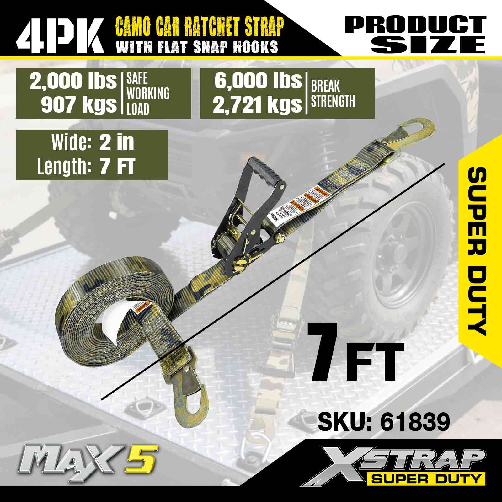 Xstrap Cargo Control automatische ratelriemen met platte karabijnhaken 2 inch x 7 voet (4-pack), 6.000 LBS breuksterkte, veelzijdige ratelriemen met platte sluithaken, vastzetauto's, motorfietsen en andere voertuigen