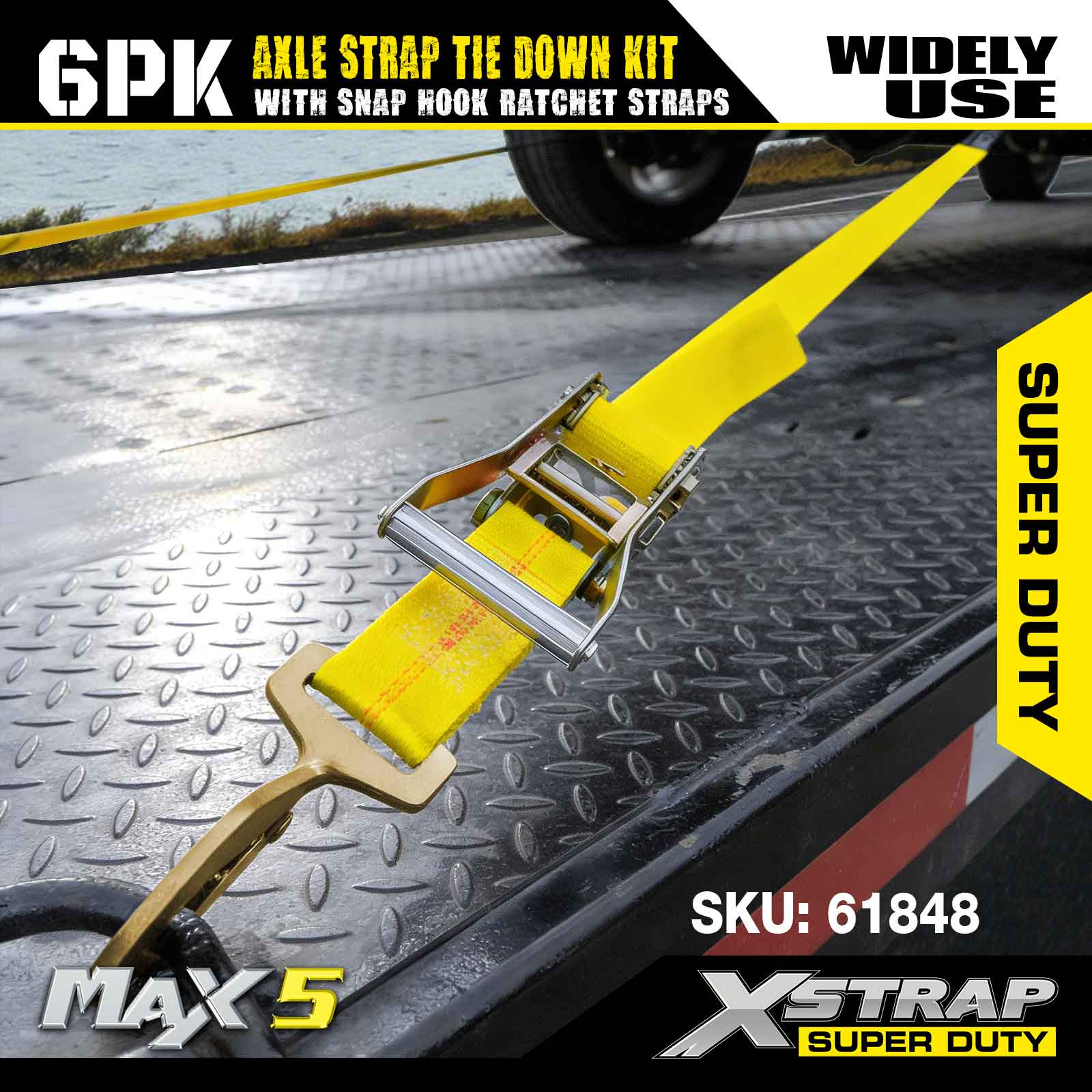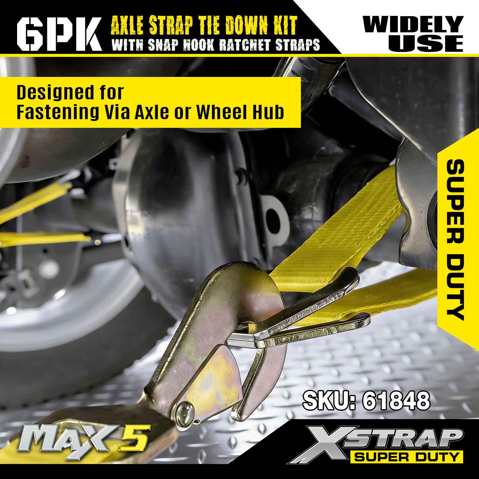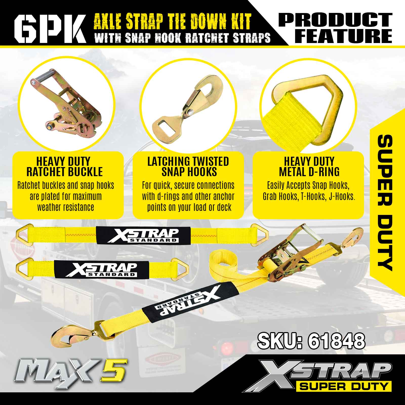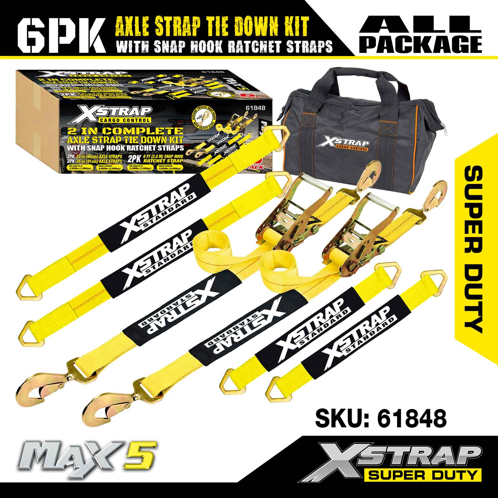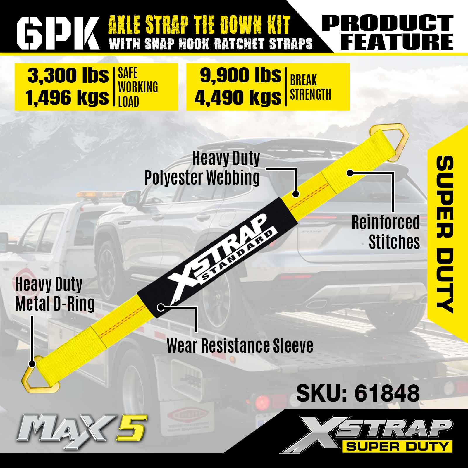Xstrap 6PK asriembevestigingsset (met karabijnhaak-ratelriemen) – Super Duty. Het heeft een veilige werklast van 3.300 LBS (1.496 kg) en een breeksterkte van 9.900 LBS (4.490 kg).