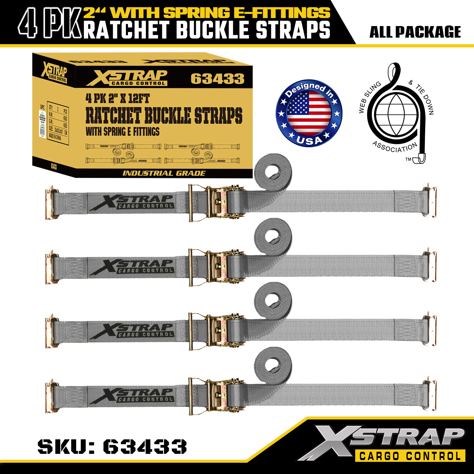 Xstrap 4-pack spanbanden met ratel, 2" x 16' polyester spanbanden voor lading, veilige werklast van 1467 lbs en breeksterkte van 4401 lbs, met metalen E-haken voor vrachtwagens, maaier, ATV's2. Productspecificatie: