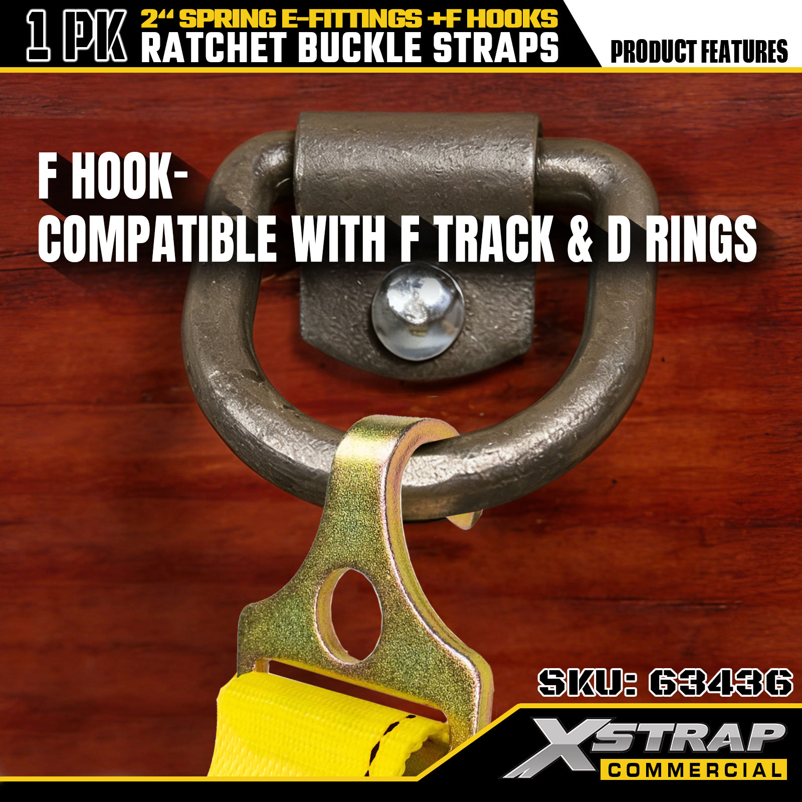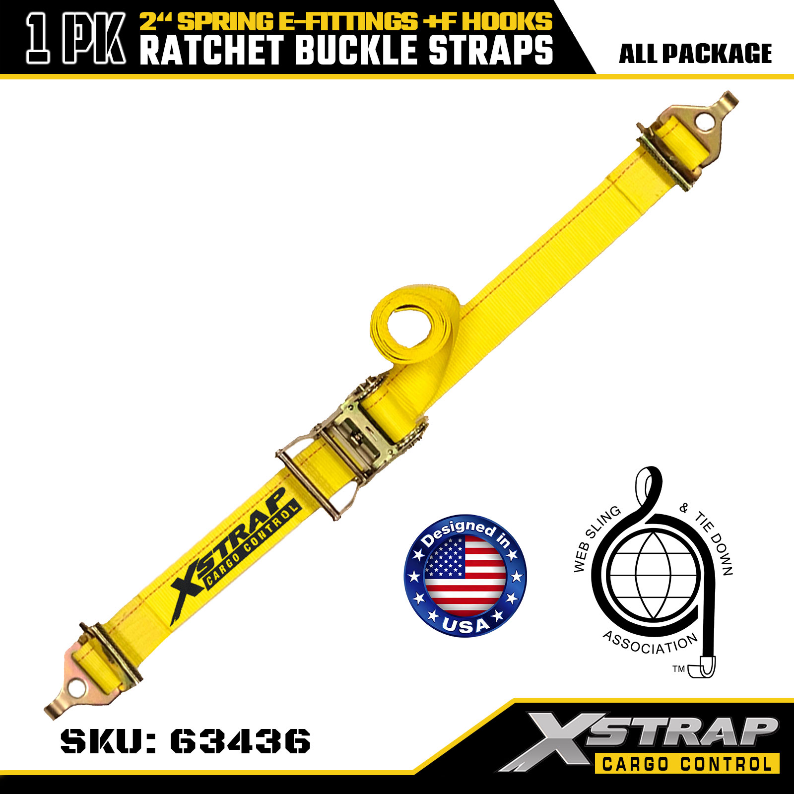 Xstrap 1-pack spanbanden met ratel, 2" x 12' zware ladingspanbanden met veer-E-fittingen en F-haken (geel), capaciteit van 733 lbs voor het vastzetten van aanhangwagens, vrachtwagens, bestelwagens en motorfietsen