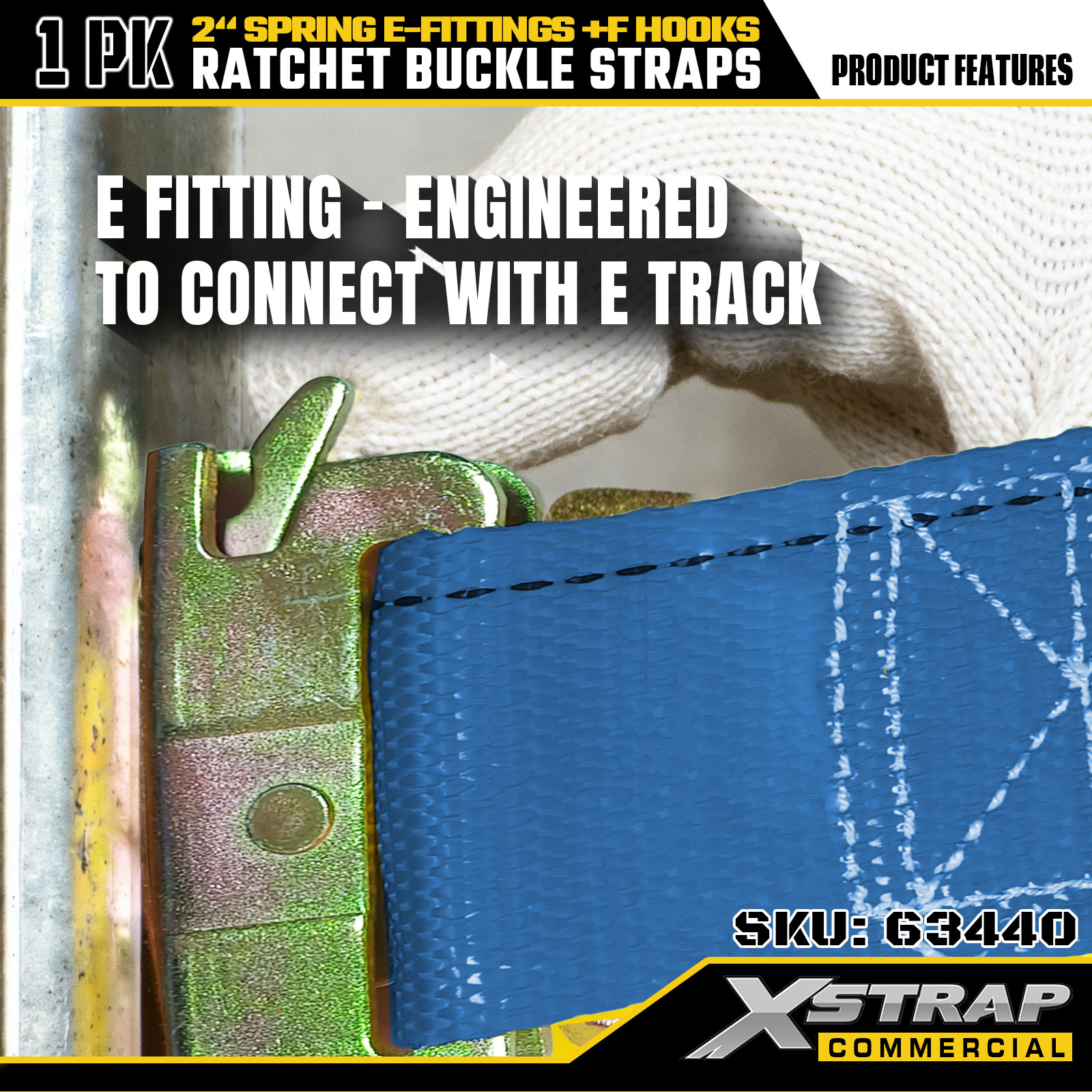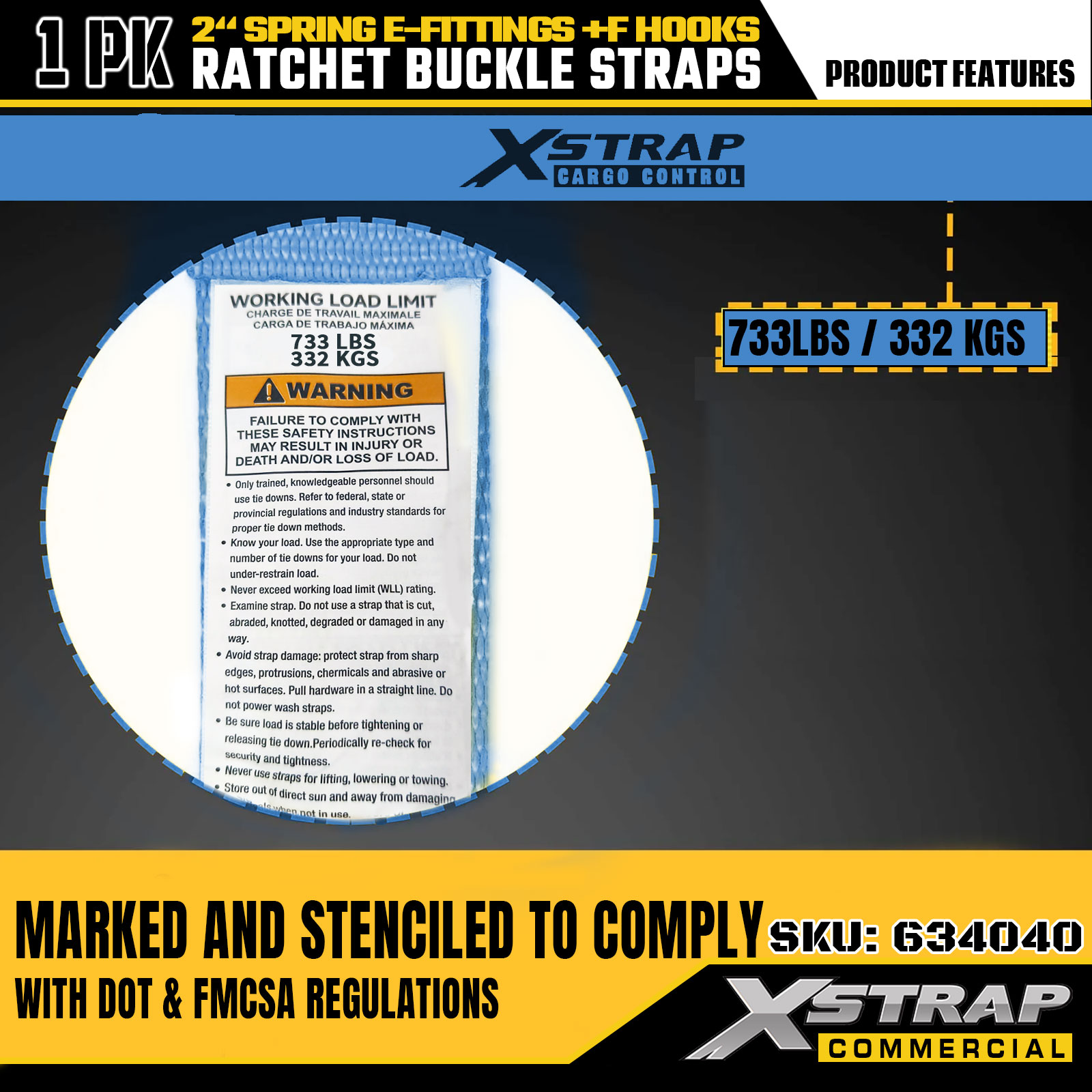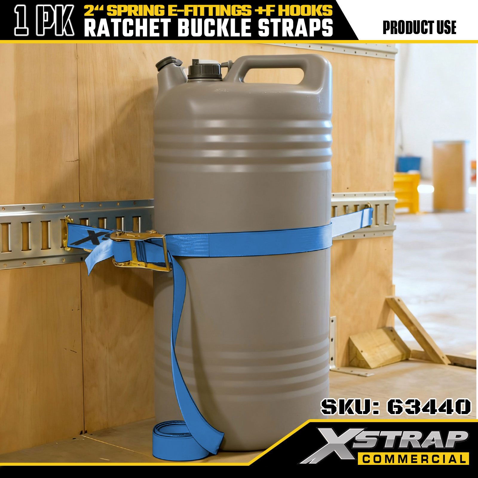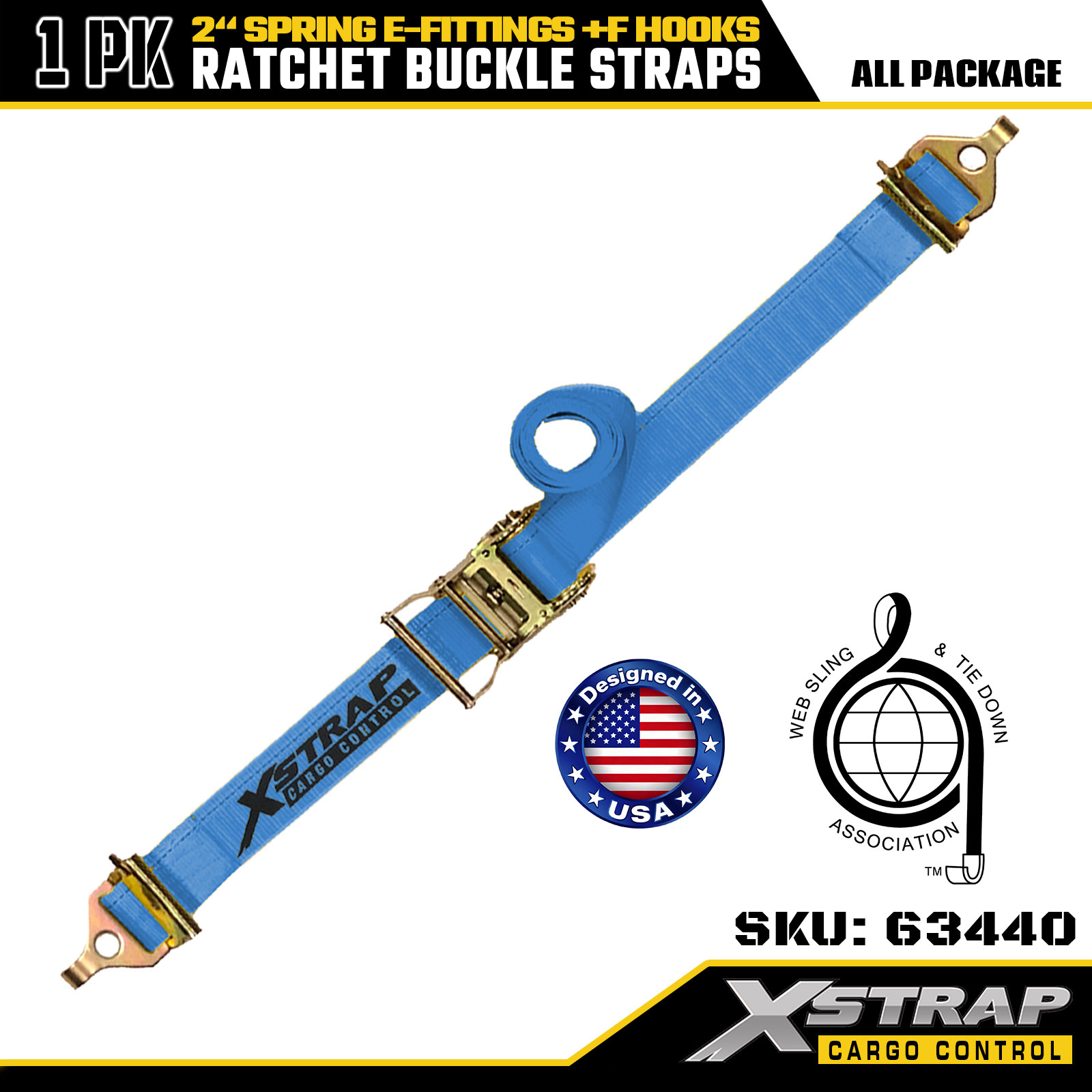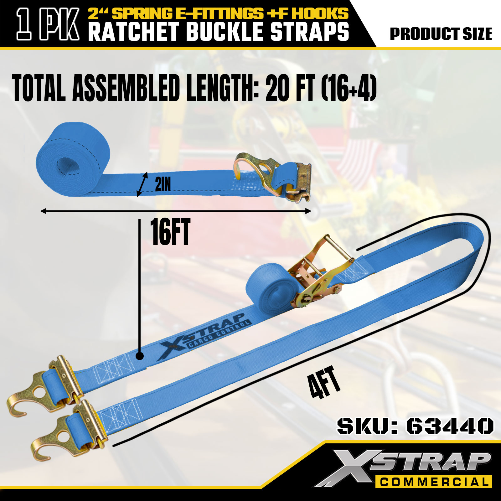 Xstrap 63440 Heavy-duty ratelband 2" x 20' (1PK) - Blauwe singelband, veer-E-fittingen en F-haken, 733 lbs SWL voor verplaatsen, vrachttransport en gebruik in vrachtwagens