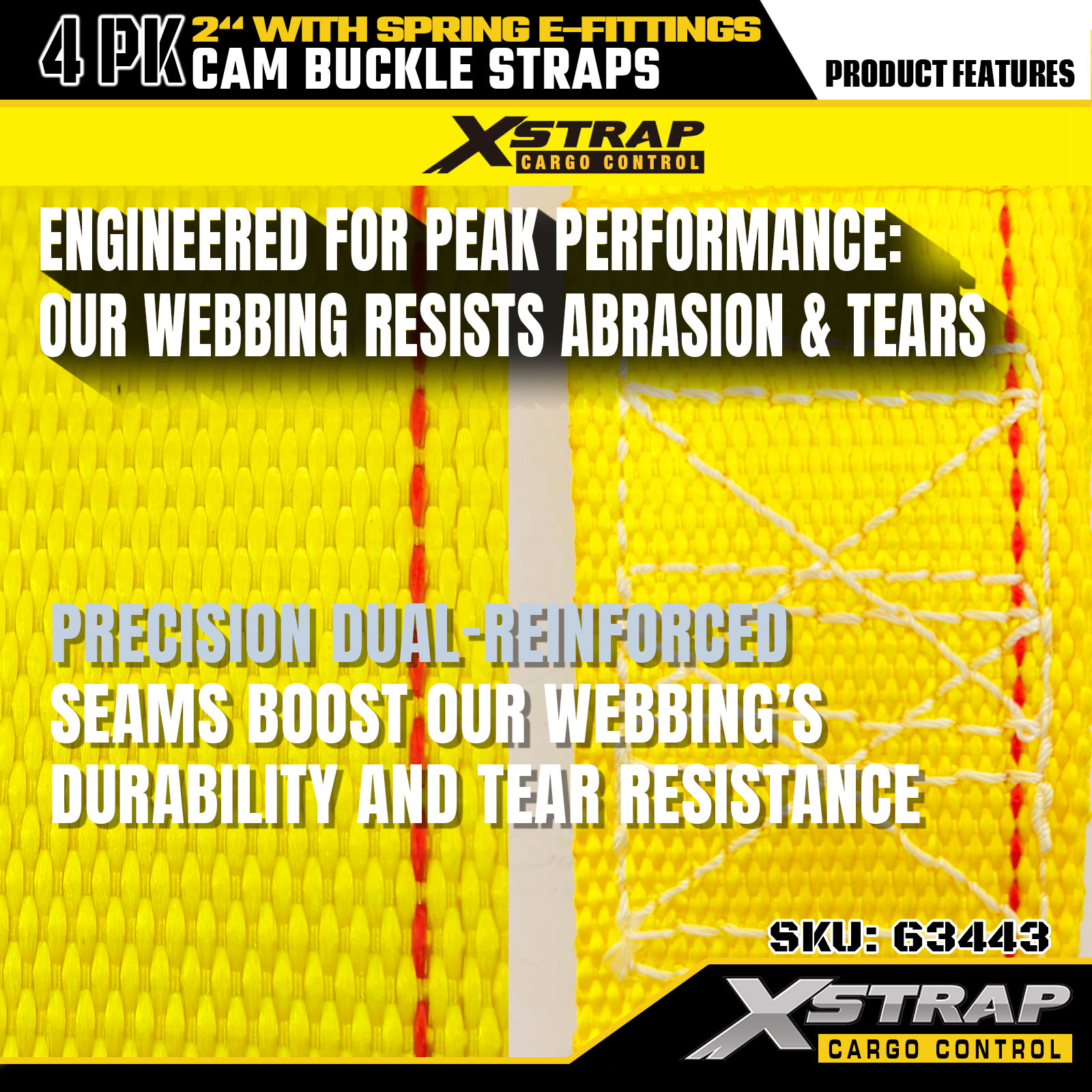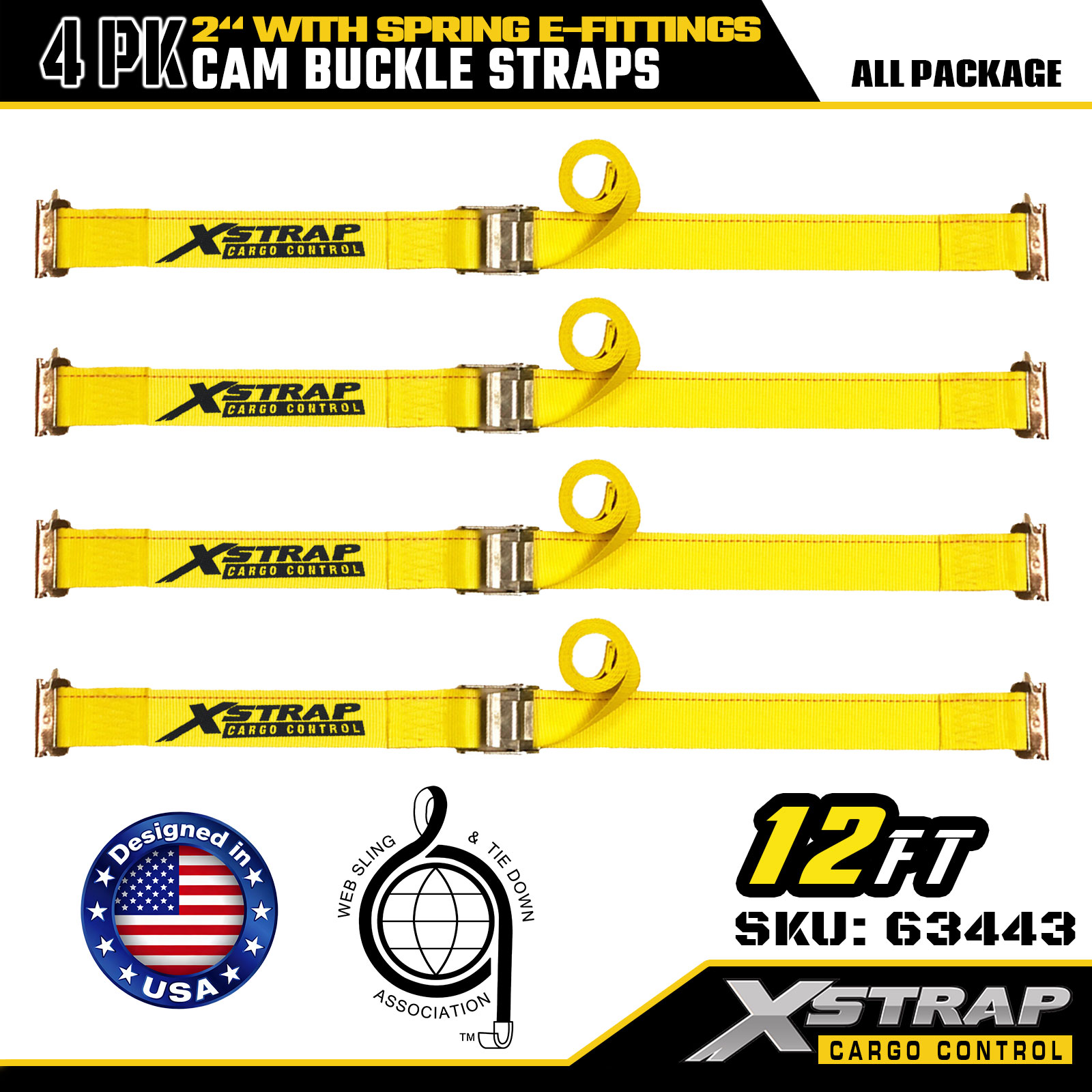 Xstrap 63443 4 stuks 2" x 12' gele nokkengespriemen met veer-E-fittingen, 1000 lbs SWL en 453 lbs breeksterkte voor vrachtafhandeling, verplaatsing en transport
