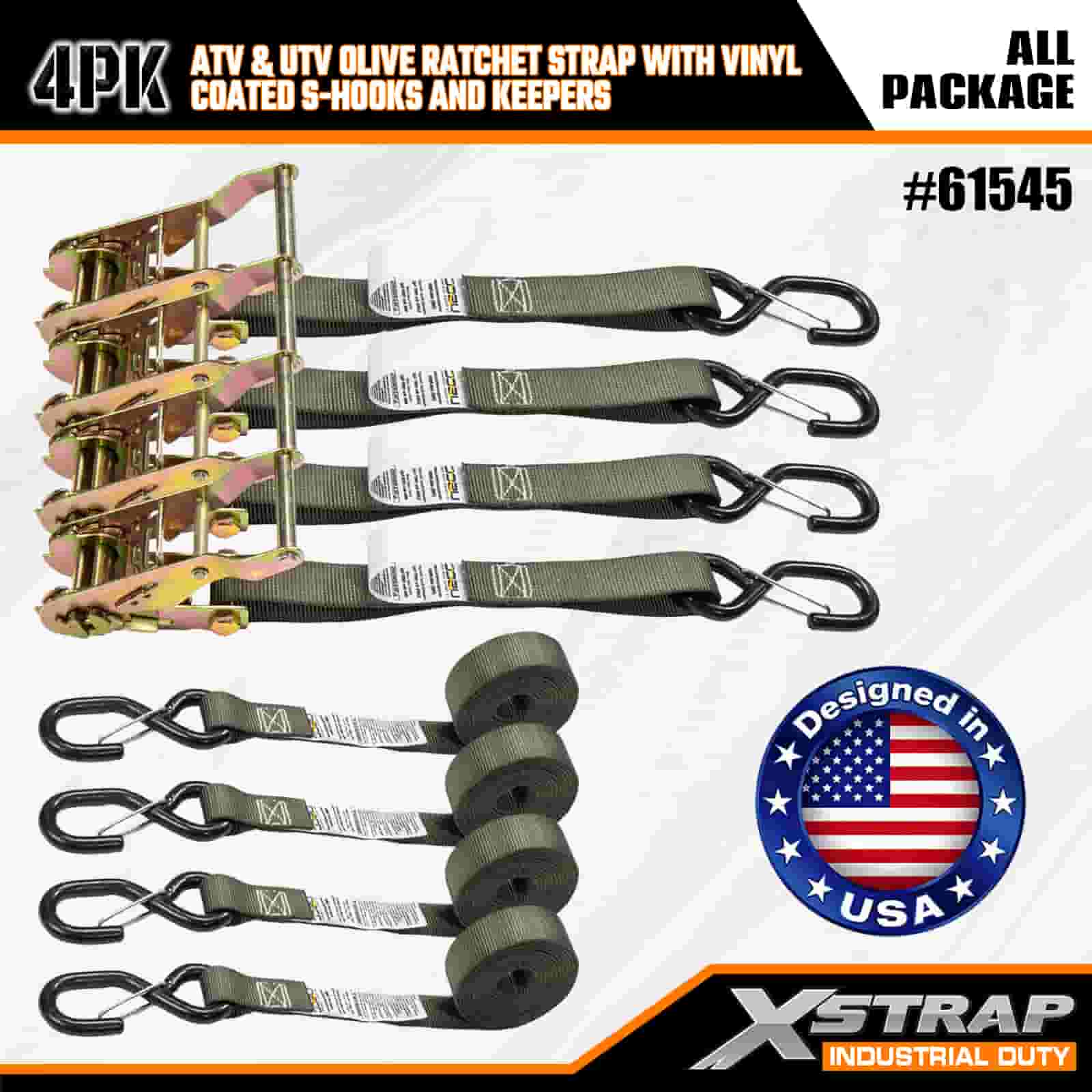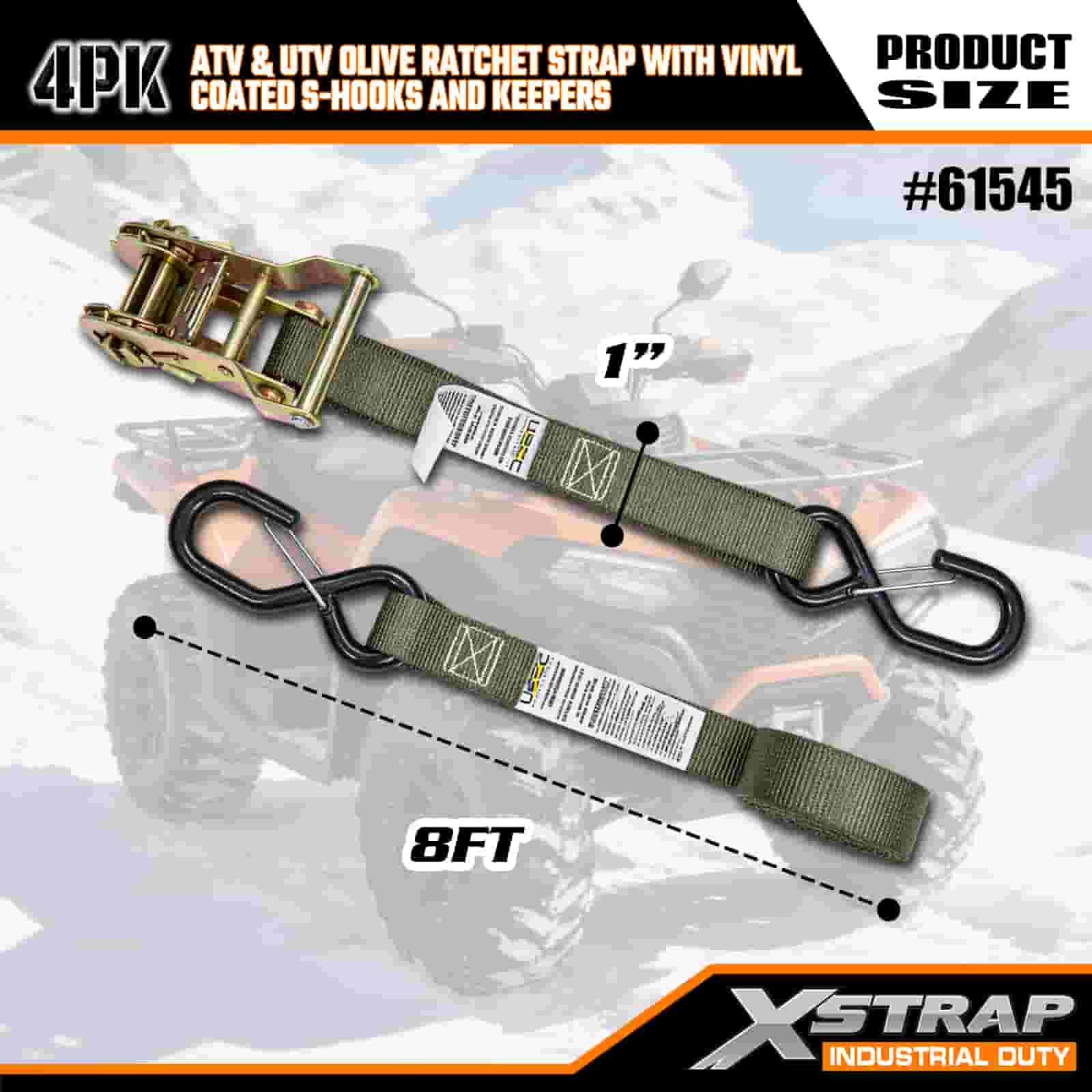 Xstrap 4PK Ratel-ratelriem met veiligheids-S-haken met vinylcoating, 1" x 8' polyester spanband Ratelband, capaciteit van 833 lbs Ladingspanbanden met veiligheids-S-haken voor zware aanhangwagens, aanhangwagens met plat bed, skiboten, kleine auto's, zwaar materieel.