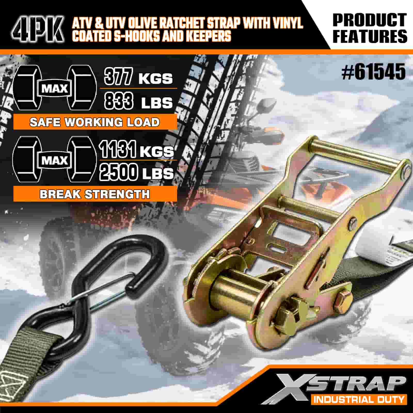 - 4-pack voor totale dekking: deze set bevat 4 riemen, waardoor u voldoende hebt om zowel de voor- als achterkant van uw ATV of UTV vast te zetten. De lengte van 2,5 meter is geschikt voor vrachtwagenbedden, aanhangwagens of bevestigingspunten, zodat u elke keer een stabiele grip kunt krijgen.