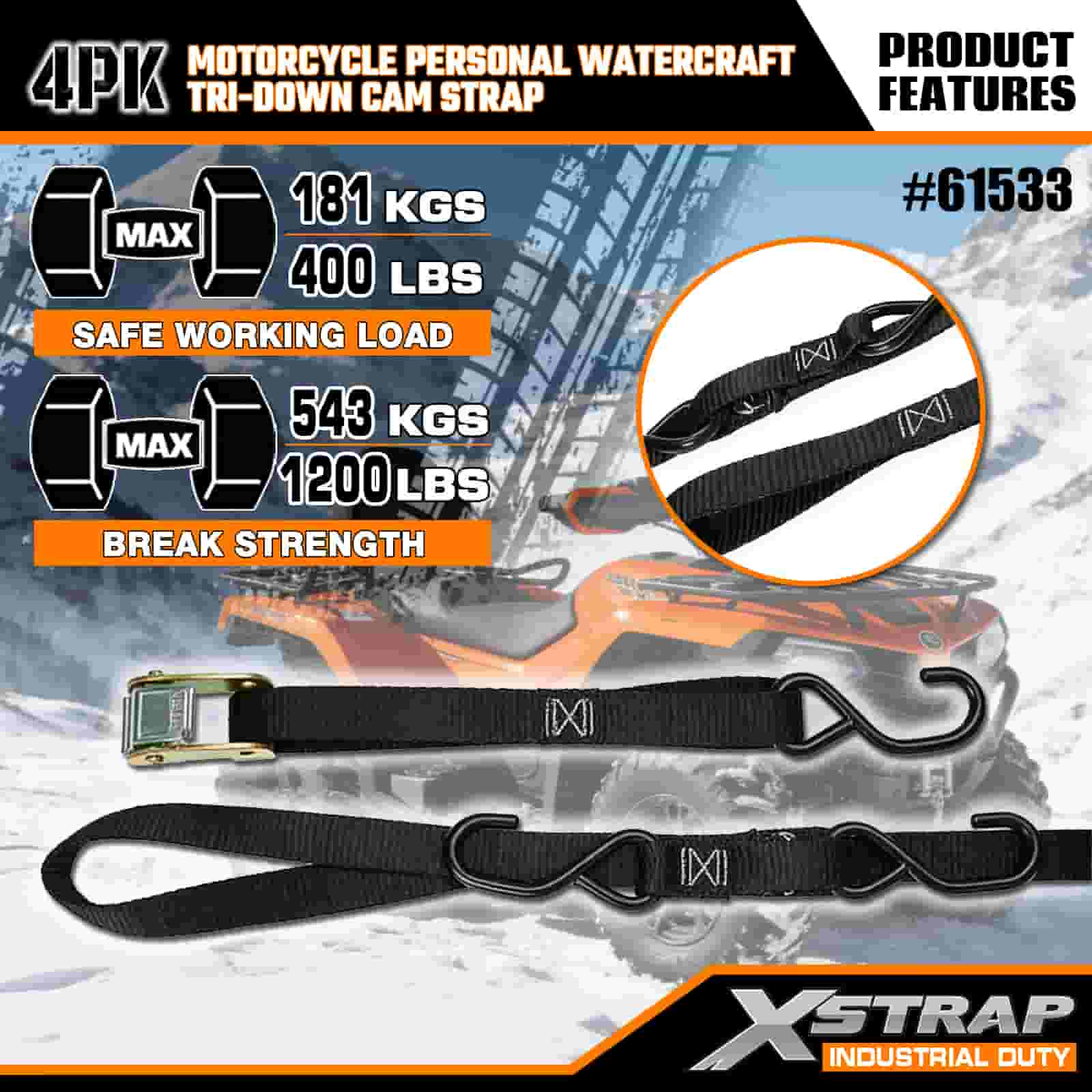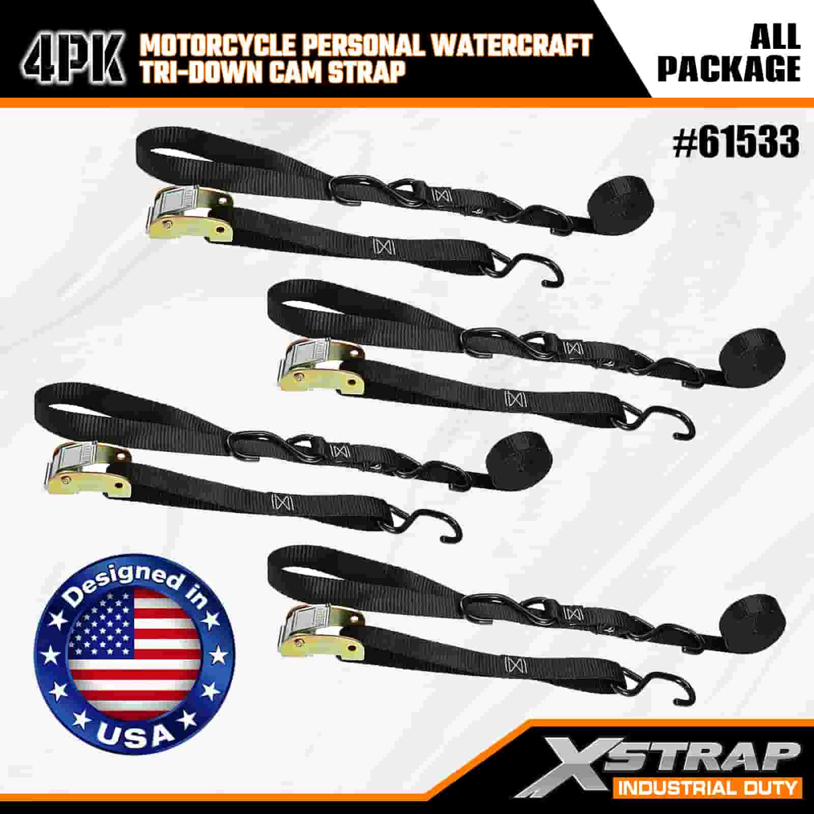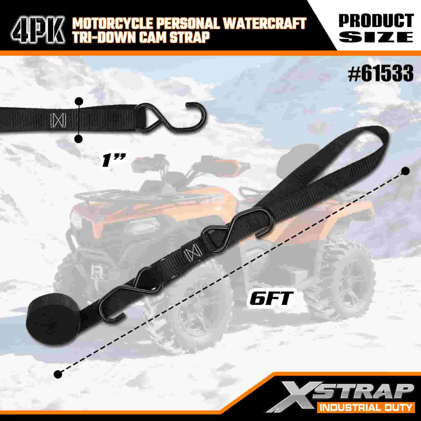 Xstrap 4PK motorfiets waterscooter Tri-Down nokkenriem, 1" x 6' polyester spanband, trekratelgesp, 400 lbs capaciteit vrachtspanbanden met S-haken voor de serieuze professional om vrachttrailer, platbedtrailer, skiboot, kleine auto vast te zetten.