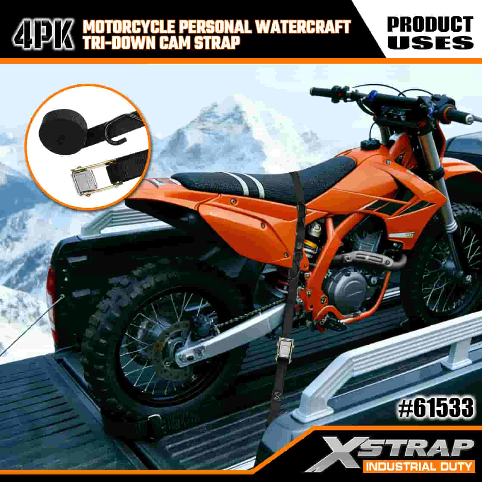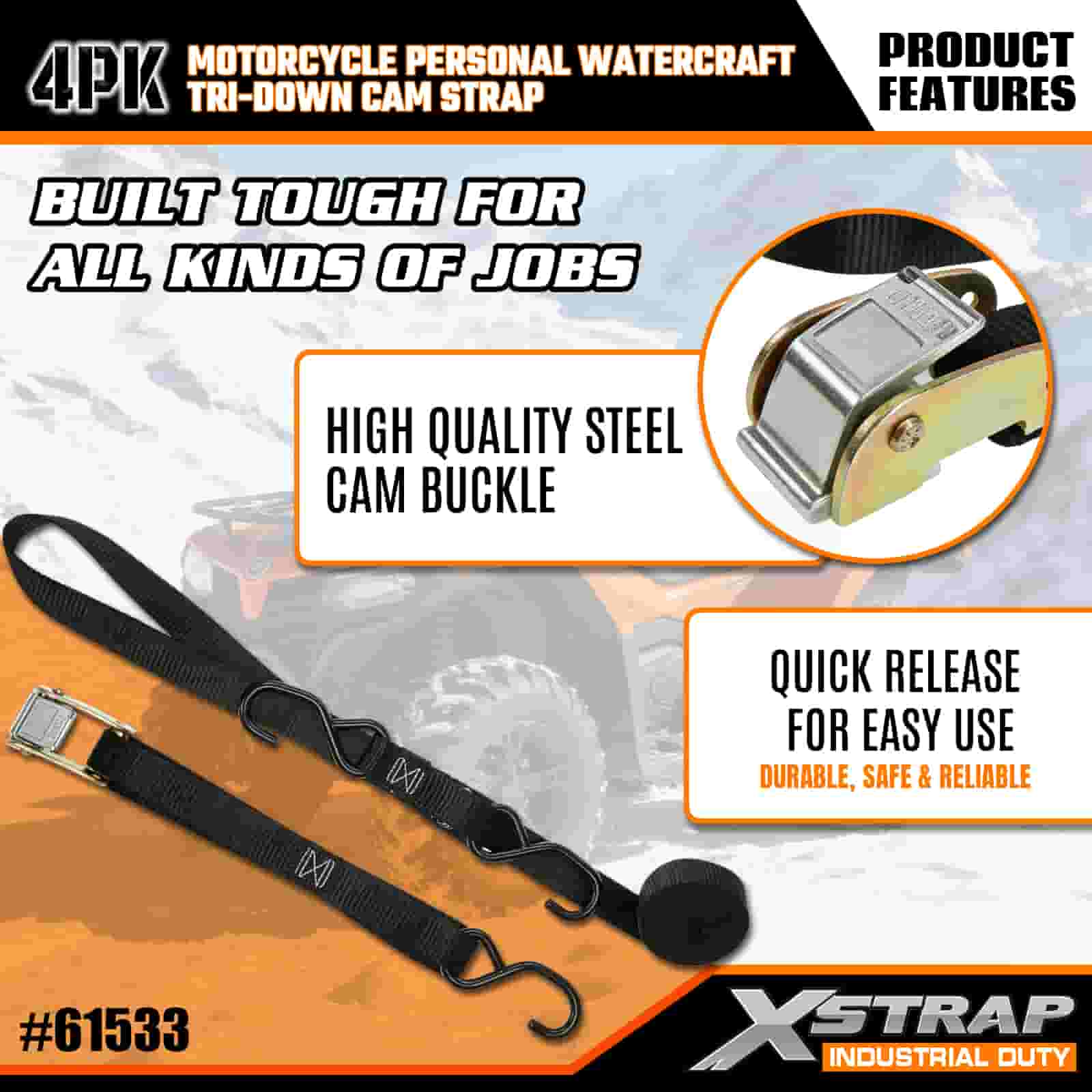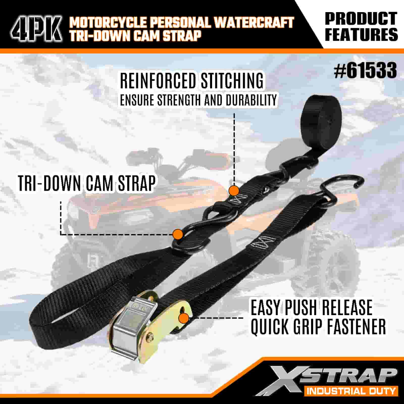 Xstrap 4PK motorfiets waterscooter Tri-Down nokkenriem, 1" x 6' polyester spanband, trekratelgesp, 400 lbs capaciteit vrachtspanbanden met S-haken voor de serieuze professional om vrachttrailer, platbedtrailer, skiboot, kleine auto vast te zetten.