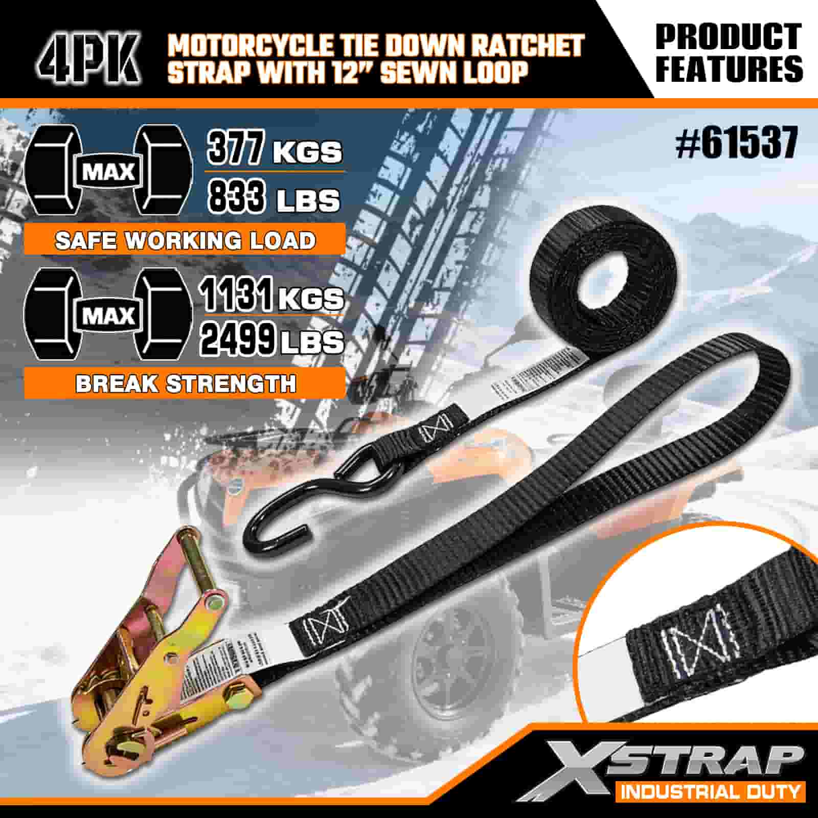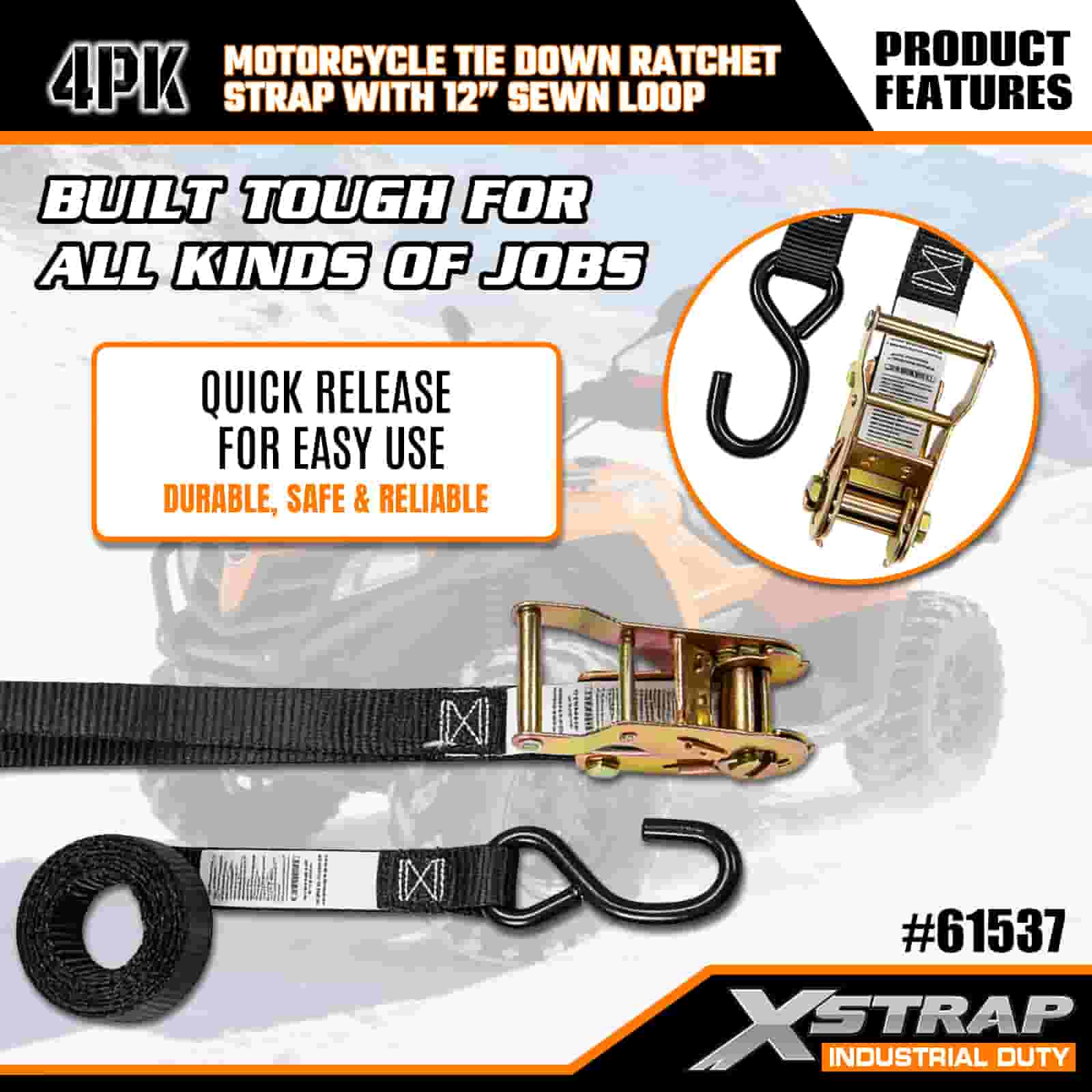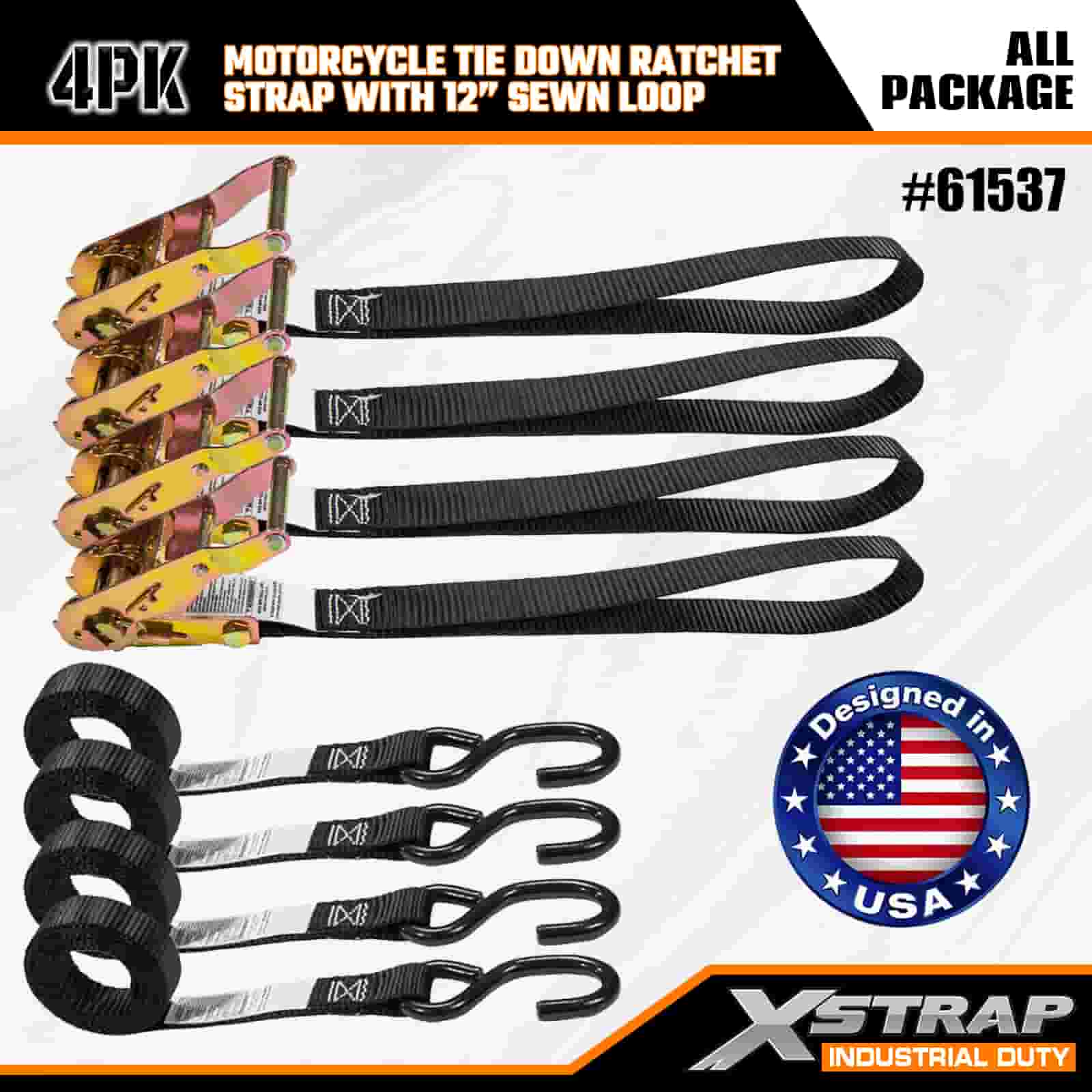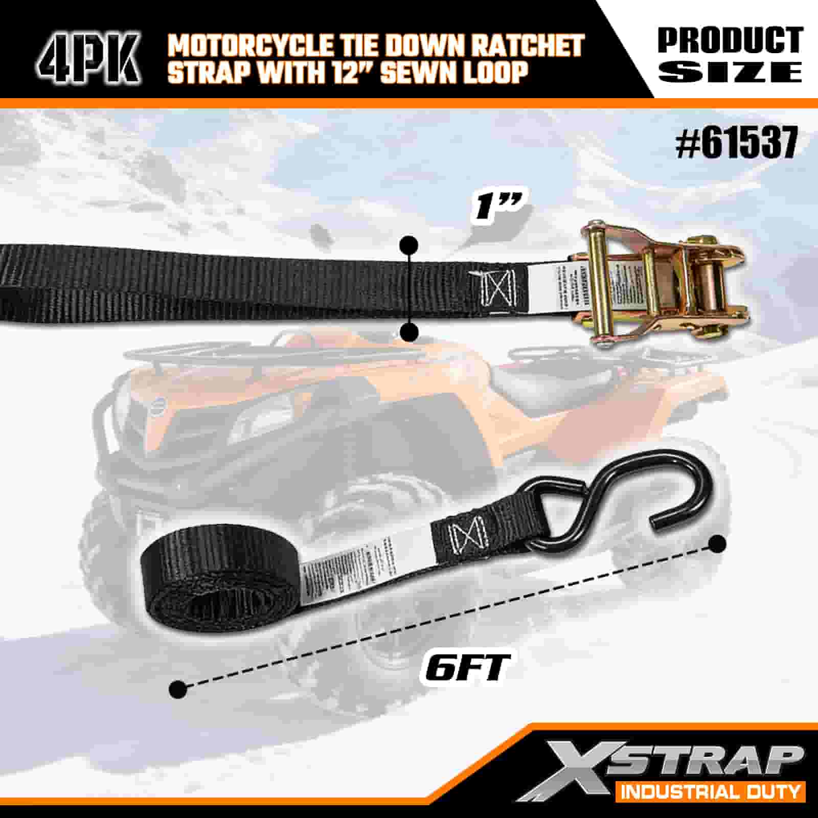 Xstrap 4PK motorfiets spanband met 30 cm genaaide lus, 1" x 6' polyester spanband trek ratelband, 833 lbs capaciteit spanbanden met S-haak voor de serieuze professional om vrachttrailer, dieplader, skiboot, kleine auto vast te zetten.