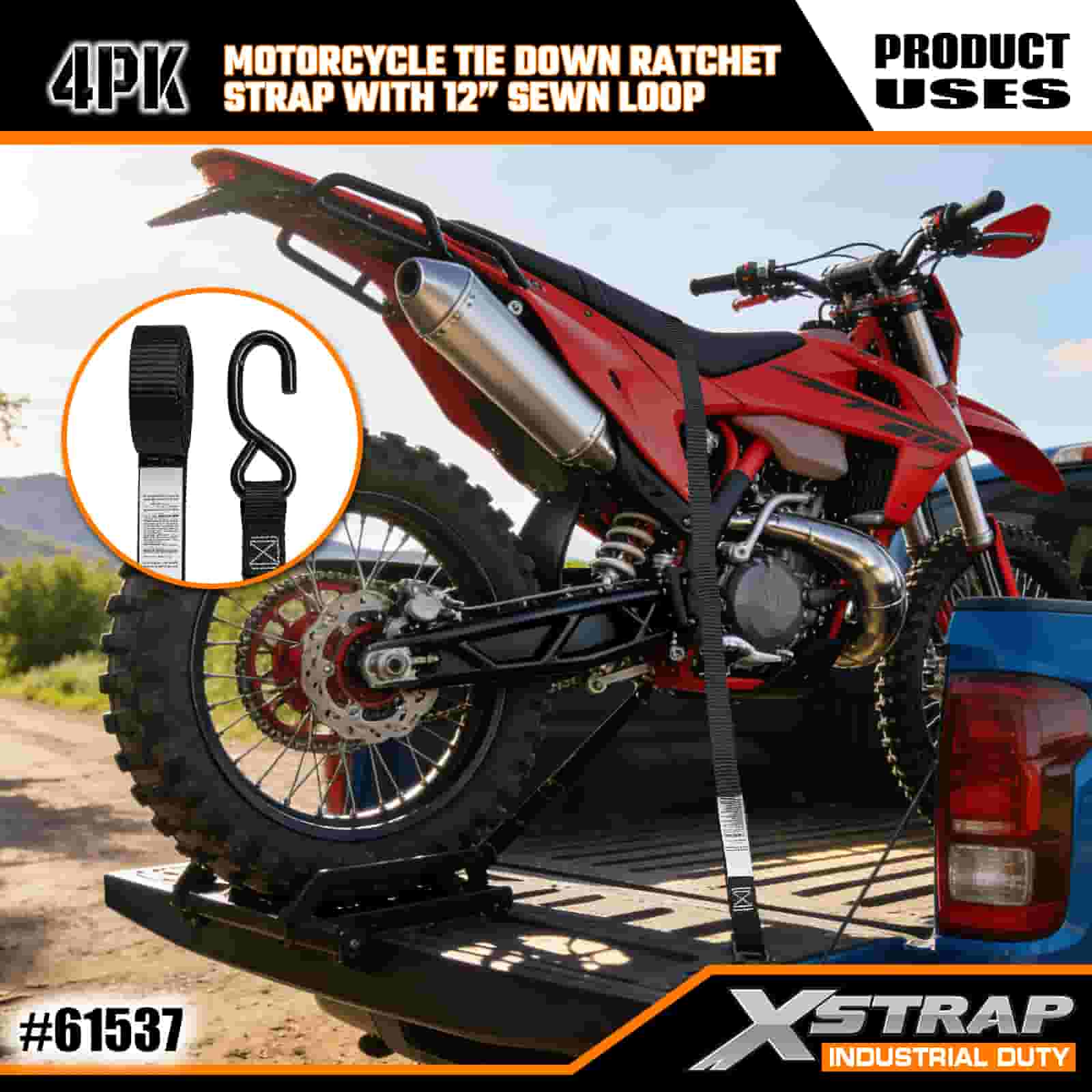 - 4-pack 6FT-riemen voor het vastzetten van motorfietsen: Verkocht als een set met 4 riemen (1 inch breed x 6 voet lang), ideaal voor het vastzetten van motorfietsen, ATV's en kleine spullen in vrachtwagenbedden of tijdens transport.