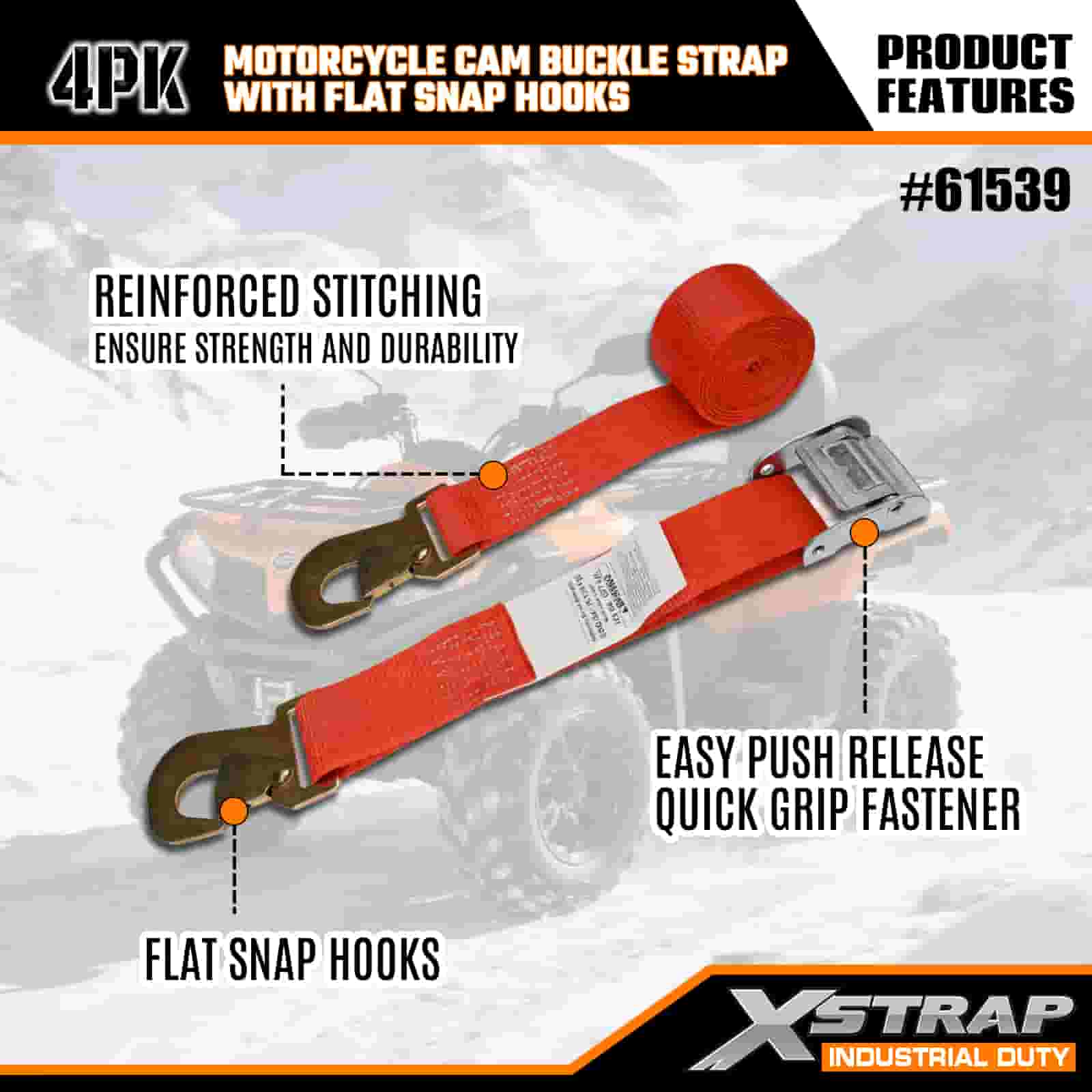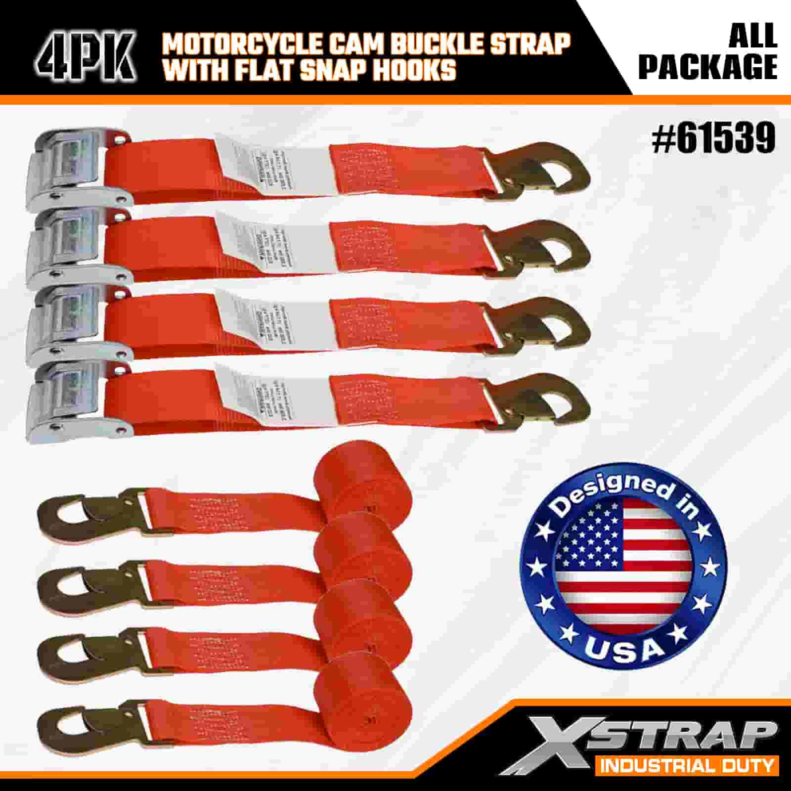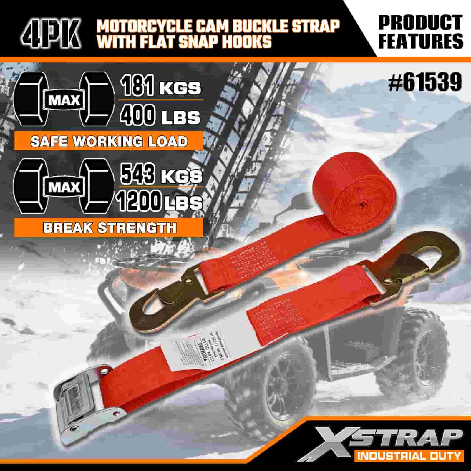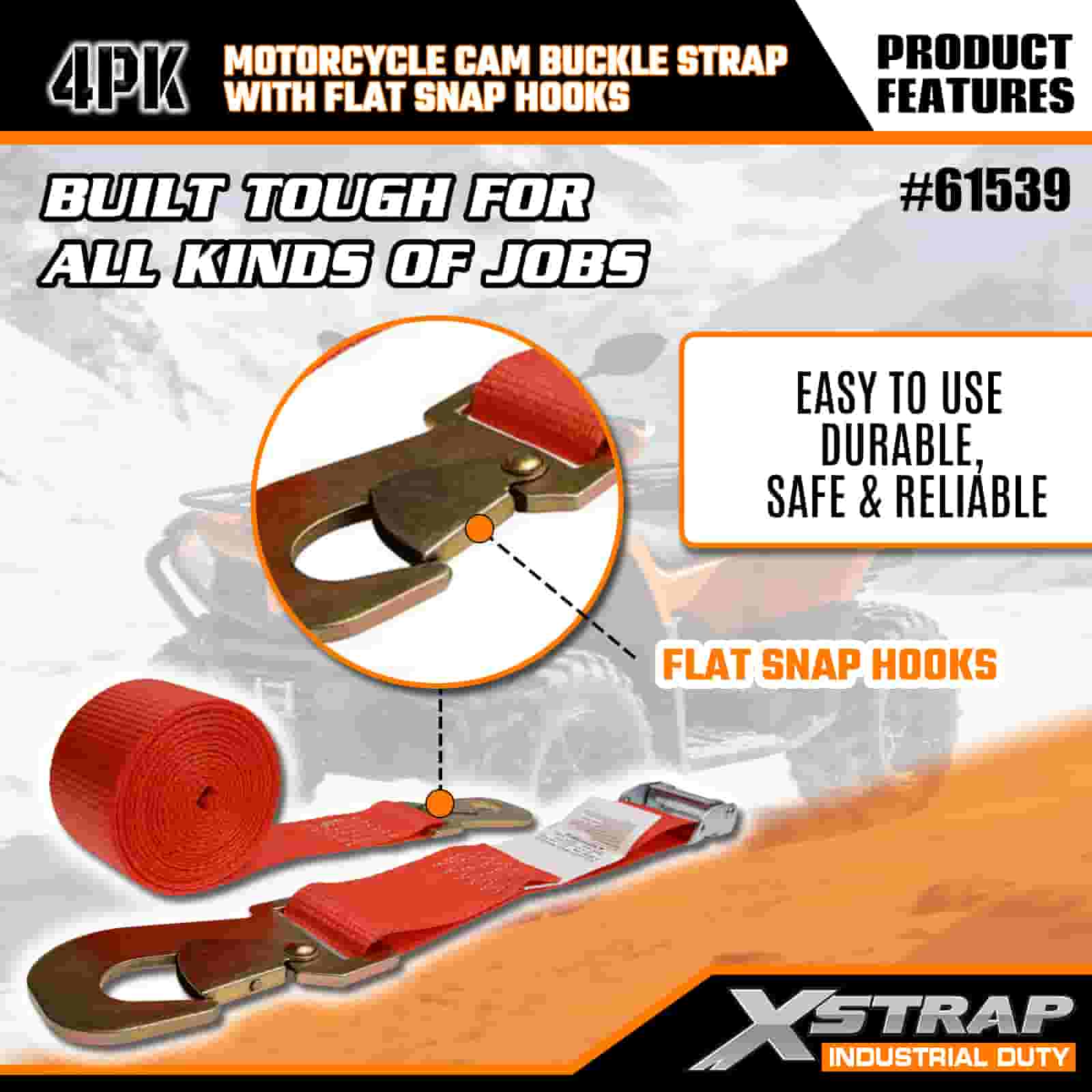 Xstrap 4PK motorfiets cam-gespriem met platte karabijnhaak, 2" x 8' polyester spanband Trek-ratelgesp, 400 lbs capaciteit ladingssjorriemen met platte karabijnhaak voor de serieuze professional om vrachttrailer, platbedtrailer, skiboot, kleine auto vast te zetten.