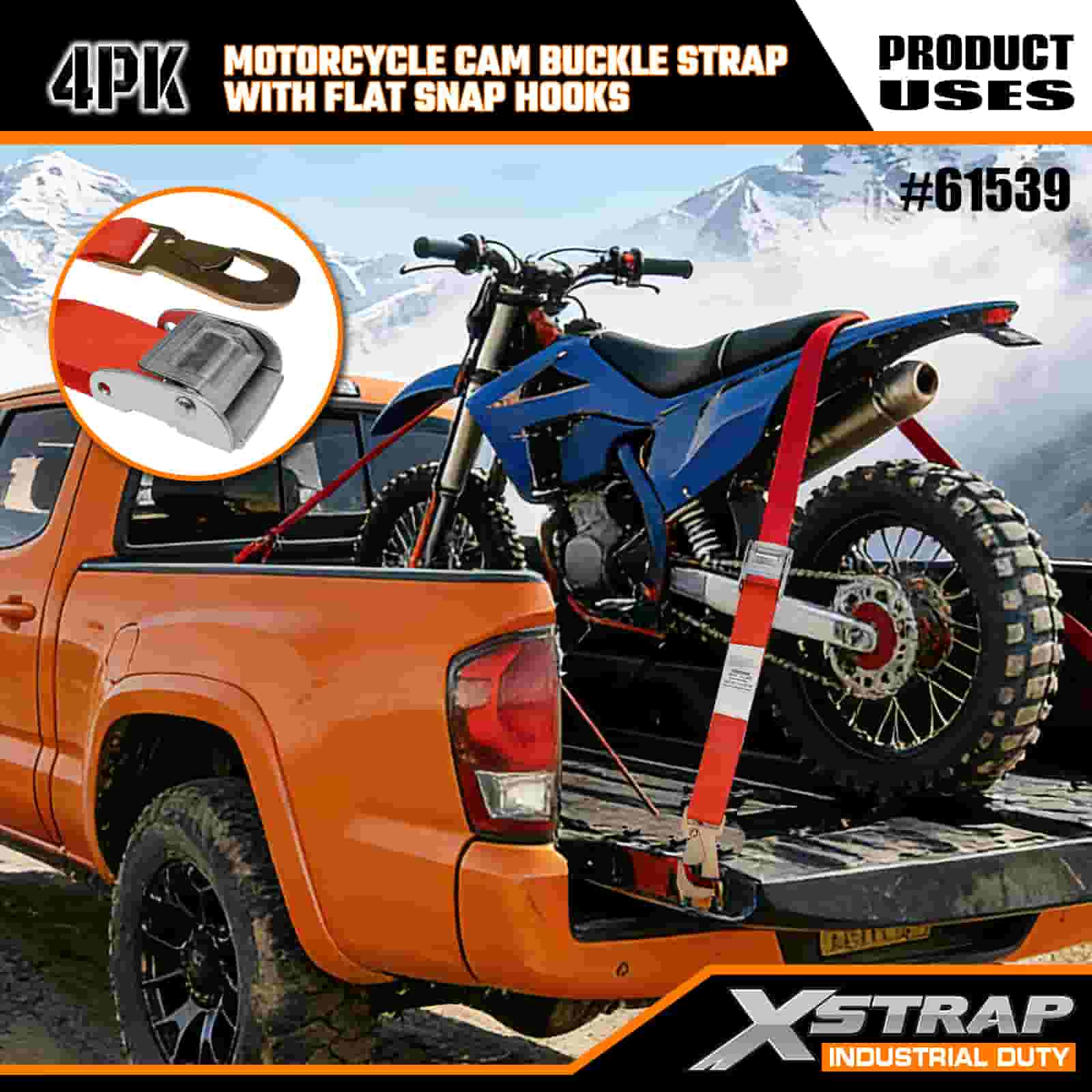 - 4-pack 8FT-formaat (perfect voor motorfietsen): 2 inch breedte verdeelt de spanning gelijkmatig (geen frameschade), en een lengte van 2,5 meter past op vrachtwagenbedden, aanhangwagens of dakdragers. Het 4-pack biedt je voldoende riemen om de voor-/achterwielen en het stuur vast te zetten voor totale stabiliteit.
