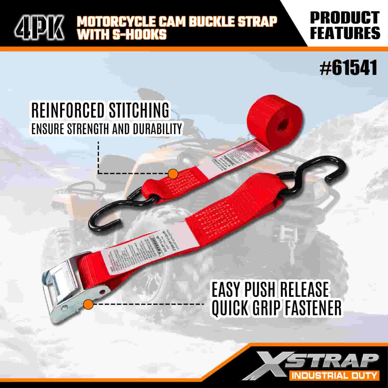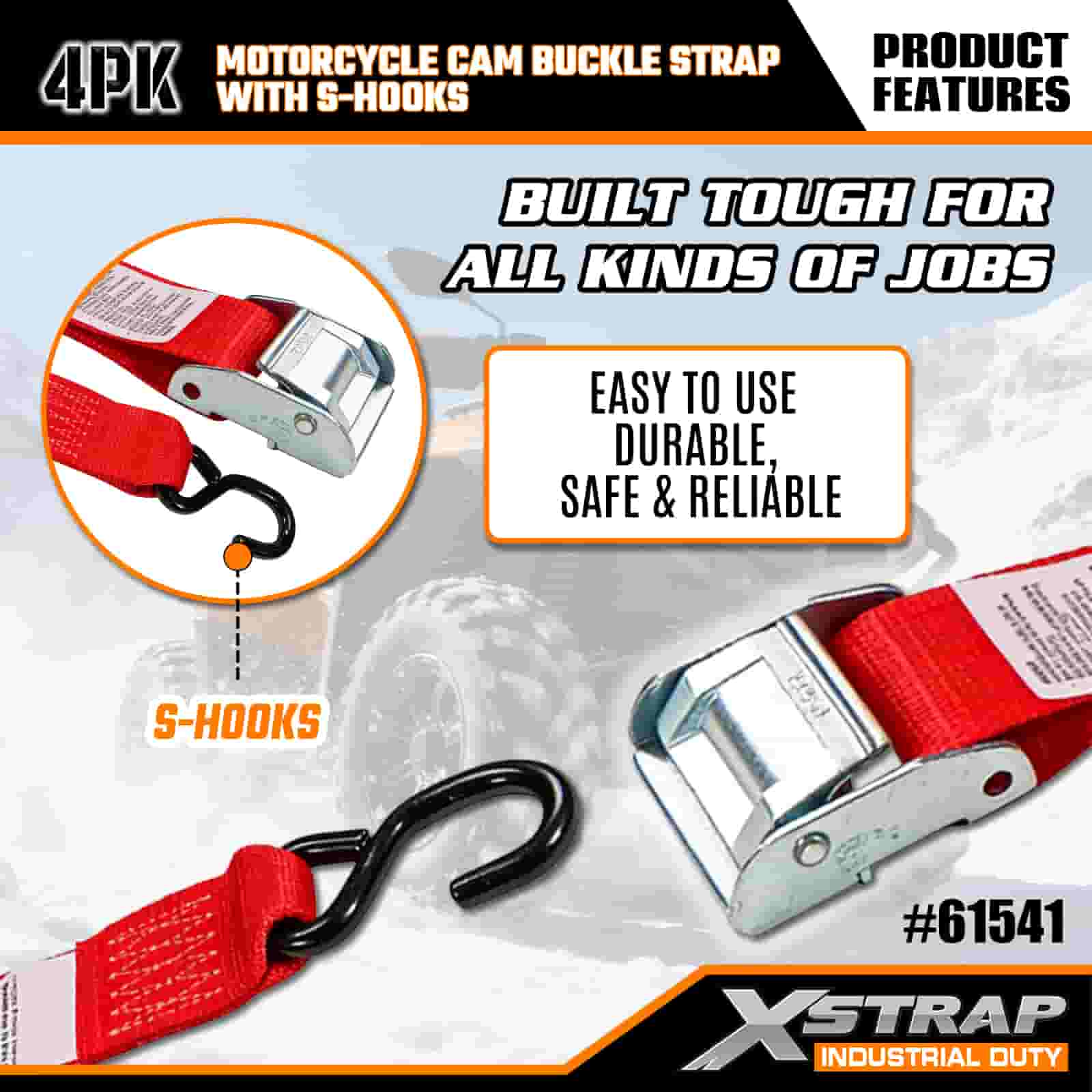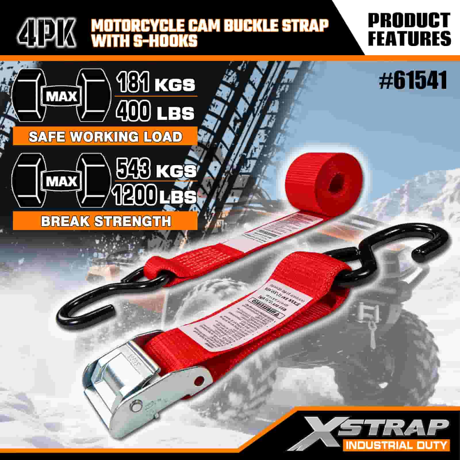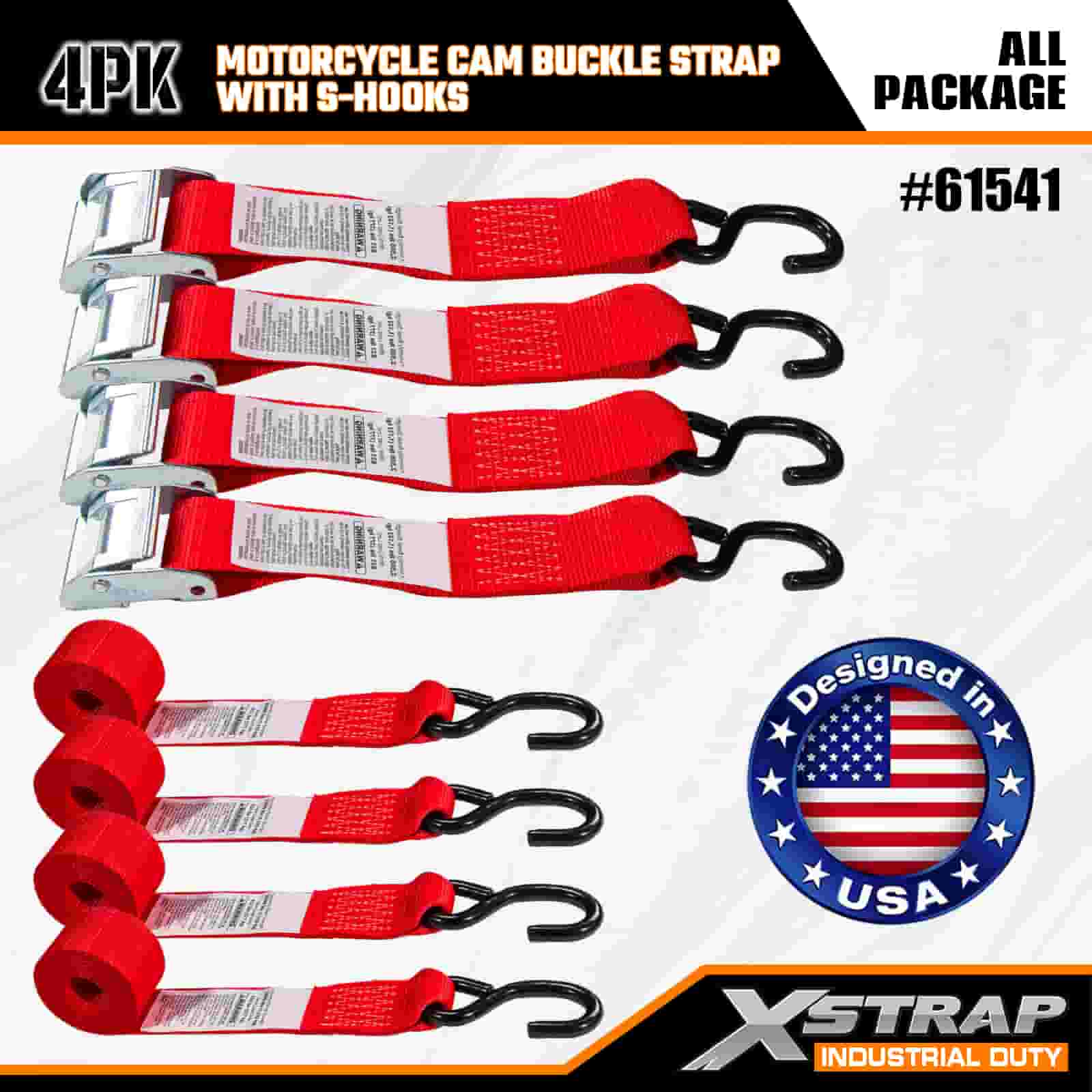 Xstrap 4PK motorfiets cam-gespriem met S-haak, 2" x 8' polyester spanband Trek-ratelgesp, 400 lbs capaciteit ladingssjorriemen met S-haak voor de serieuze professional om vrachttrailer, platbedtrailer, skiboot, kleine auto vast te zetten.