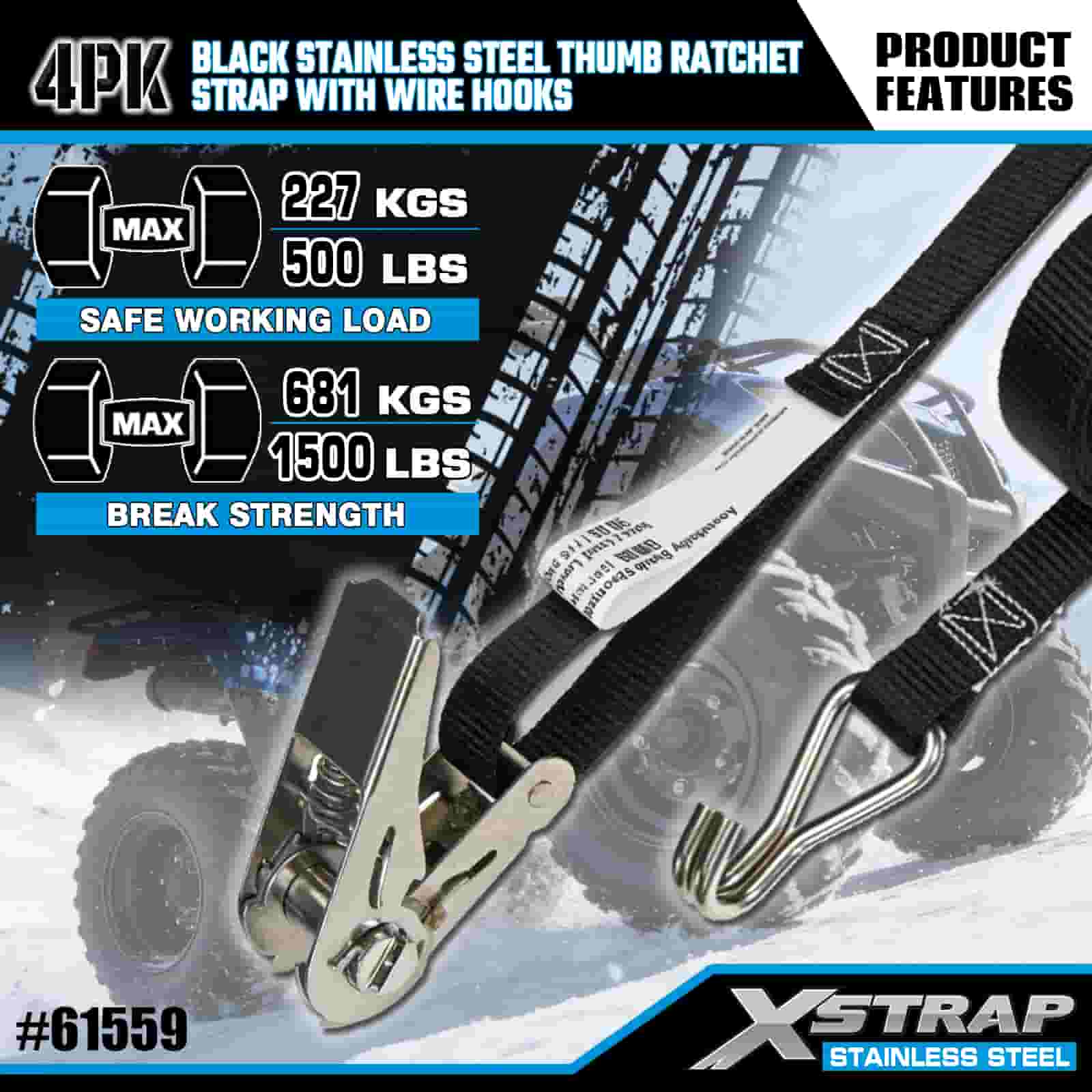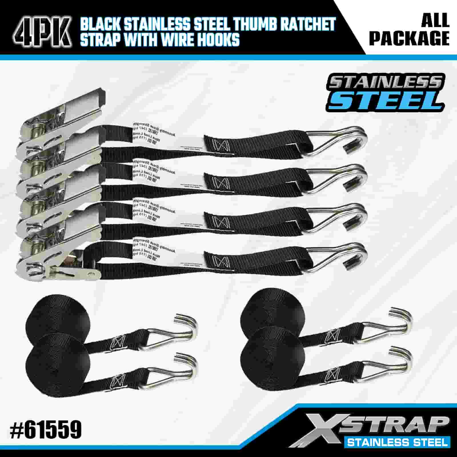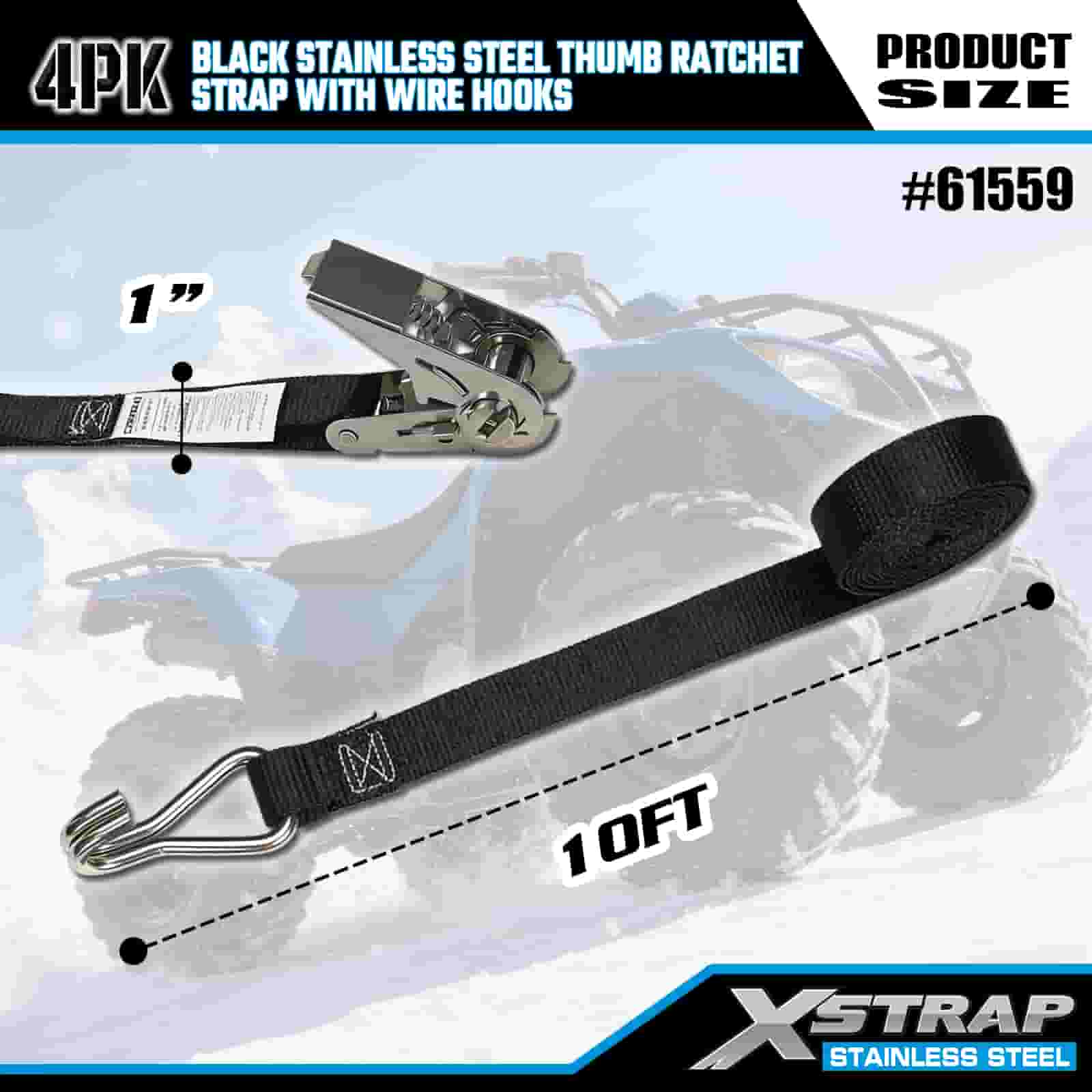 Xstrap 4PK zwarte roestvrijstalen duimratel met draadhaken, 1 "x 10' polyester spanband met ratelriem, 500 lbs capaciteit vrachtspanbanden met draadhaken voor aanhangwagen, aanhanger met plat bed, skiboot, kleine auto, zwaar materieel.