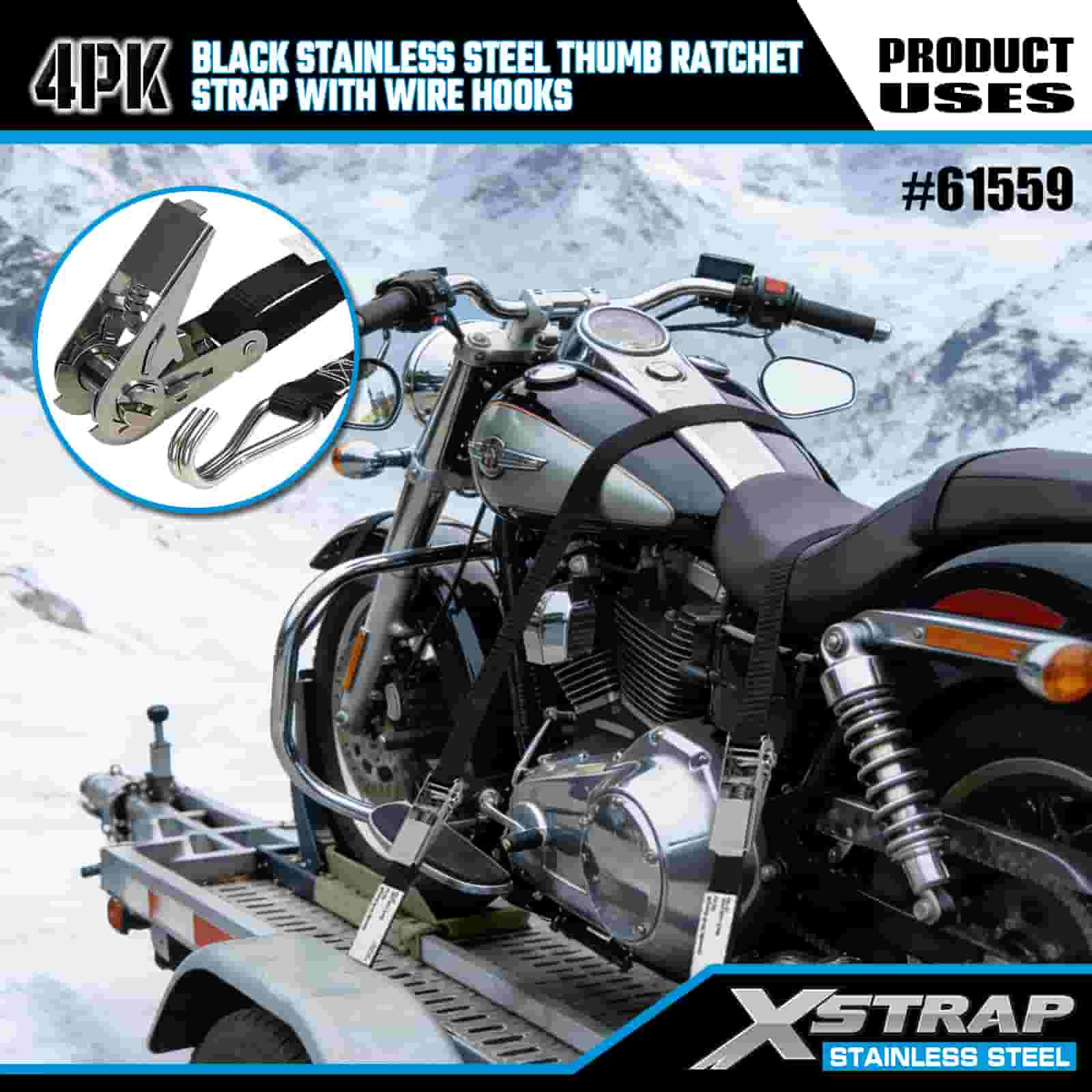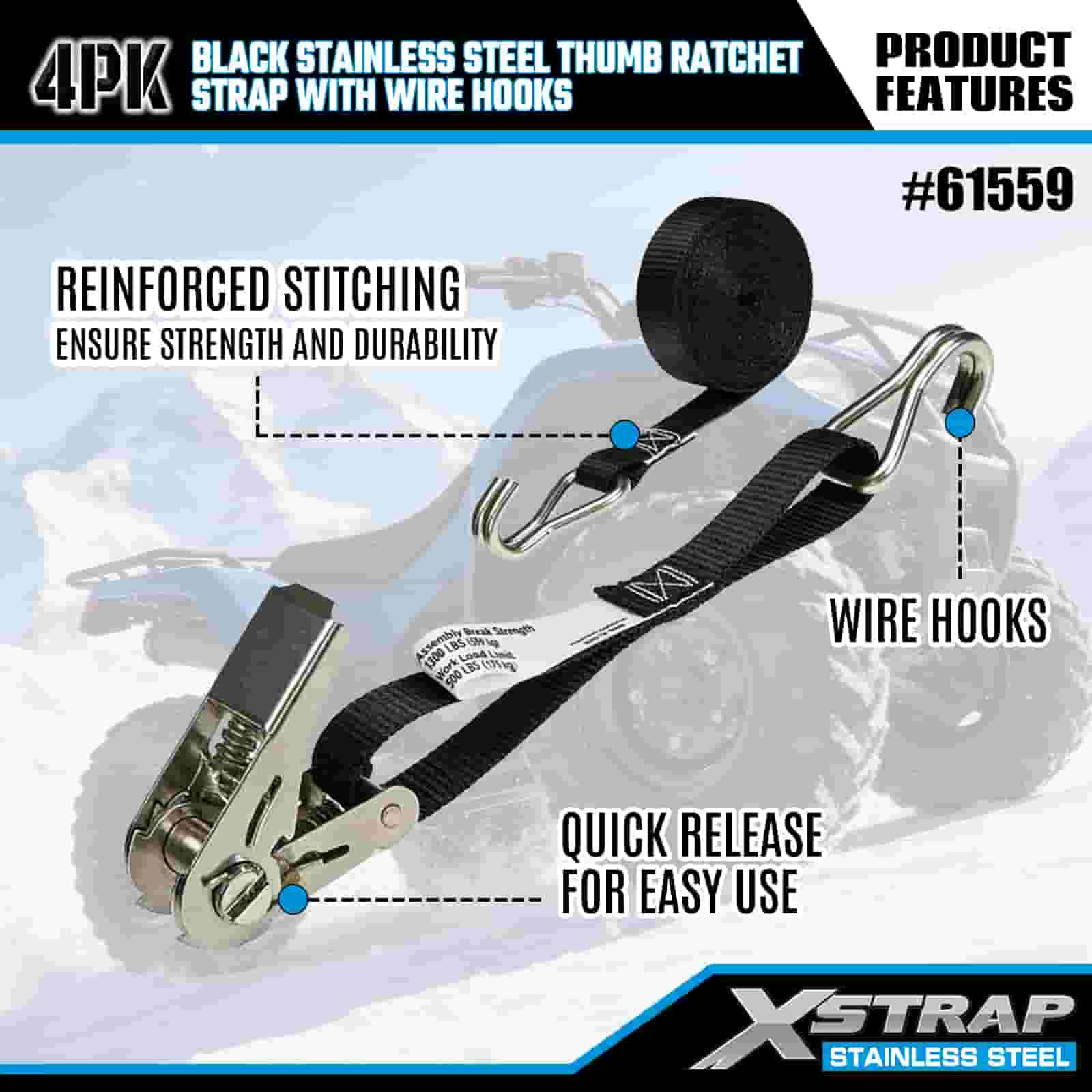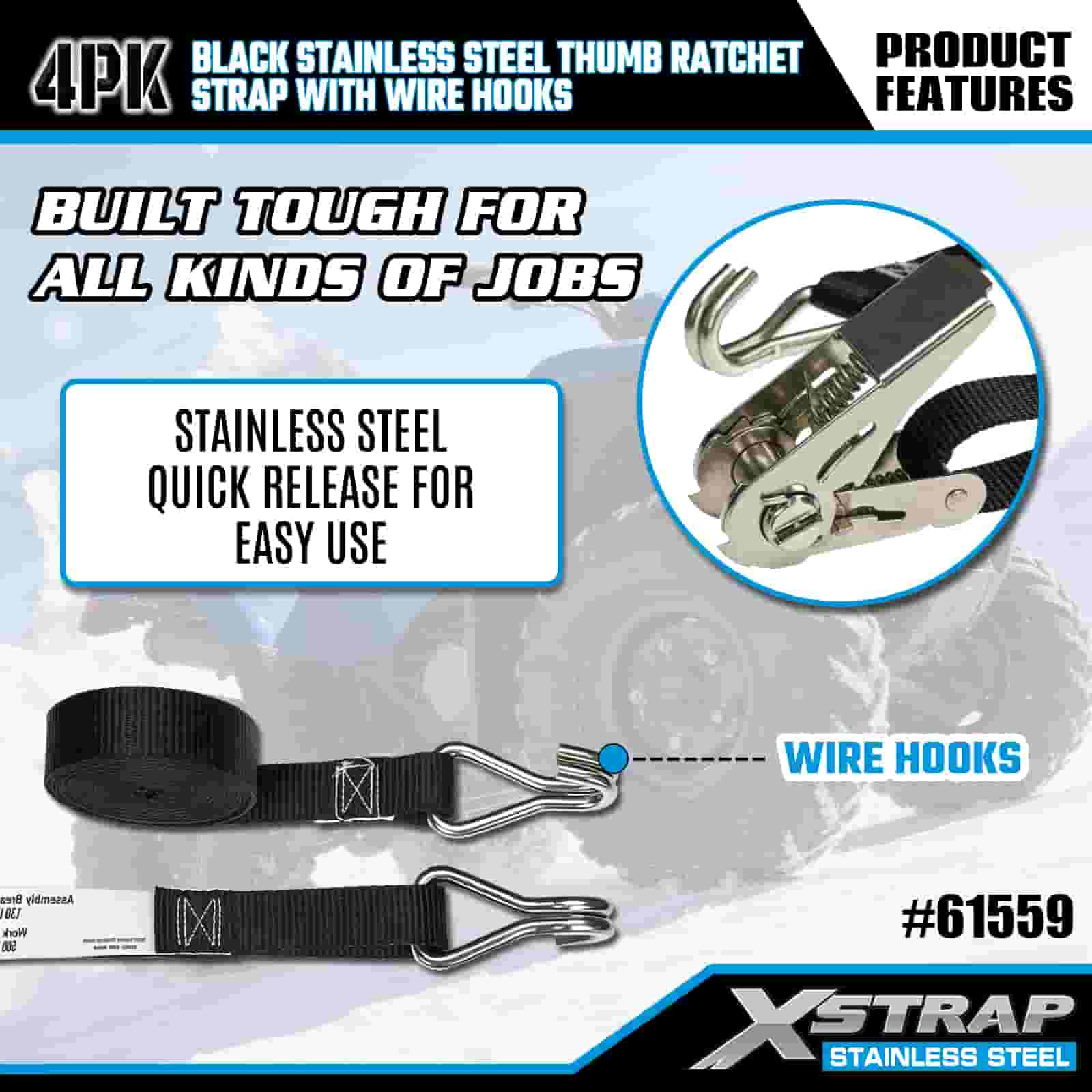 Xstrap 4PK zwarte roestvrijstalen duimratel met draadhaken, 1 "x 10' polyester spanband met ratelriem, 500 lbs capaciteit vrachtspanbanden met draadhaken voor aanhangwagen, aanhanger met plat bed, skiboot, kleine auto, zwaar materieel.