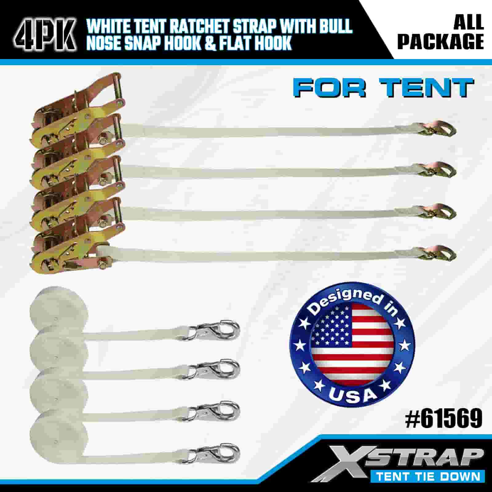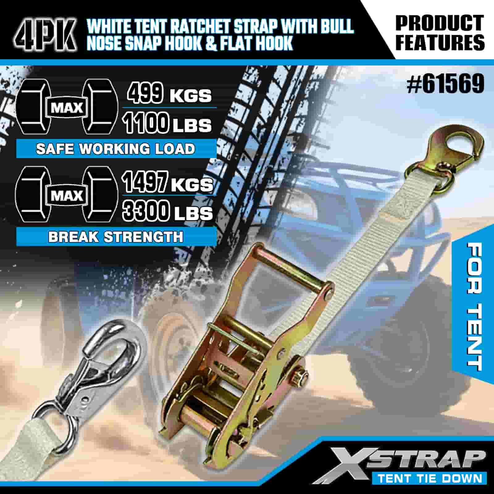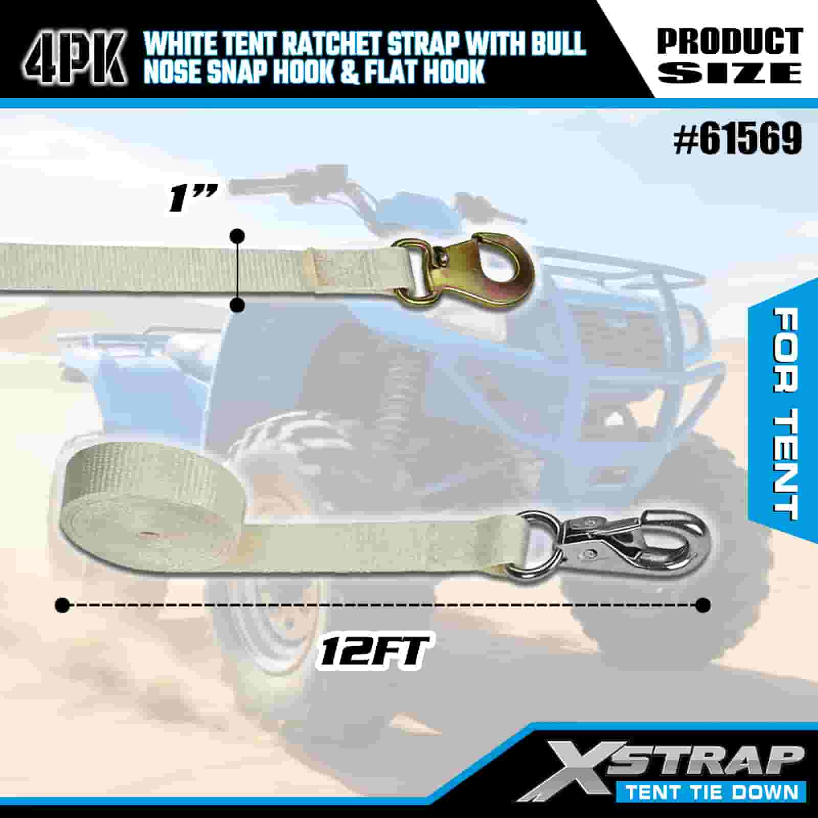 Xstrap 4PK witte tentratelriem met karabijnhaak met bull-nose en platte haak, 1 "x 12' polyester spanband met ratelriem, 1100 lbs capaciteit vrachtspanbanden met neus-karabijnhaak en platte haak voor ladingcontrole, tentbevestiging.