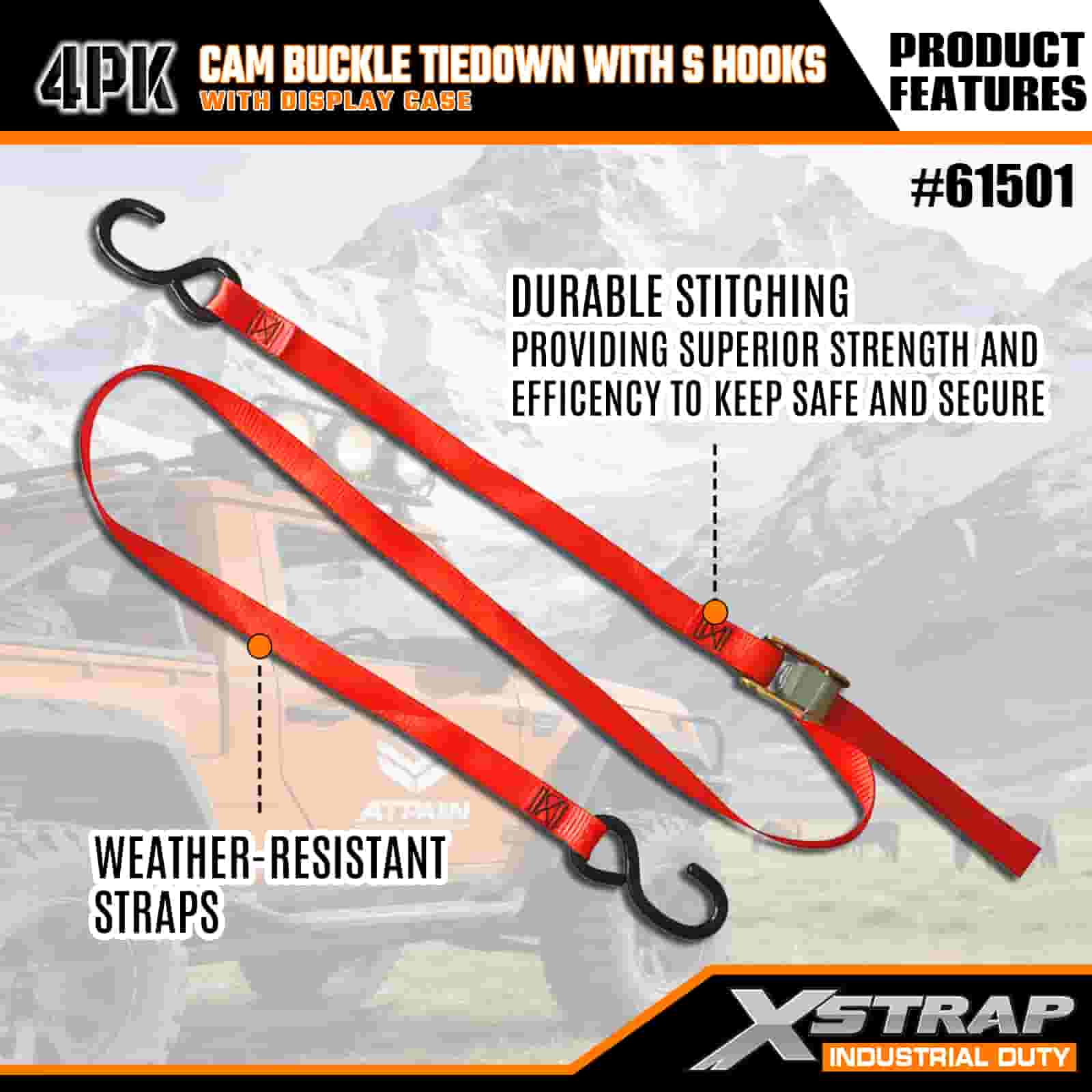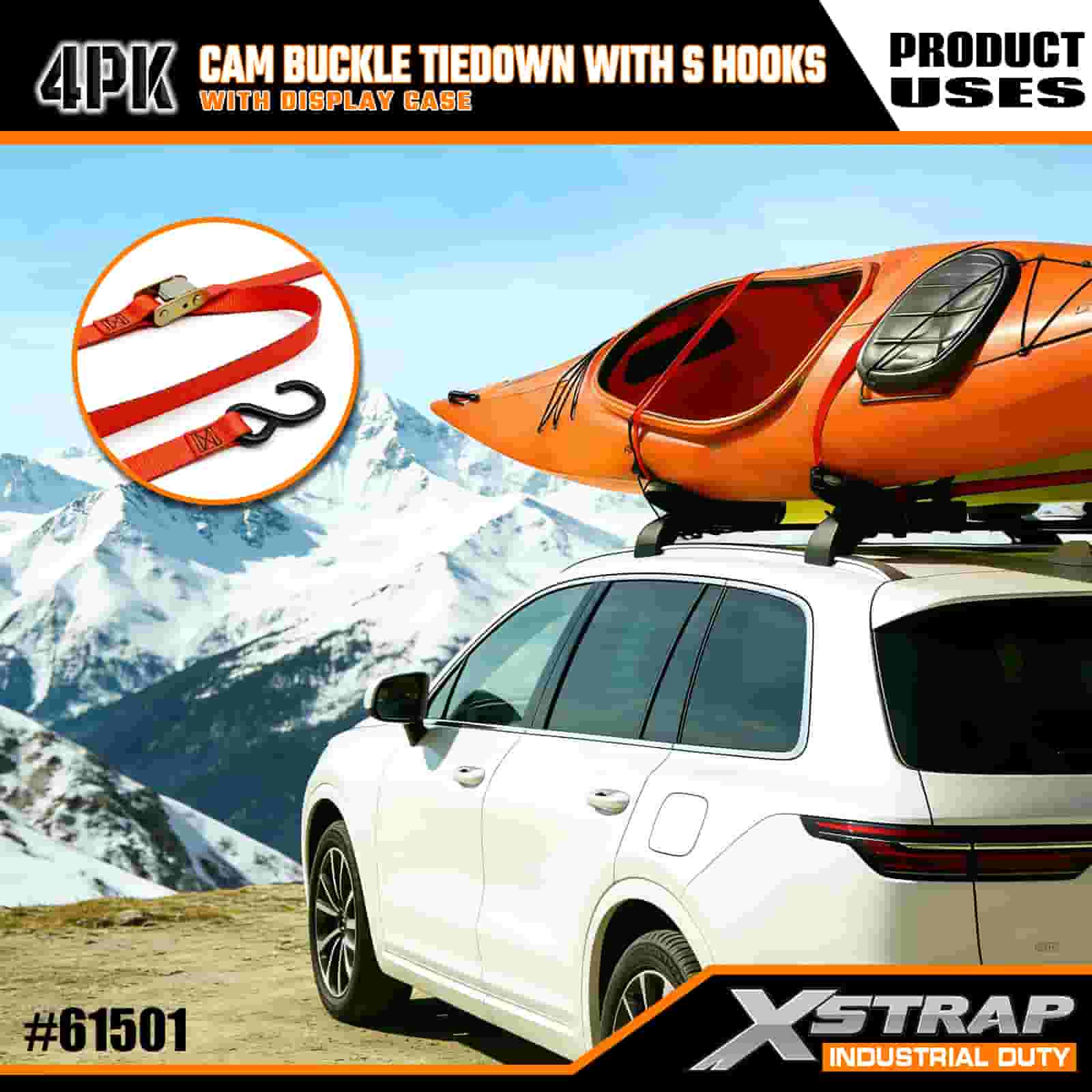 - Praktisch 4-pack met vitrine: verkocht in een set van 4 (met displayverpakking) voor batchgebruik, en elke riem is 2 inch breed x 1,80 meter lang, wat ideaal is voor het vastzetten van items zoals kajaks, outdooruitrusting of vracht.