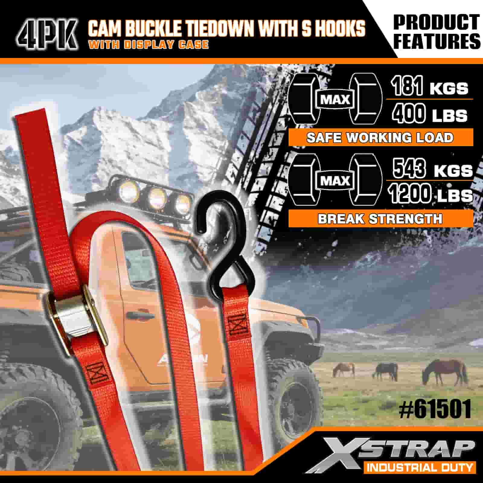 Xstrap 4-pack Cam Buckle Tie Down met S-haken, 2" x 6' polyester spanband met nokgesp, 400 lbs capaciteit ladingspanbanden met S-haken voor de serieuze professional om vrachttrailer, dieplader, skiboot, kleine auto vast te zetten.
