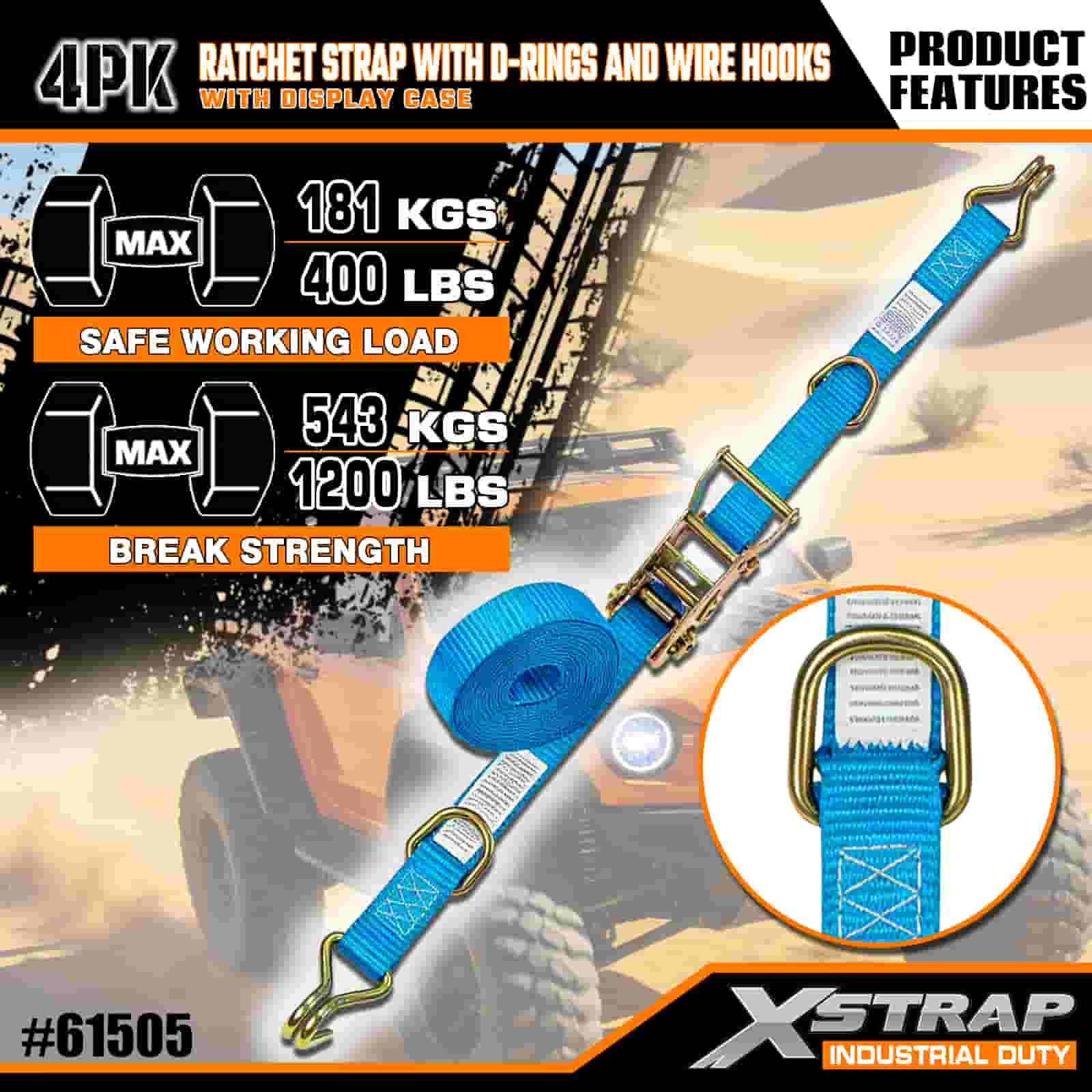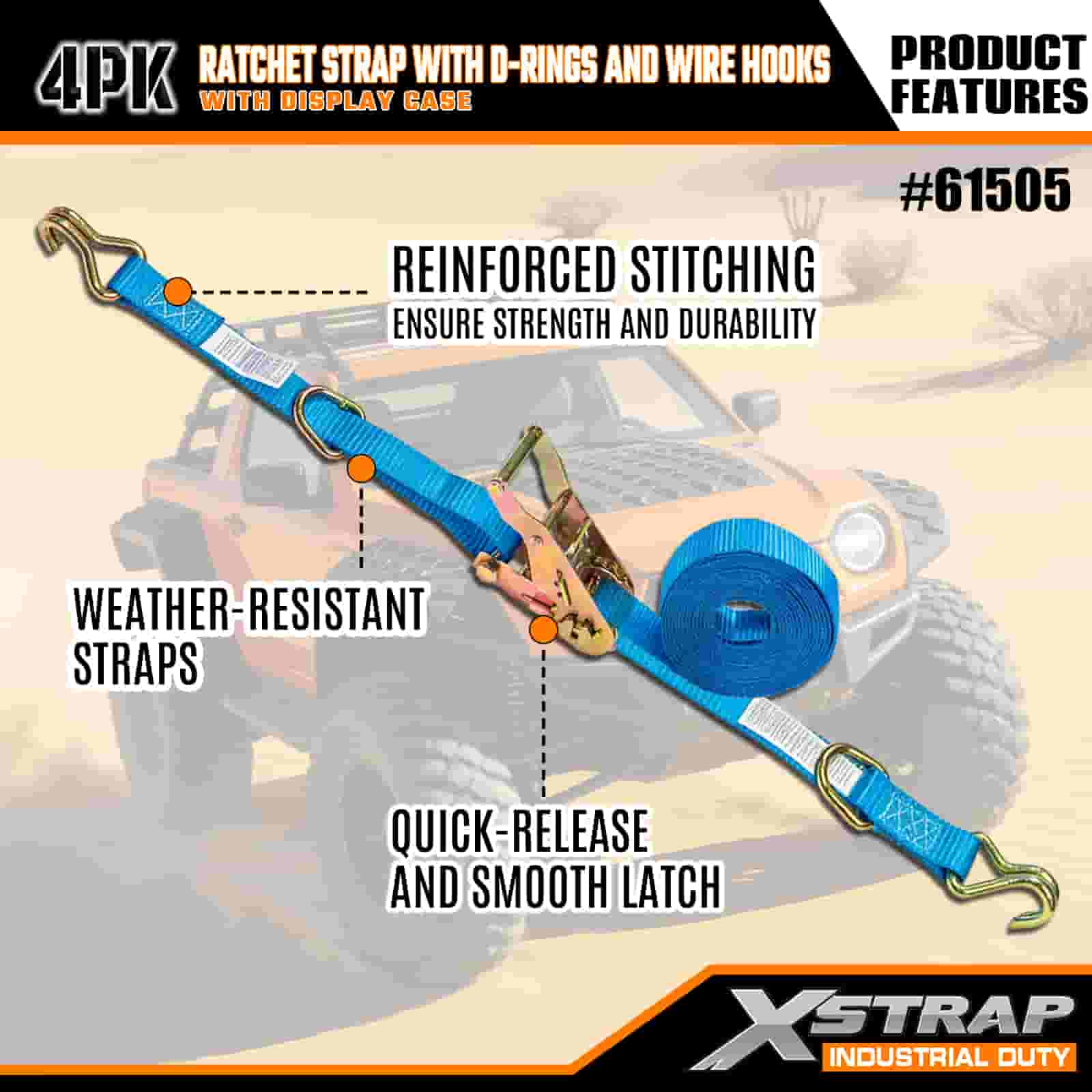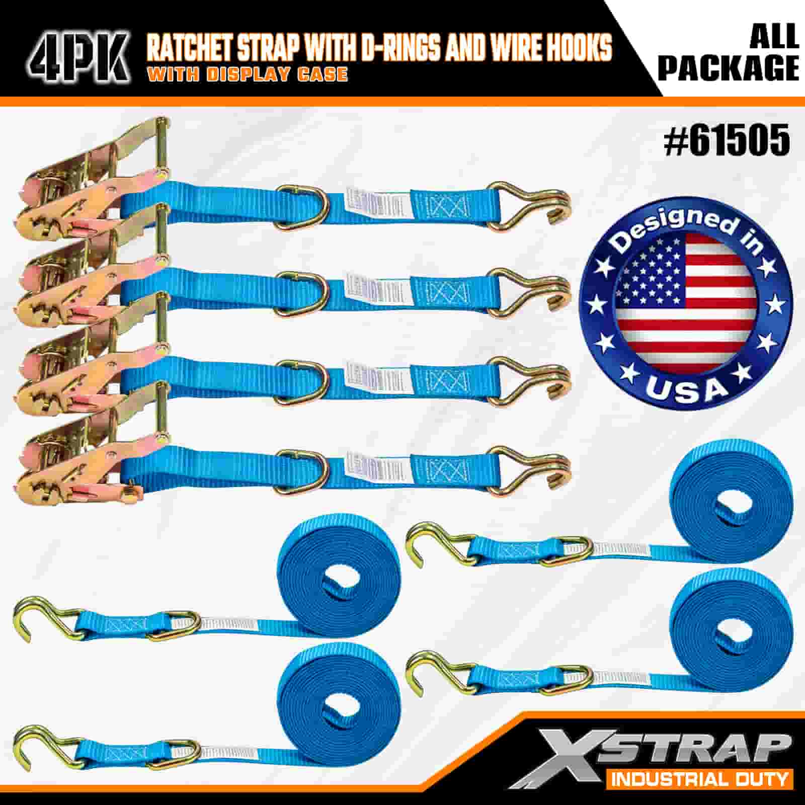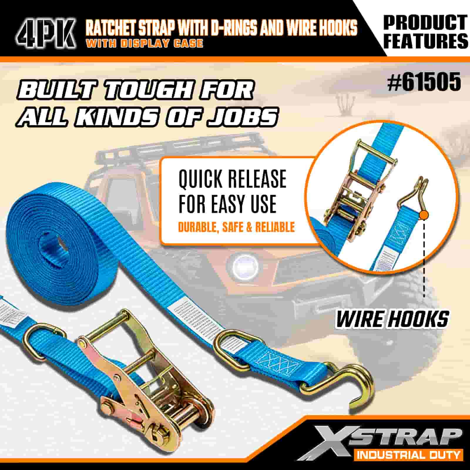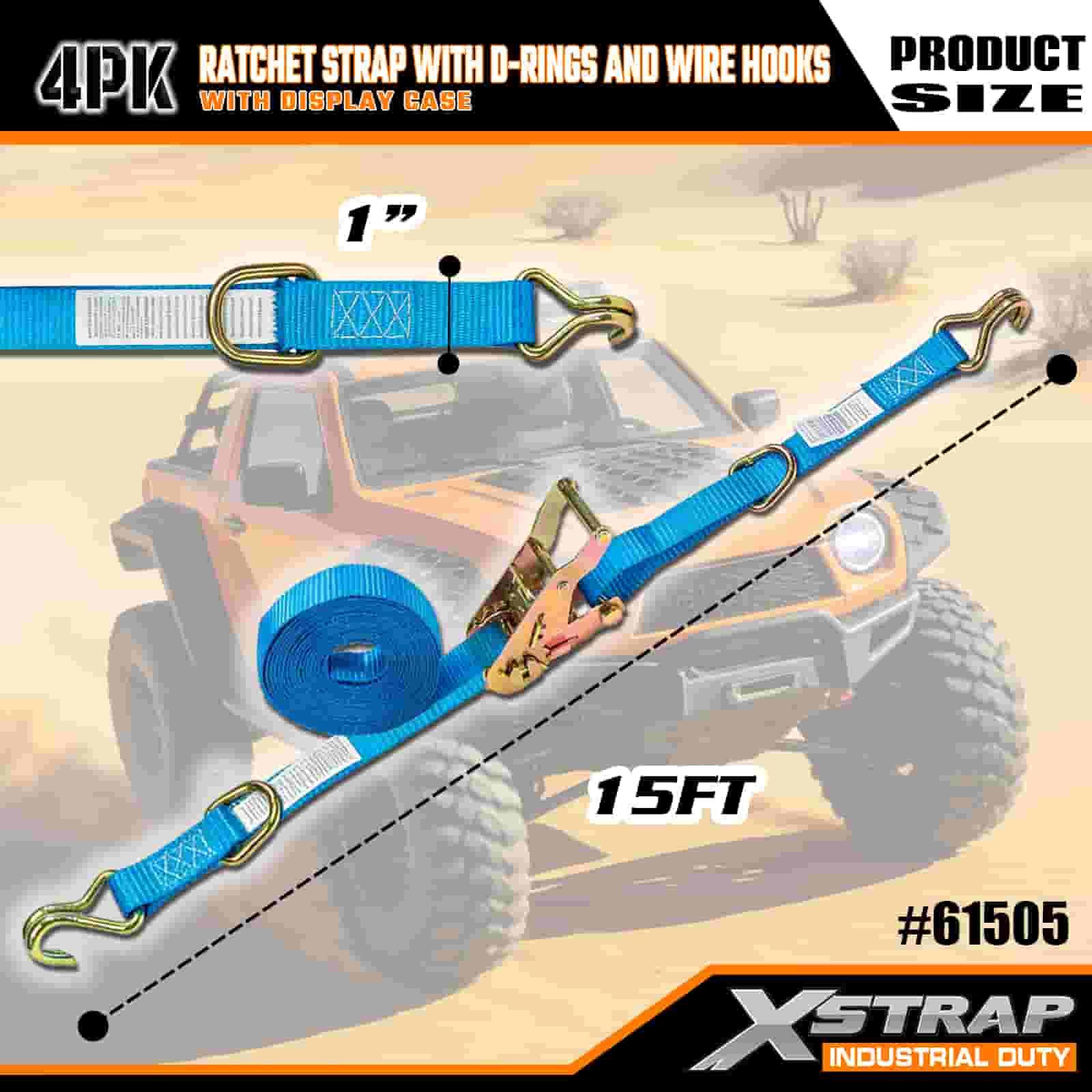 Xstrap 4-pack Cam Buckle Tie Down met D-ring en draadhaken, 1 "x 15' polyester spanband Trek-ratelband, 400 lbs capaciteit Ladingspanbanden met draadhaken voor de serieuze professional om vrachttrailer, platbedtrailer, skiboot, kleine auto vast te zetten.