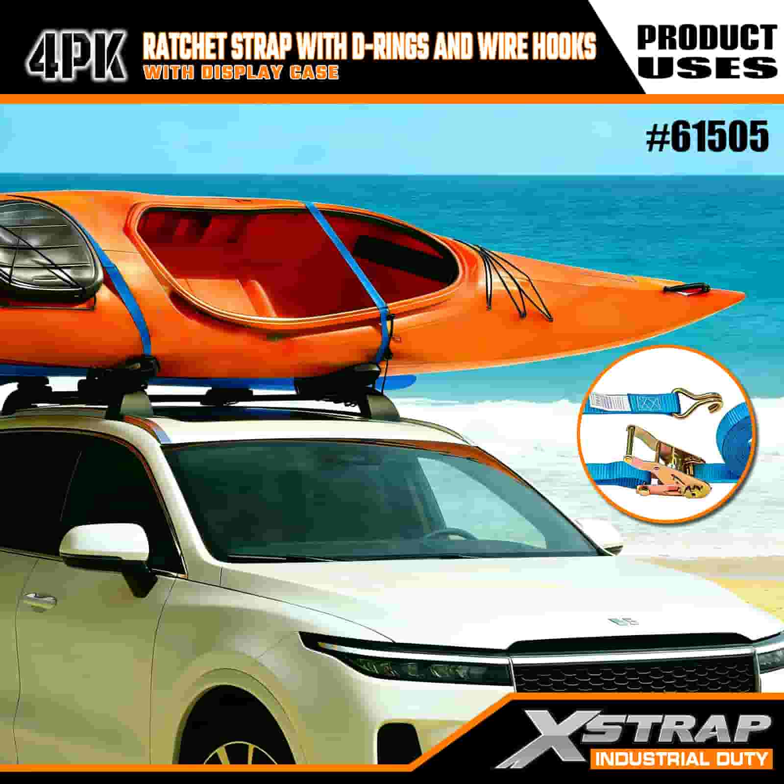 - Praktisch 4-pack met vitrine: verkocht in een set van 4 (met displayverpakking) voor batchgebruik, en elke riem is 2,5 cm breed x 4,5 meter lang - ideaal voor het vastzetten van items zoals kajaks, outdooruitrusting of zware lading.