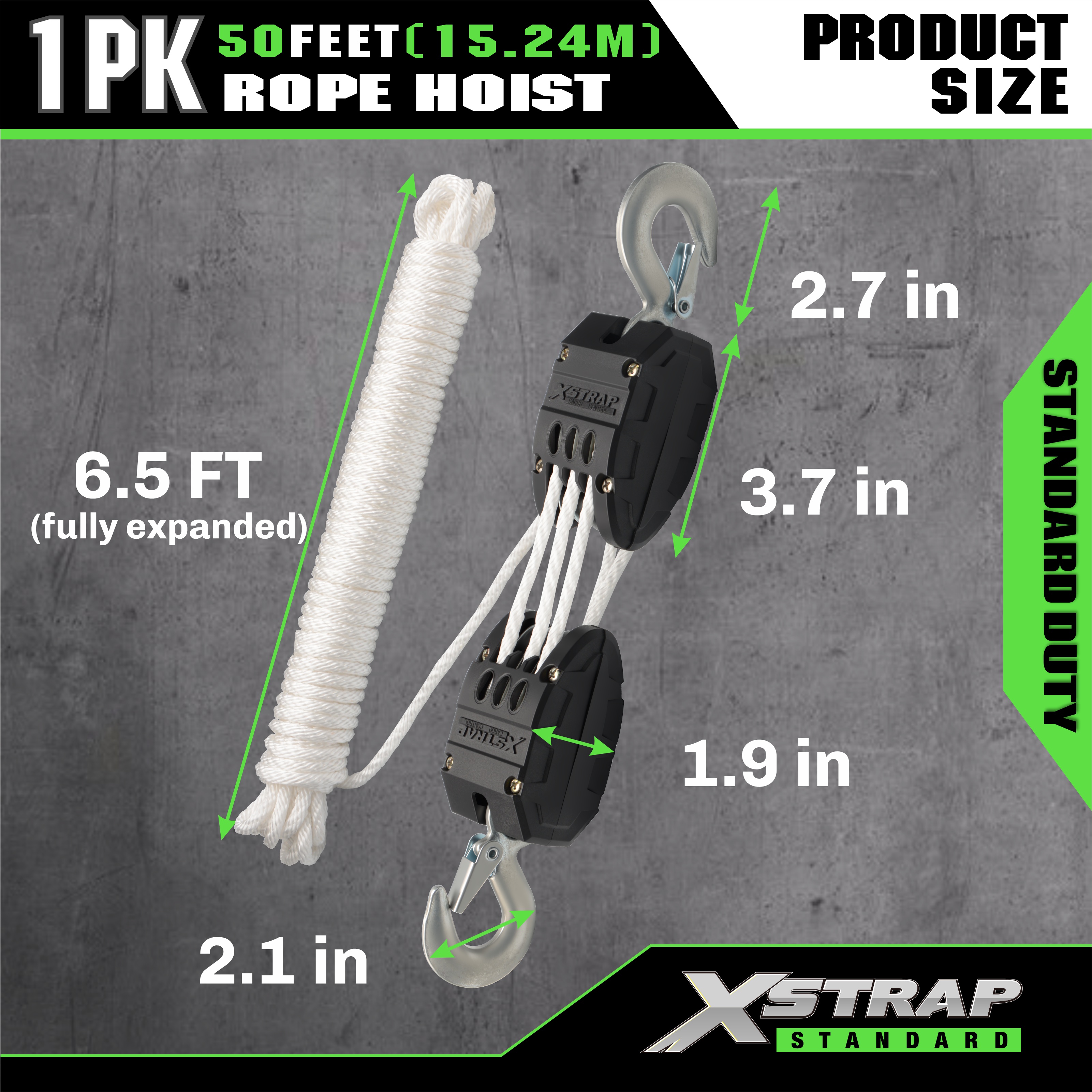 Dit is het Xstrap standaard touwtakelsysteem. De capaciteit is 1000 lbs, de breeksterkte is 2000 lbs. 5:1 hefvermogen 50ft zwaar uitgevoerd katrolblok voor de jacht, tillen van zware voorwerpen met antislipwerkhandschoenen, 2 stuks zachte lussen.