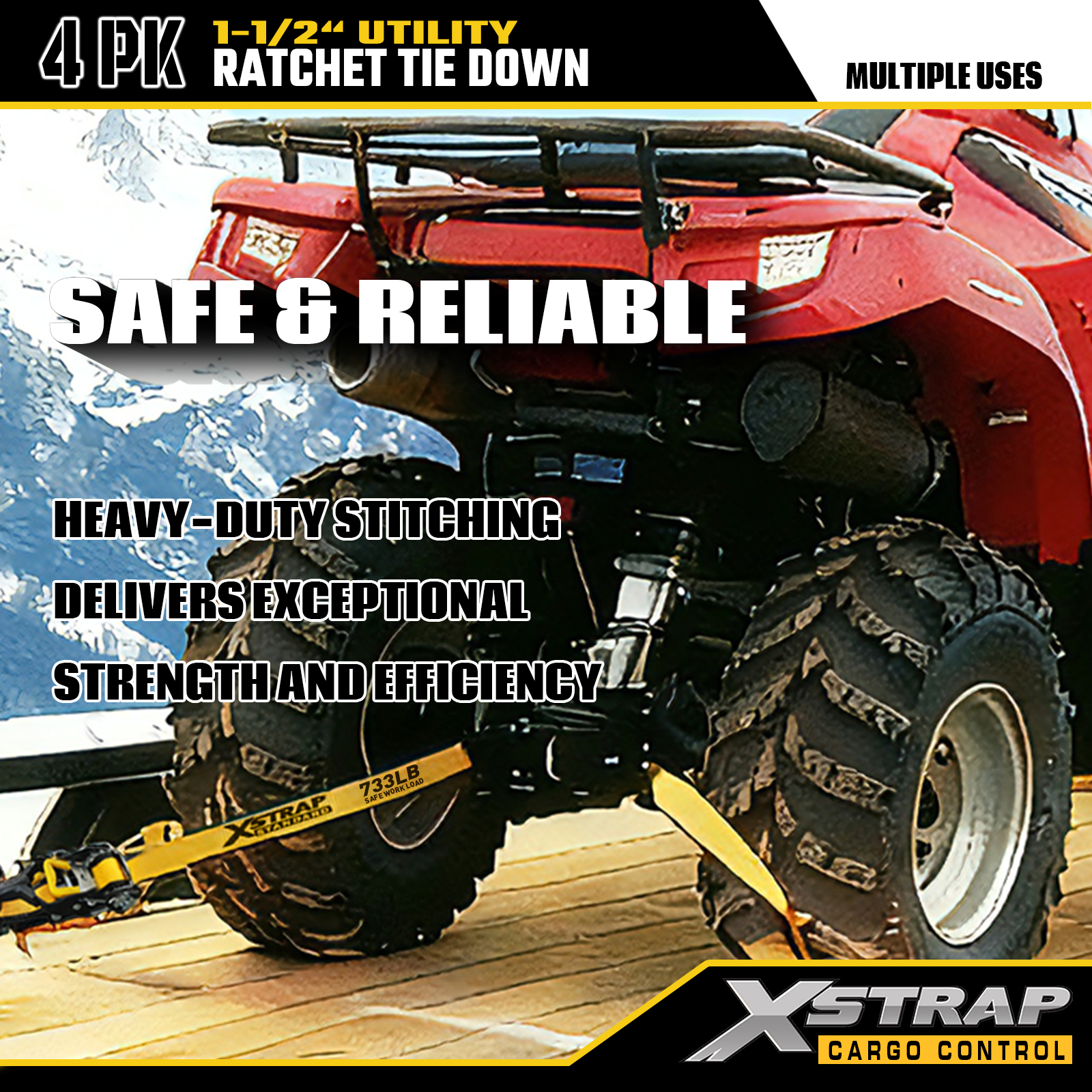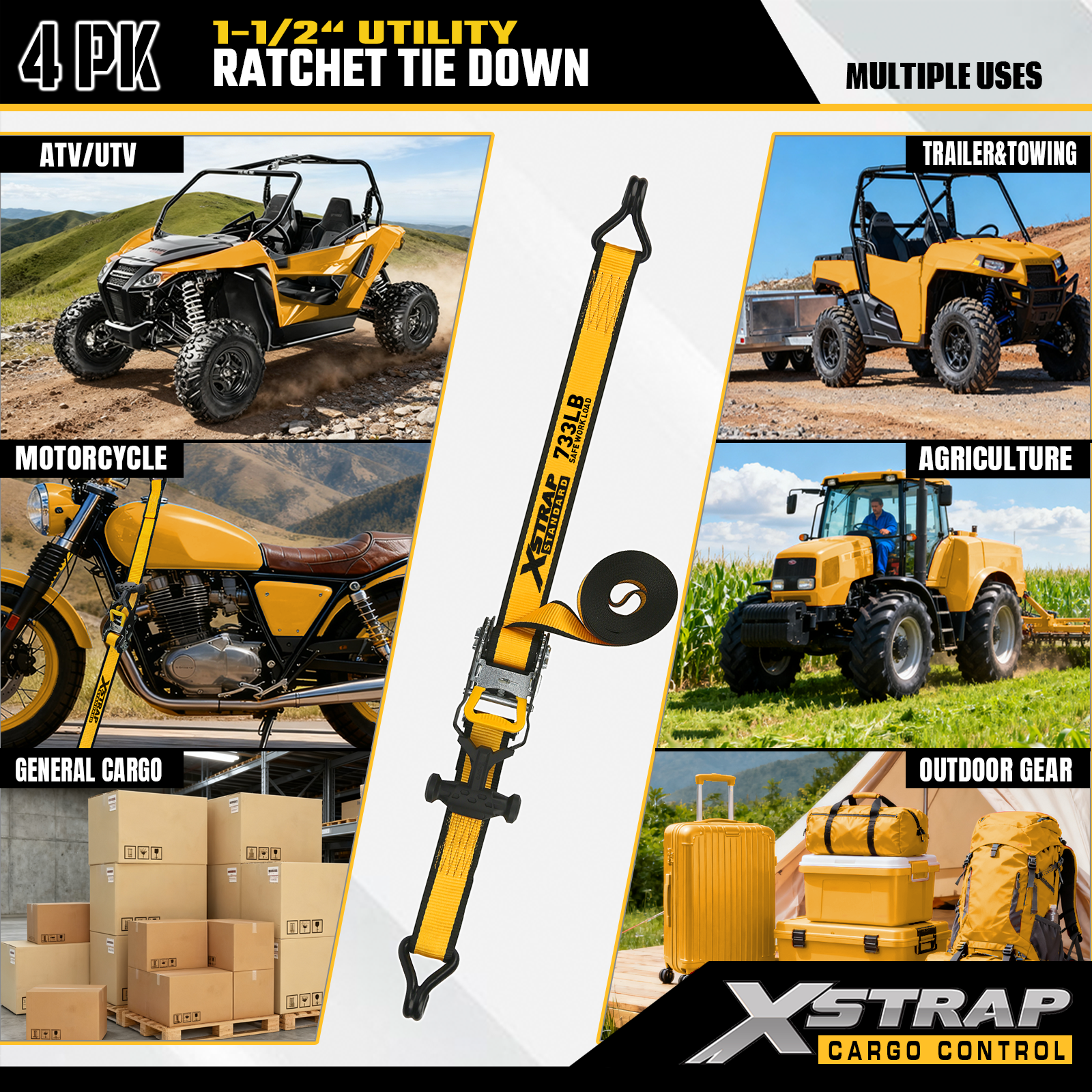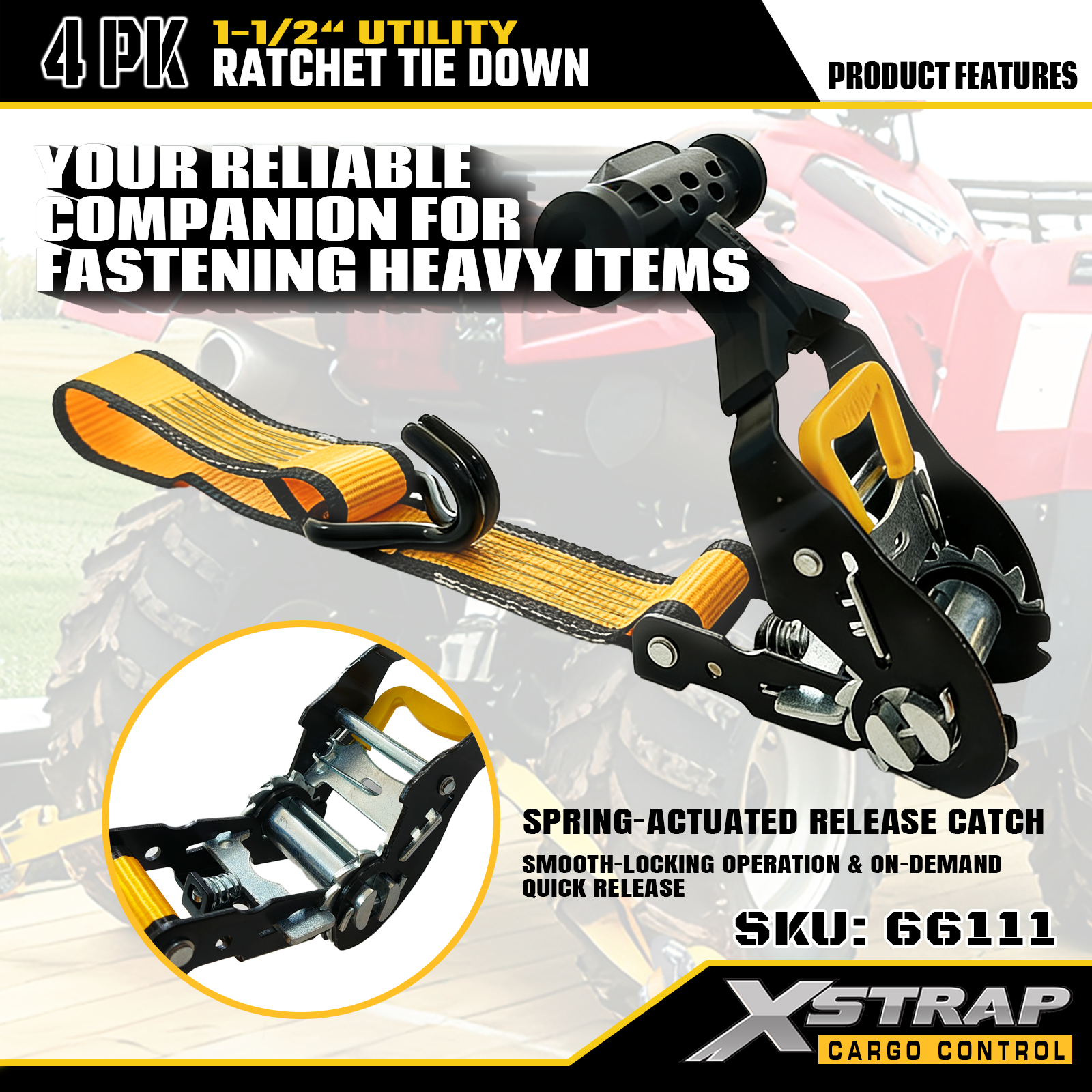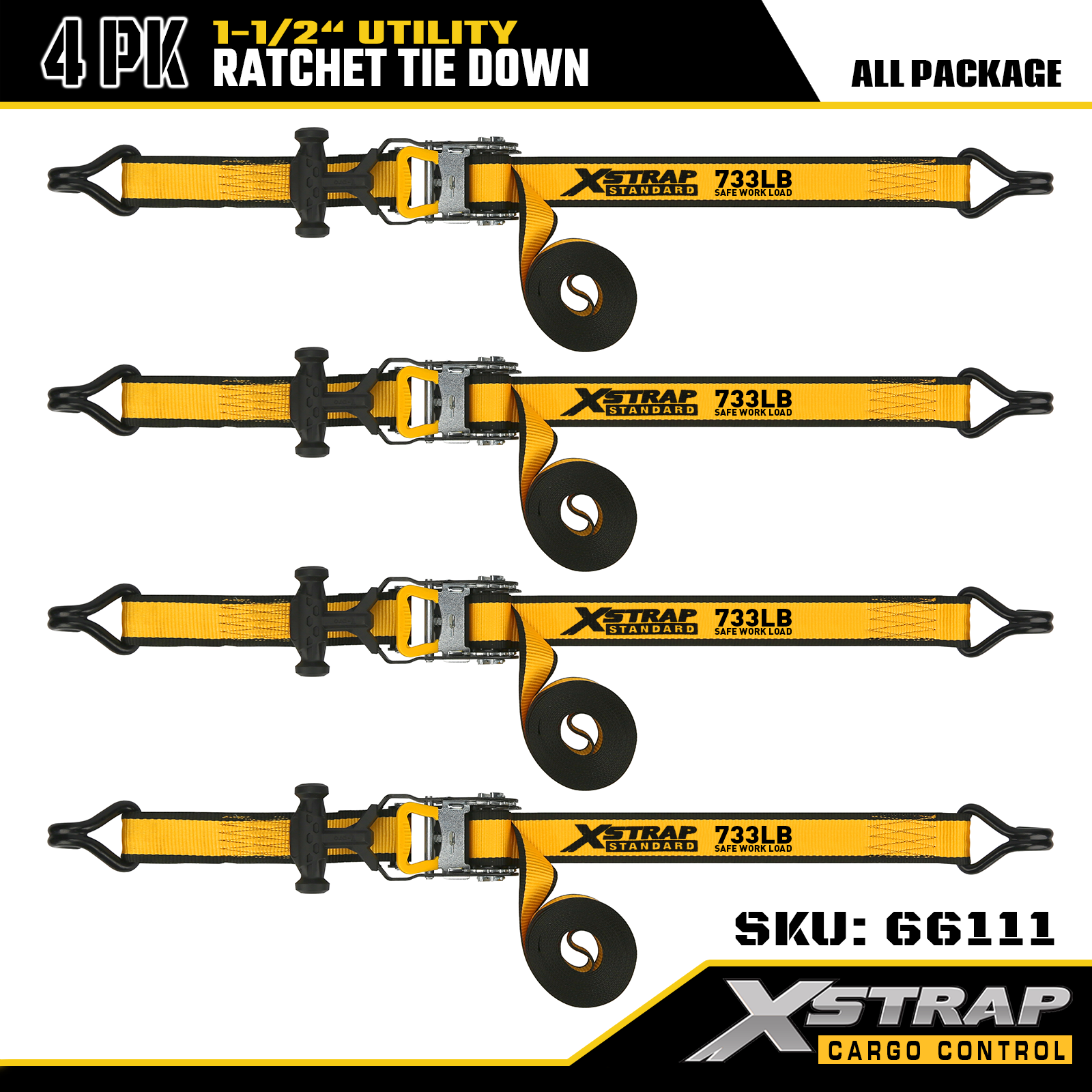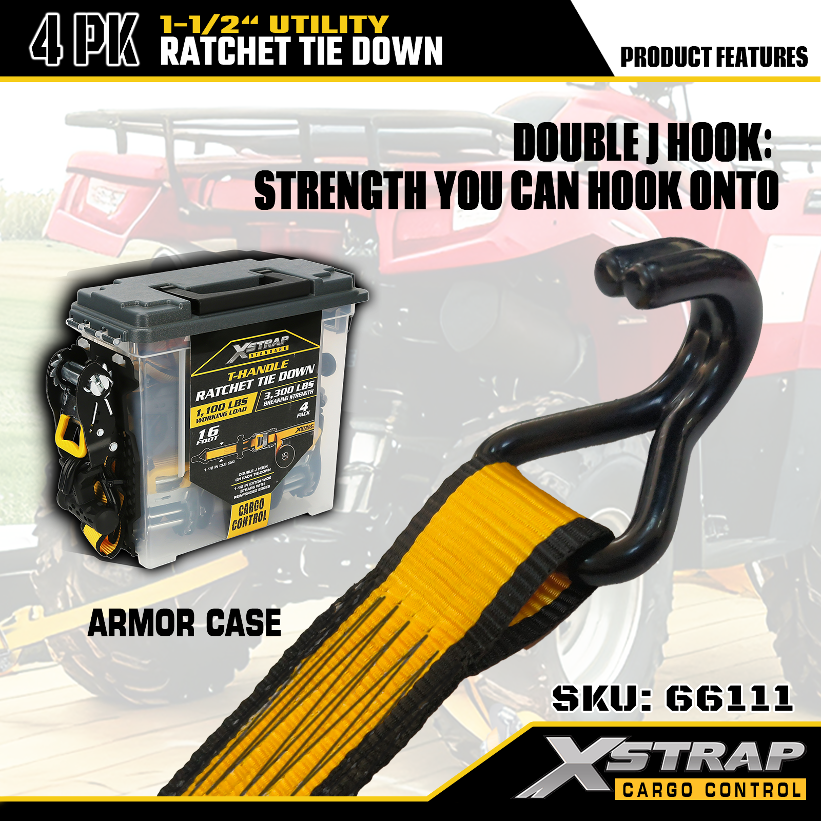 De Xstrap T-Handle Ratelbinder is 1,5 inch x 16 ft, de veilige werklast is 1.100 lbs en de breeksterkte is 3.300 lbs.