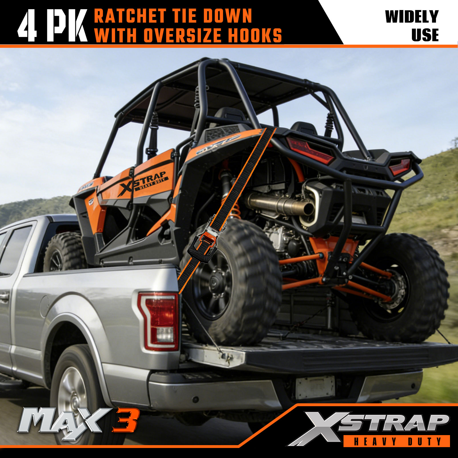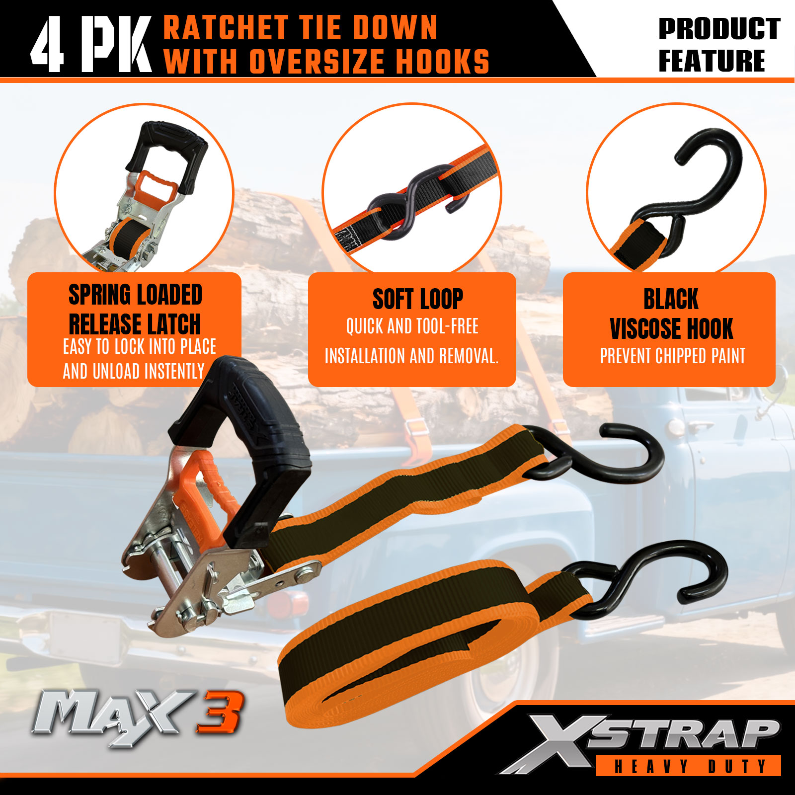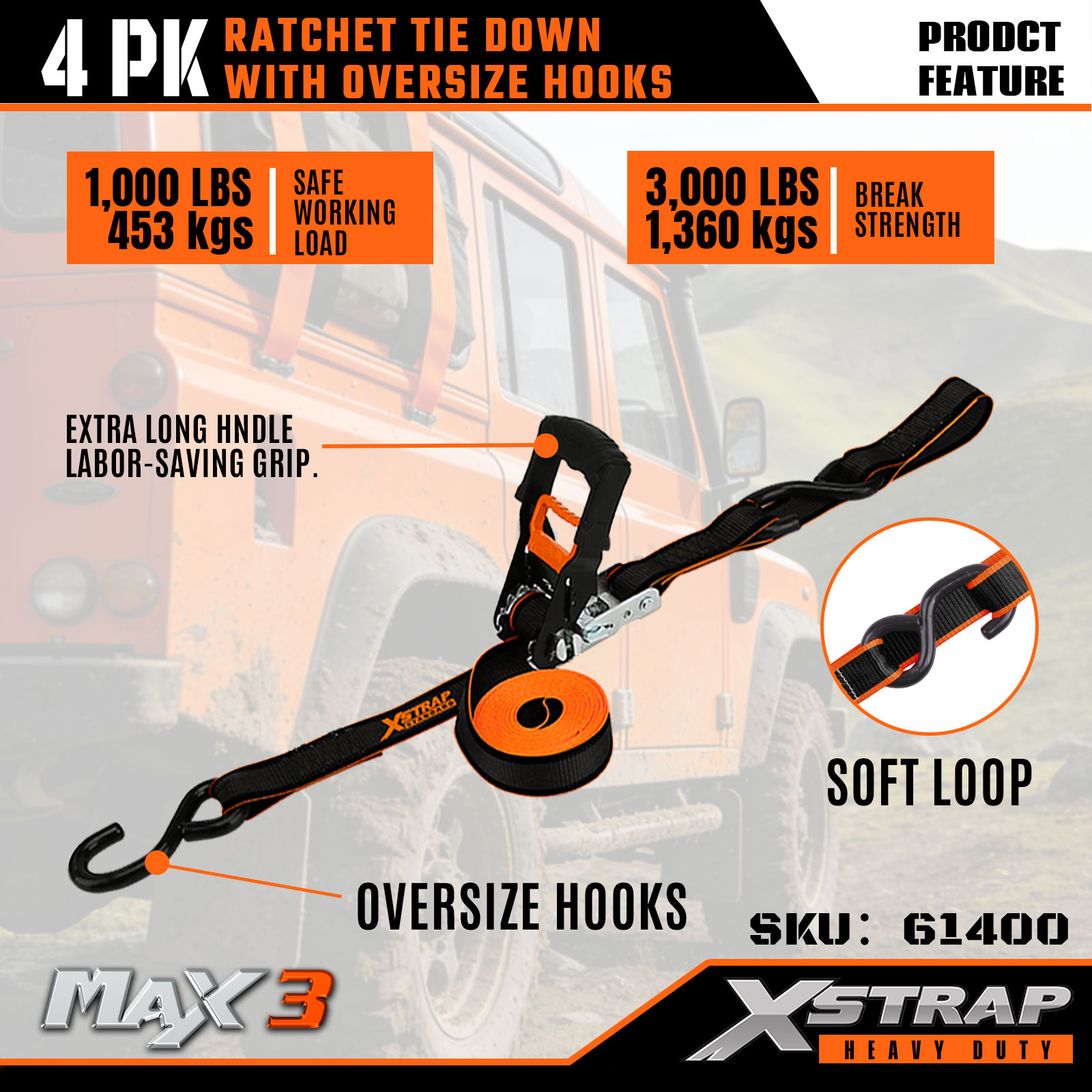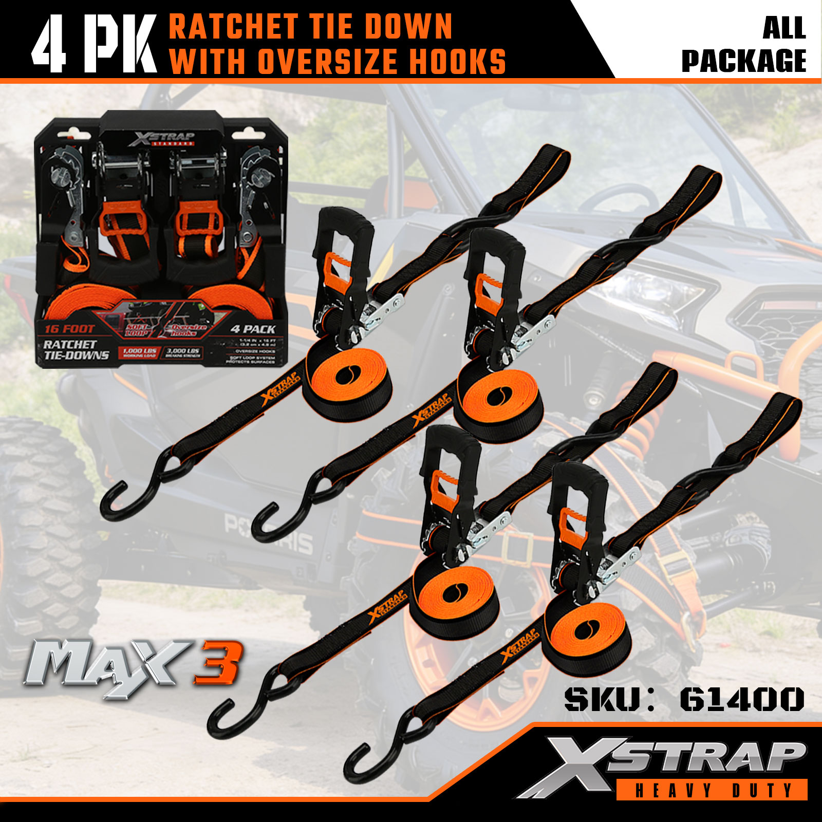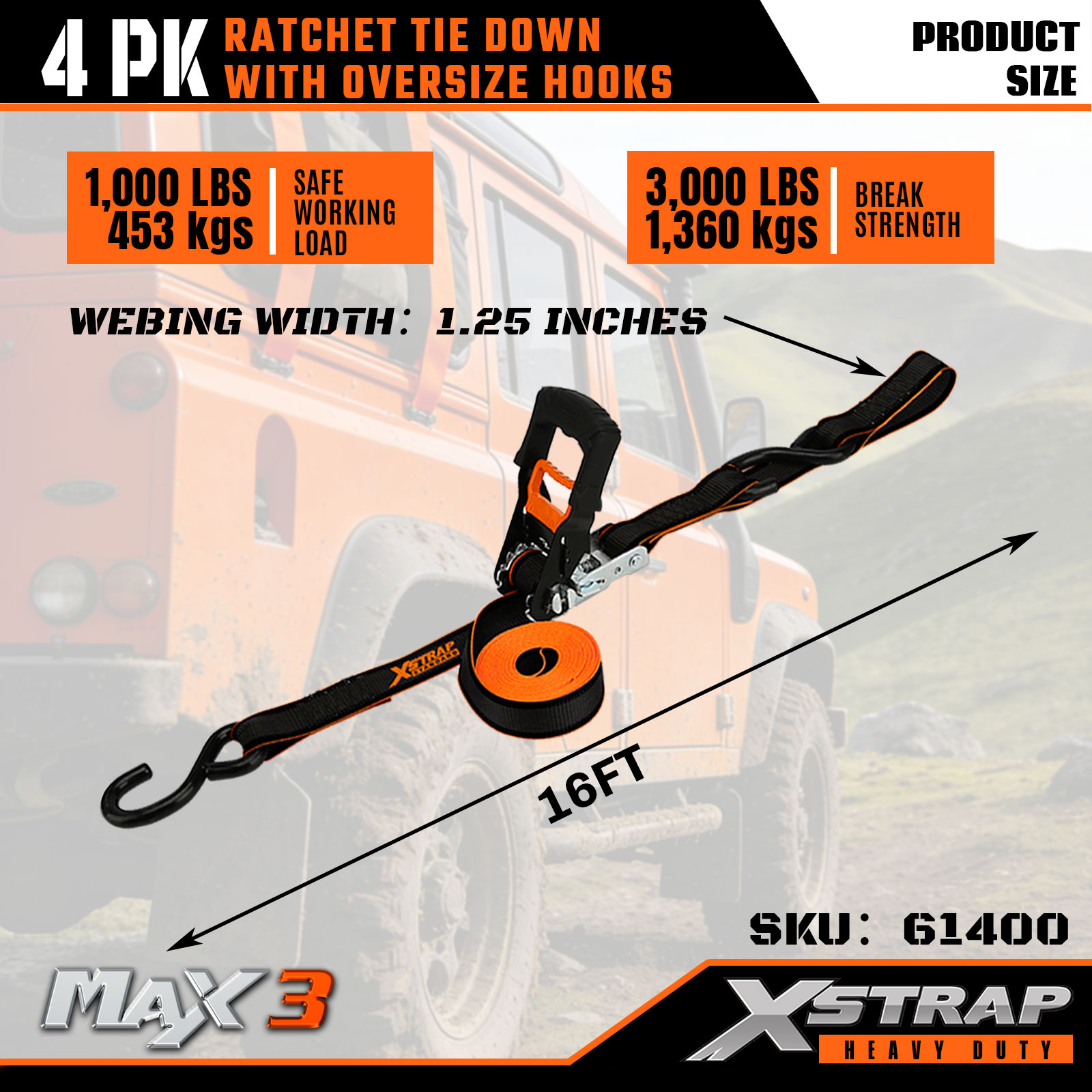 Xstrap 4-pack ratelspanbanden, 1-1/4" x 16' polyester spanband Trek-ratelband, 1000 lbs capaciteit vrachtspanbanden met dubbele J-haken voor pick-up, SUV, auto-toprekken, motorfiets, lichte vissersboot, jetski, sneeuwscooter, gazontractor.