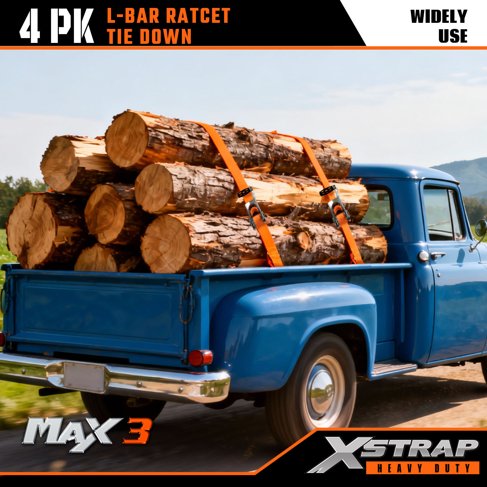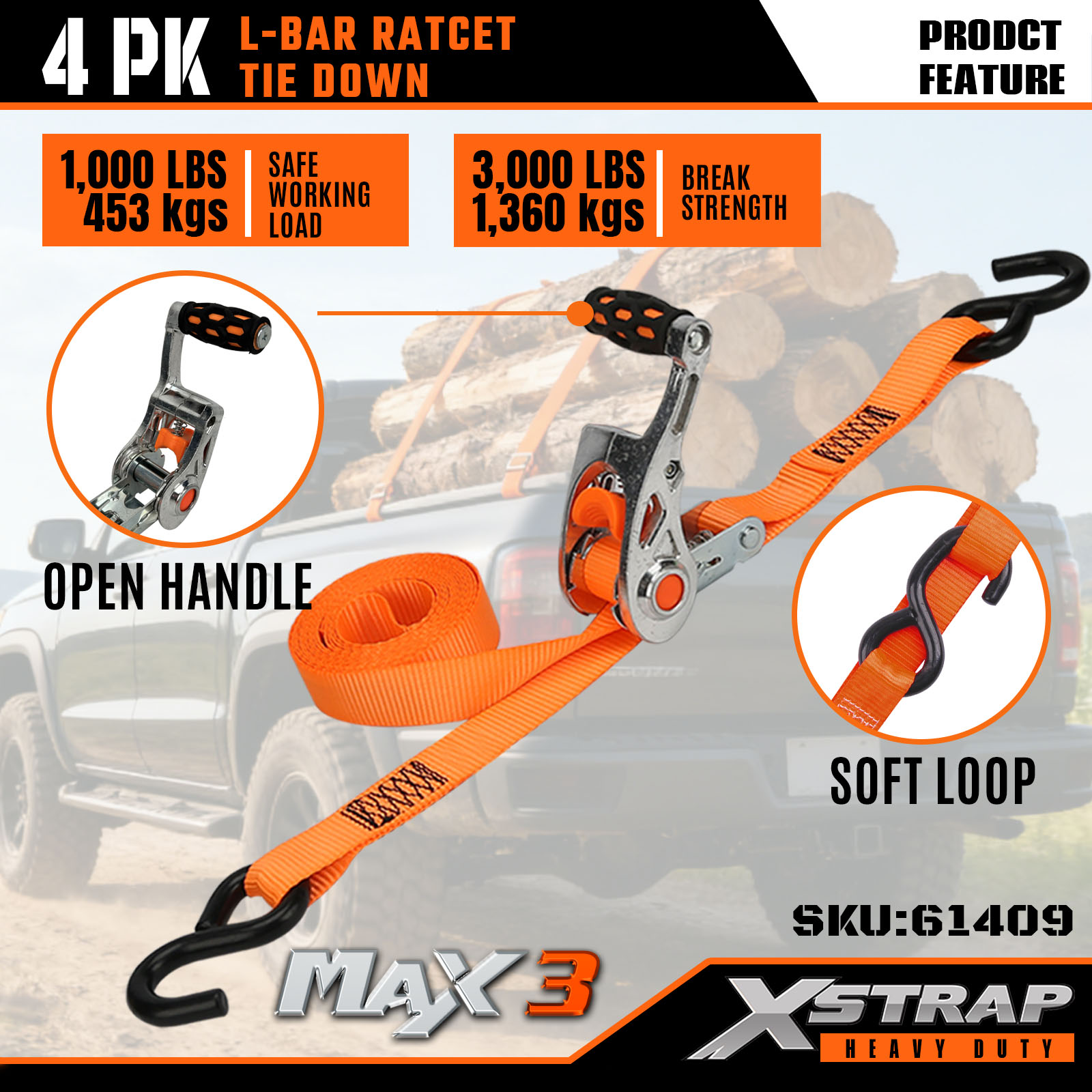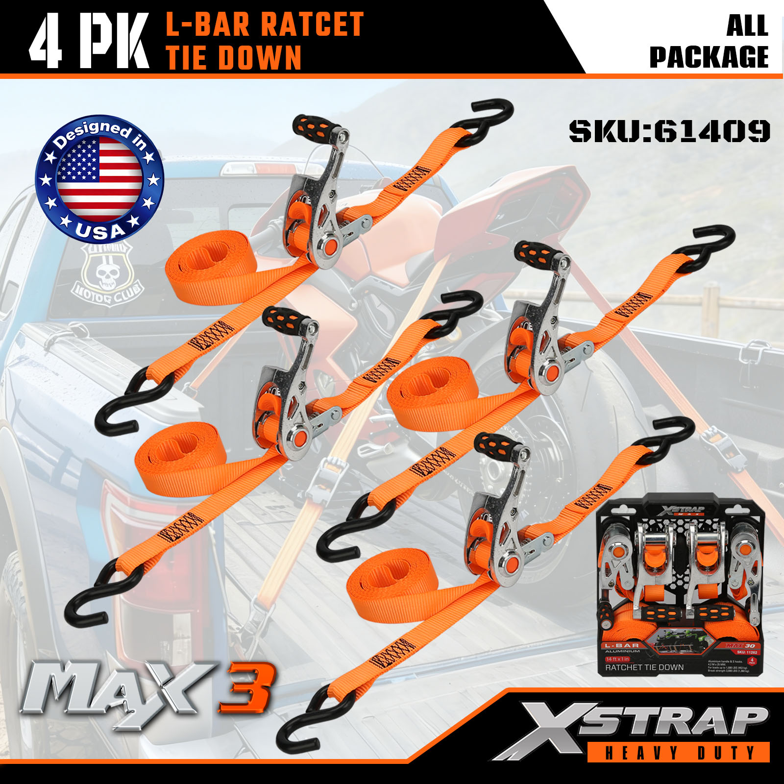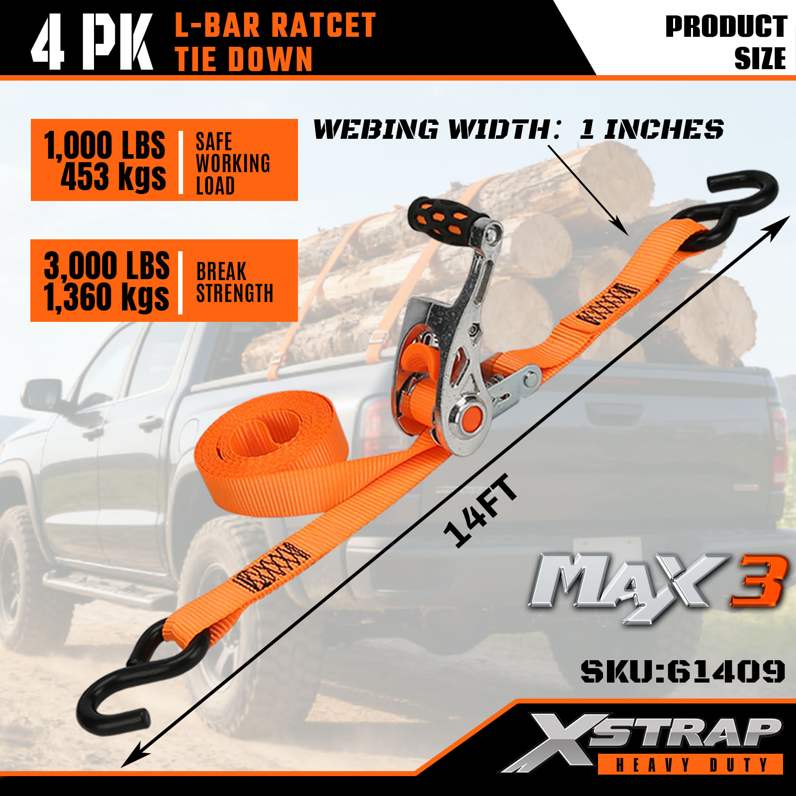 Xstrap 4 stuks L-stangspanbanden, 1" x 14' polyester spanband Trek-ratelband, capaciteit van 1000 lbs Ladingspanbanden met S-haken voor vrachtwagens, SUV's, auto-toprekken, motorfietsen.