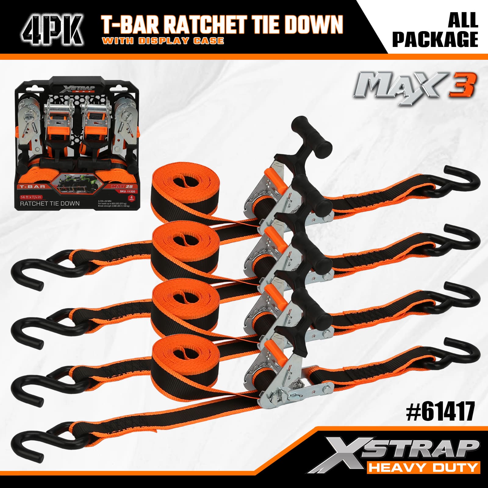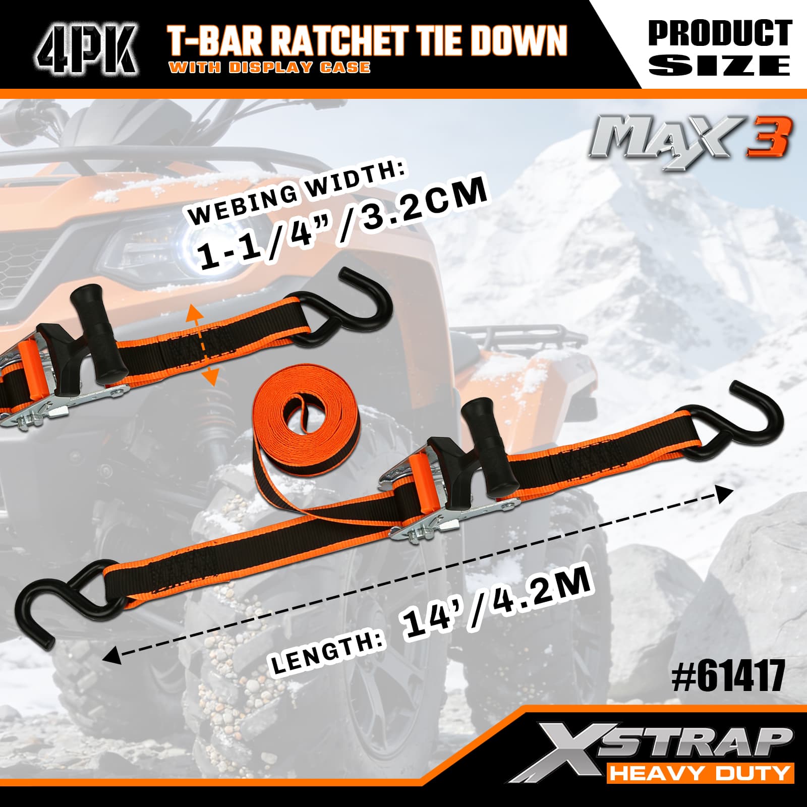 Xstrap 4-pack T-Max Grip-ratelspanbanden, 1-1/4" x 14' polyester spanband Trek-ratelband, capaciteit van 1000 lbs Ladingspanbanden met S-haken voor pick-up, SUV, auto-toprekken, motorfiets, lichte vissersboot, jetski, sneeuwscooter, gazontractor.