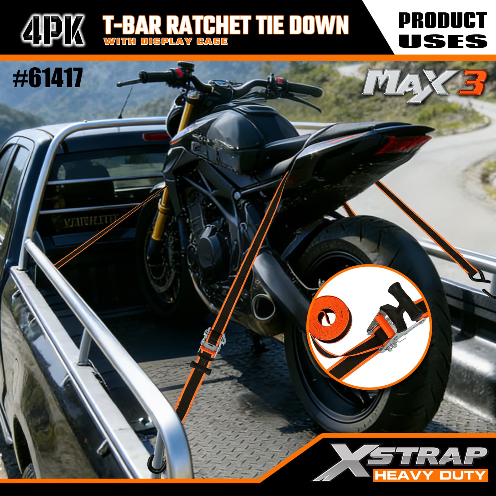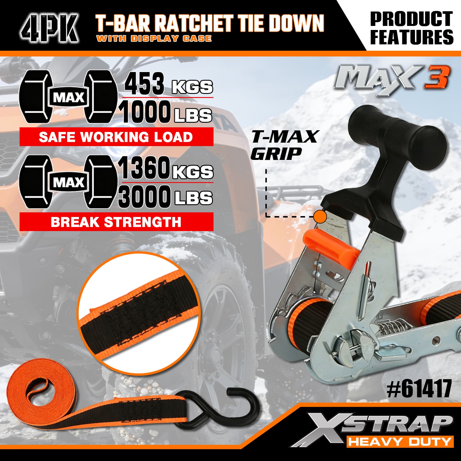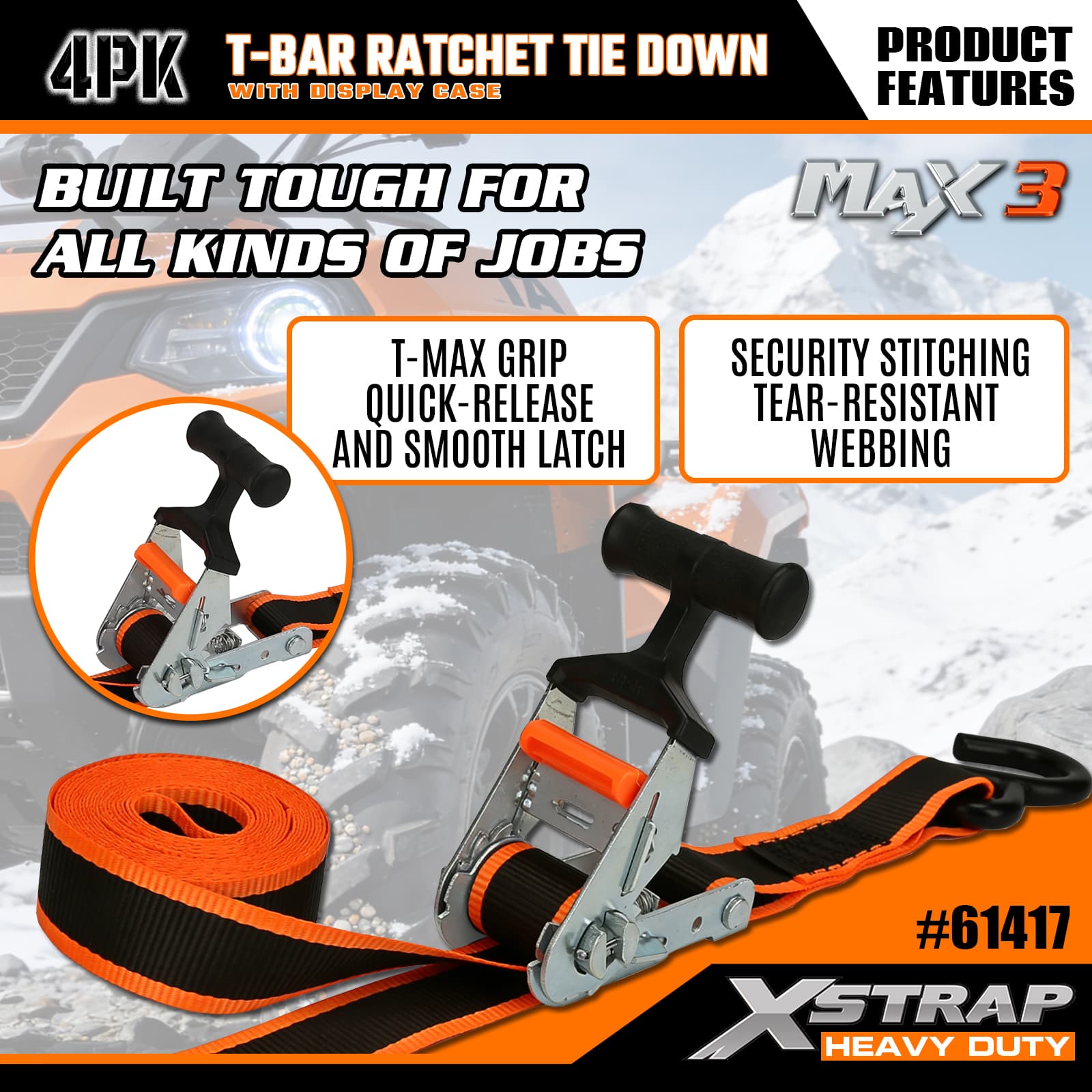 - Max Grip T-Bar-ratelmechanisme: Beschikt over een ergonomische T-bar-handgreep die een betere hefboomwerking biedt voor soepel en met weinig inspanning aanspannen - intuïtief te bedienen, zodat gebruikers van elk vaardigheidsniveau hun lading snel kunnen vastzetten.