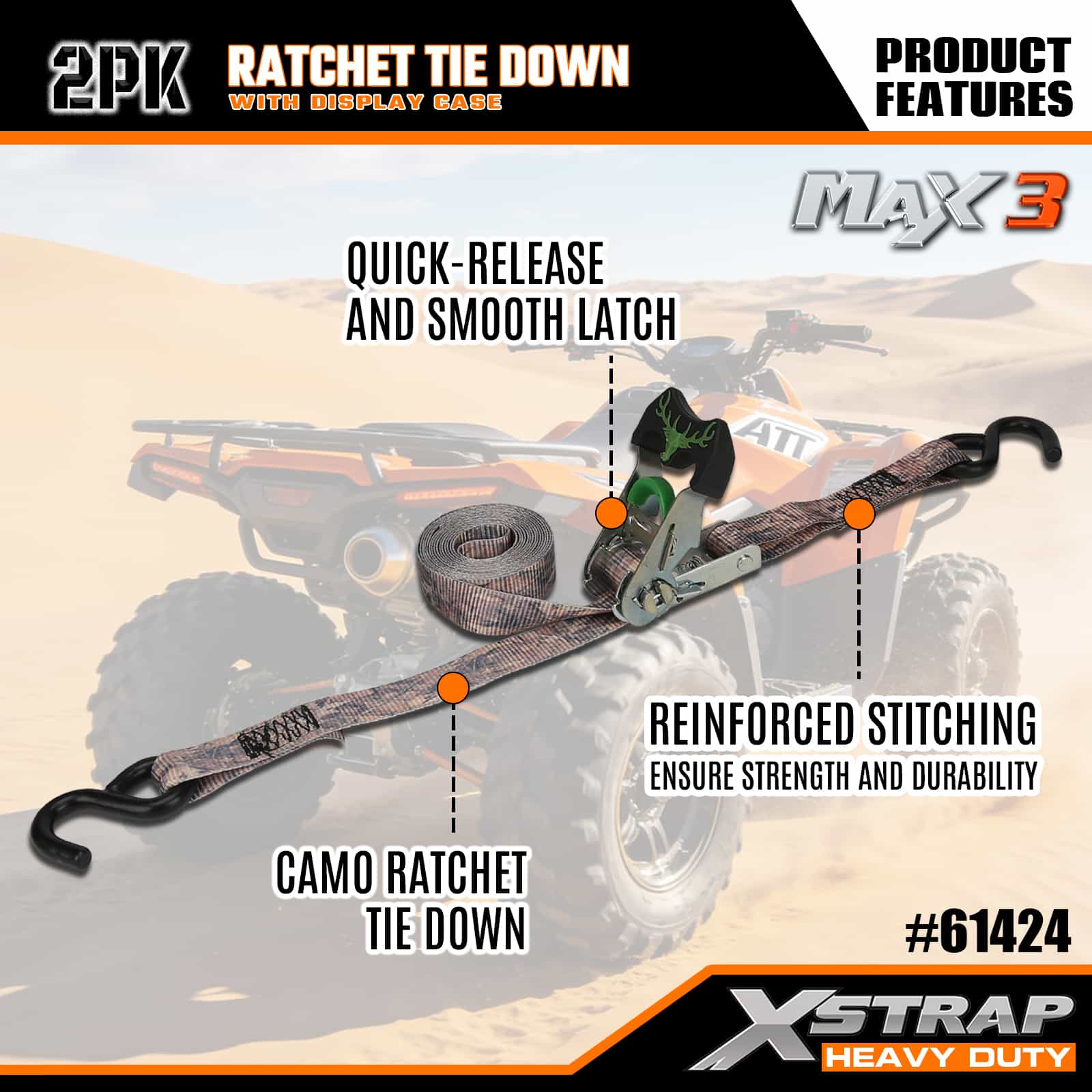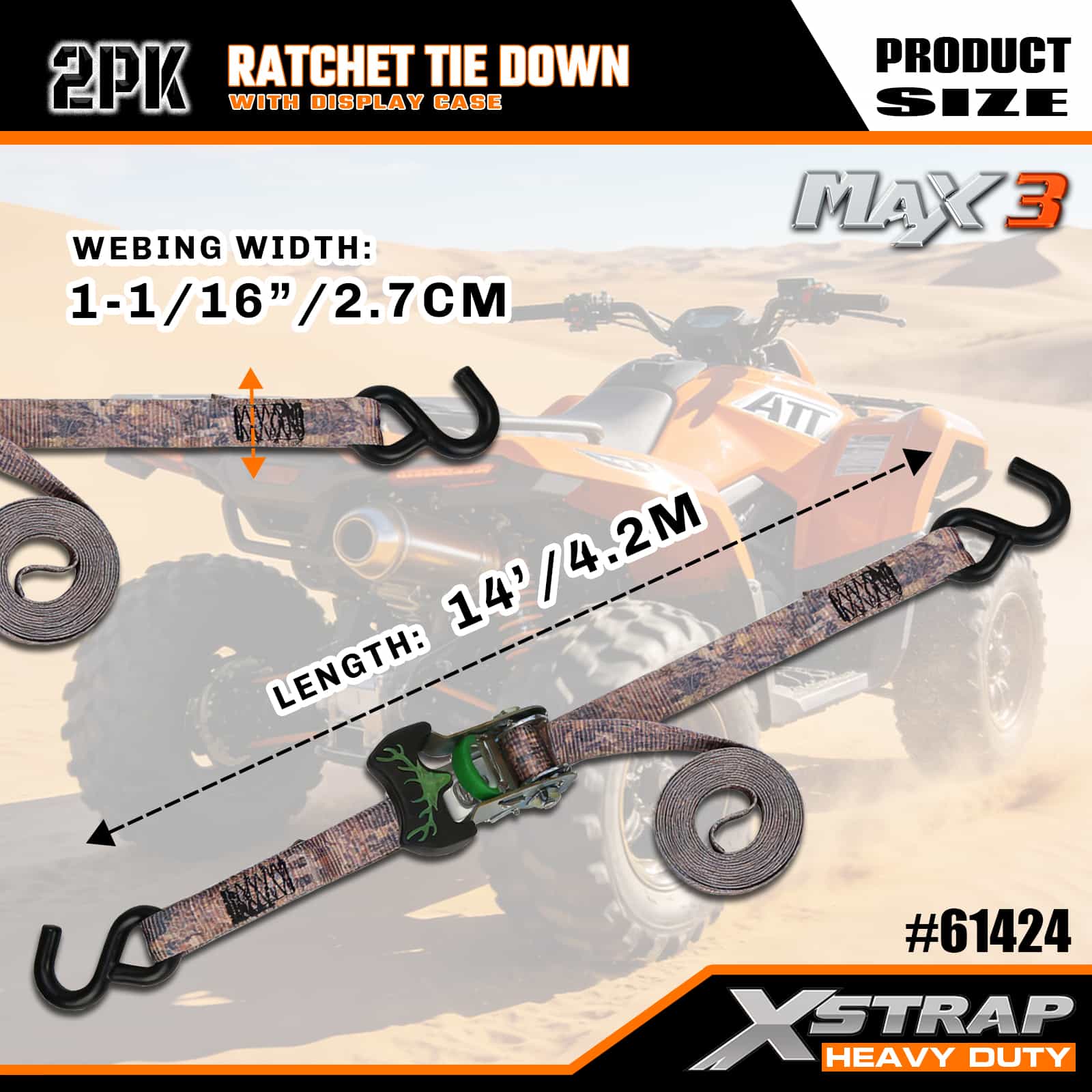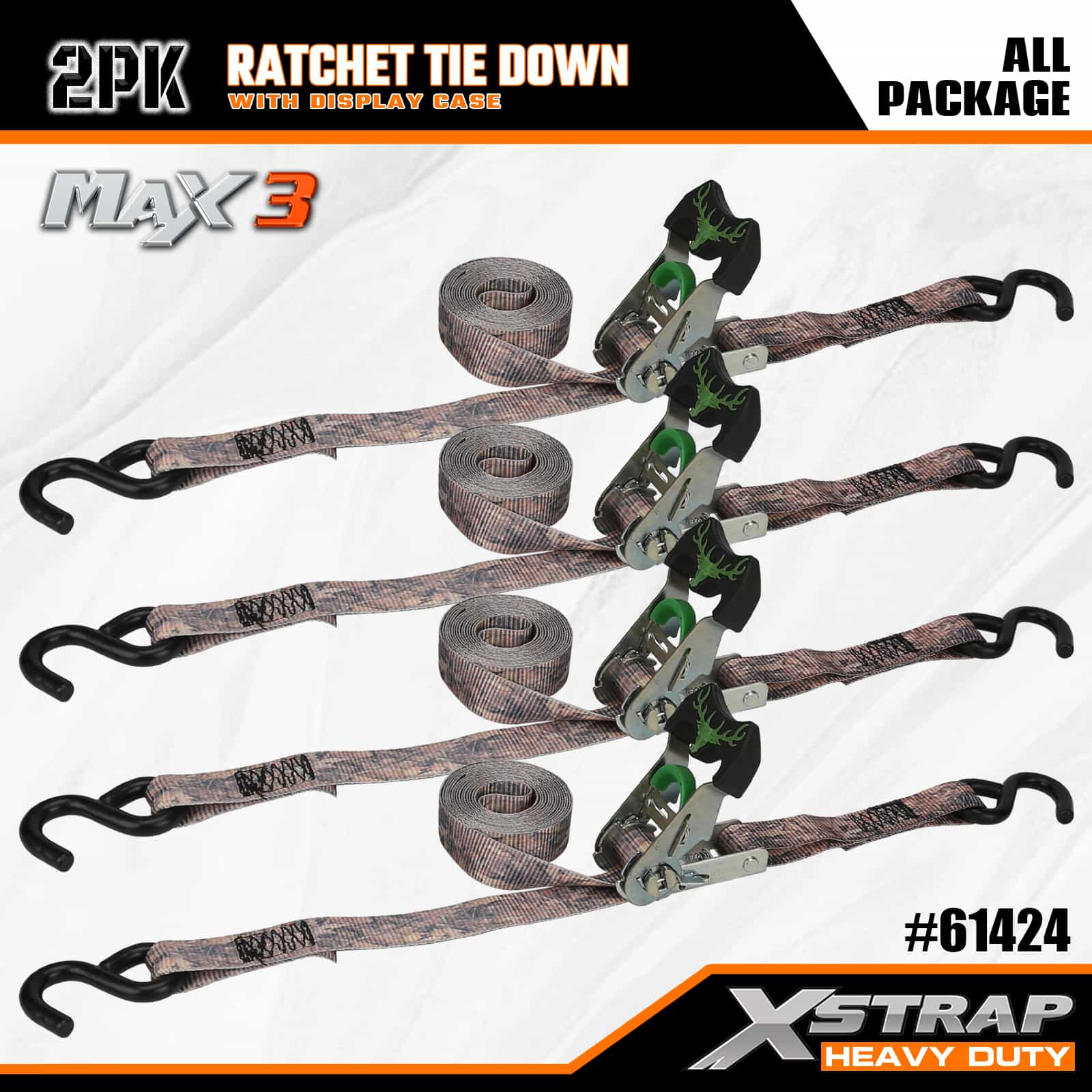 Xstrap 2-pack Camo-ratelspanbanden, 1-1/16 "x 14' polyester spanband Trek-ratelband, capaciteit van 1000 lbs Ladingspanbanden met S-haken voor pick-up, SUV, auto-toprekken, motorfiets, lichte vissersboot, jetski, sneeuwscooter, gazontractor.