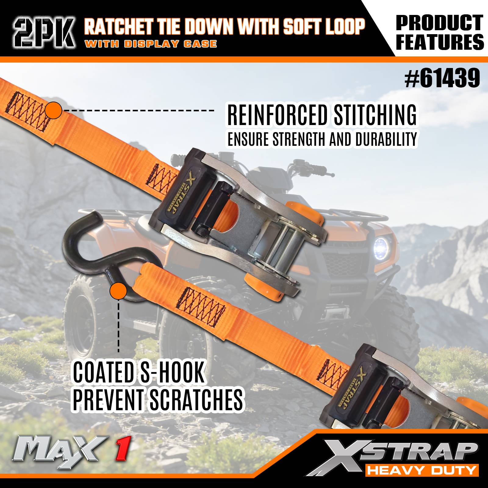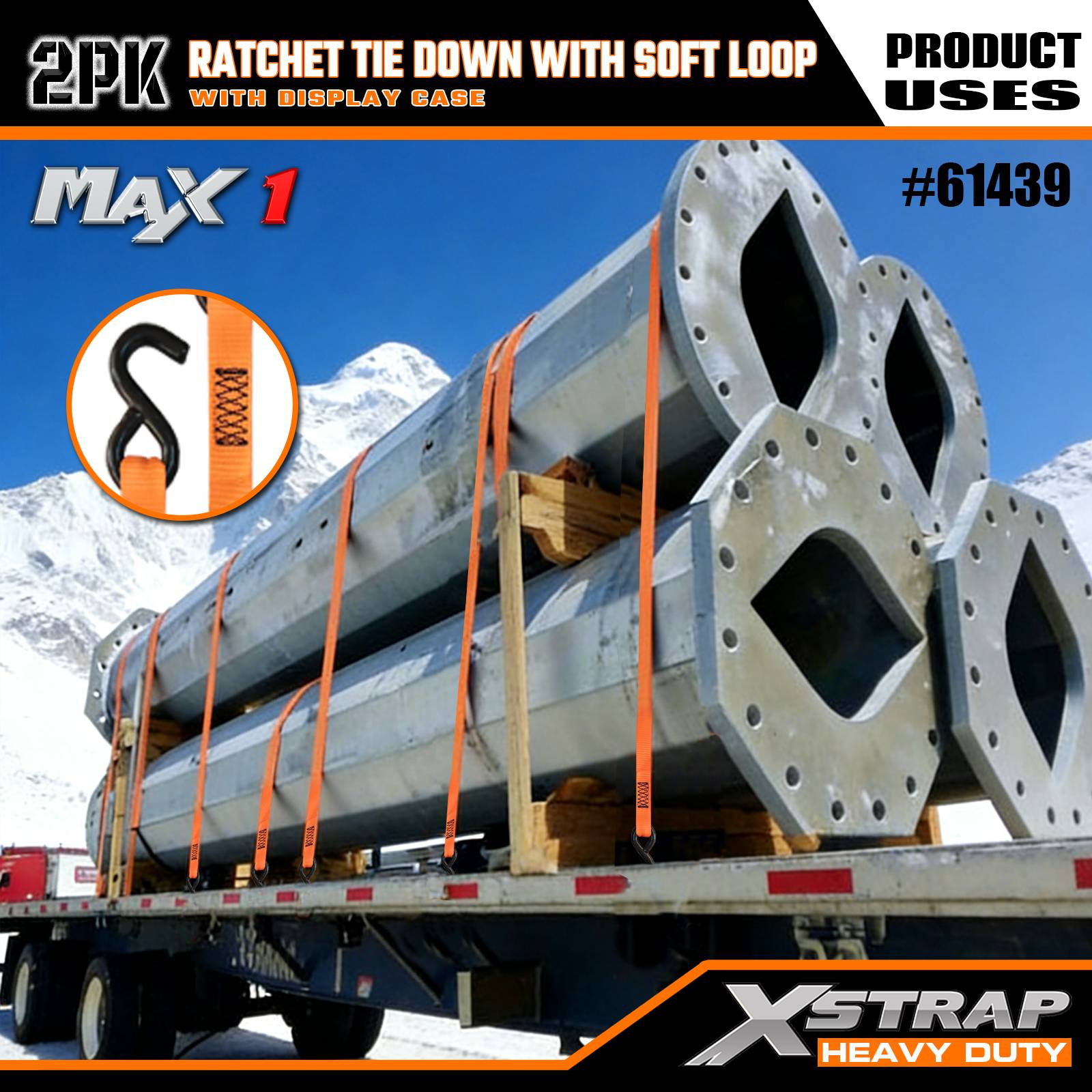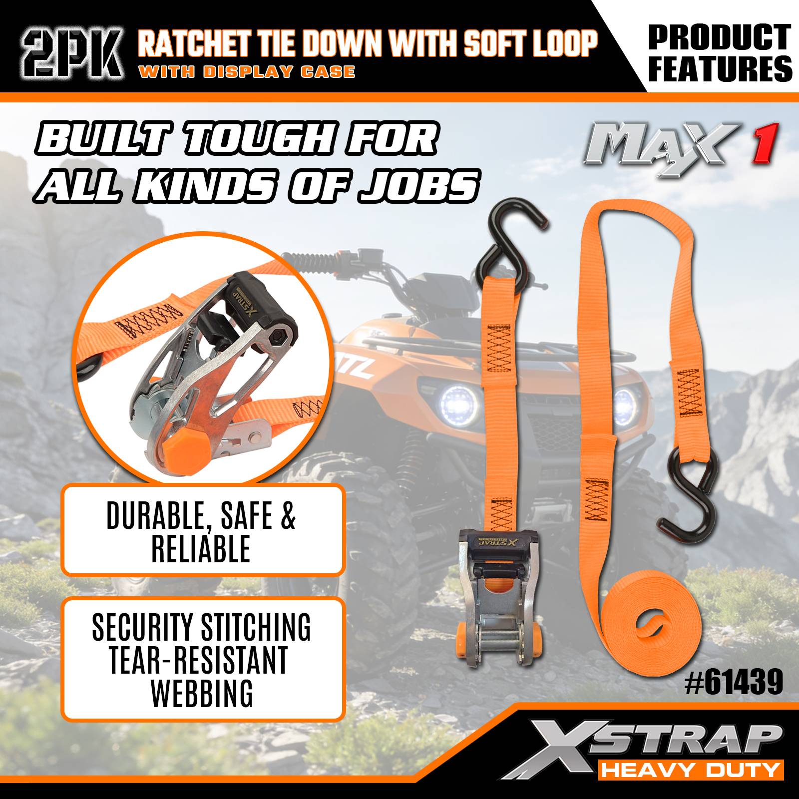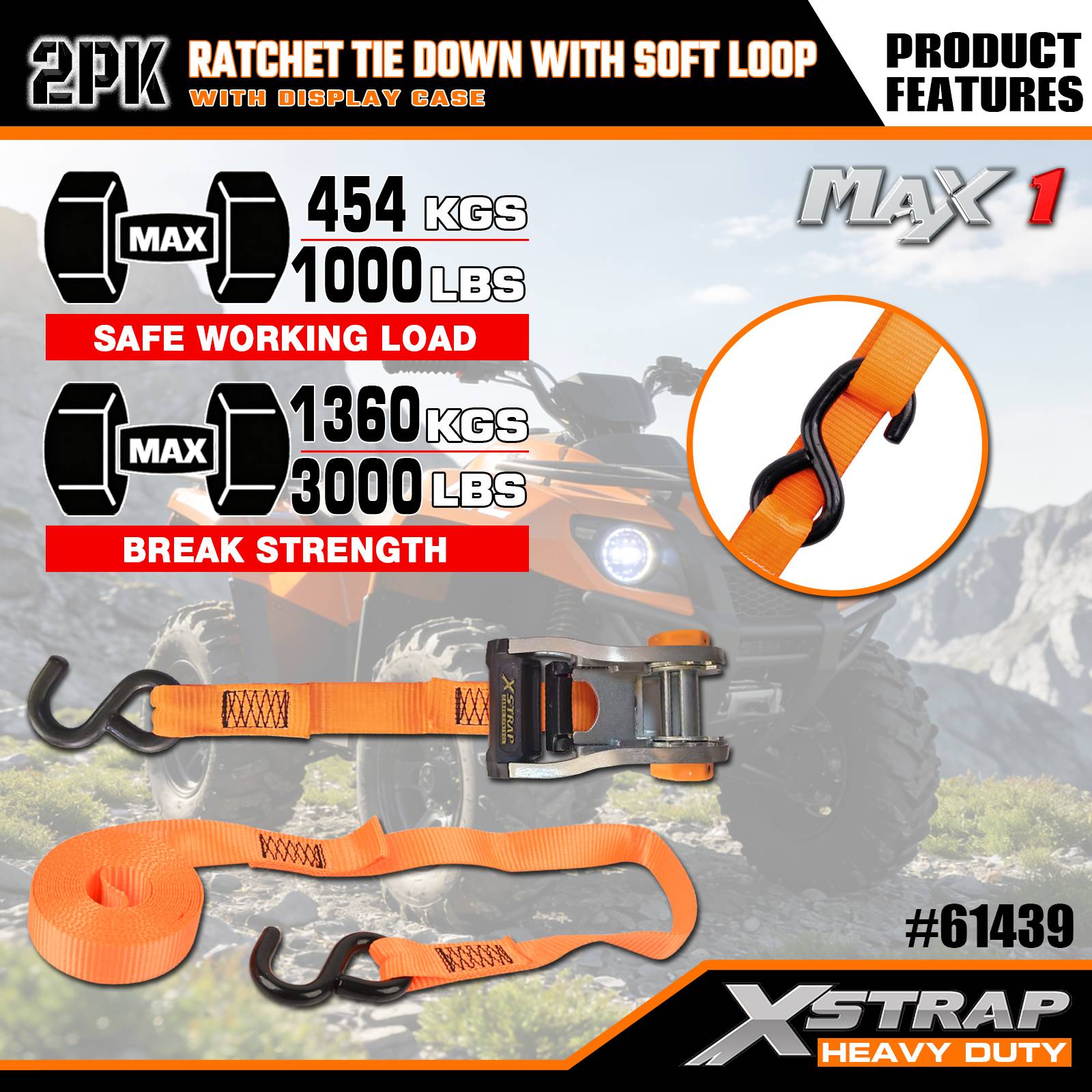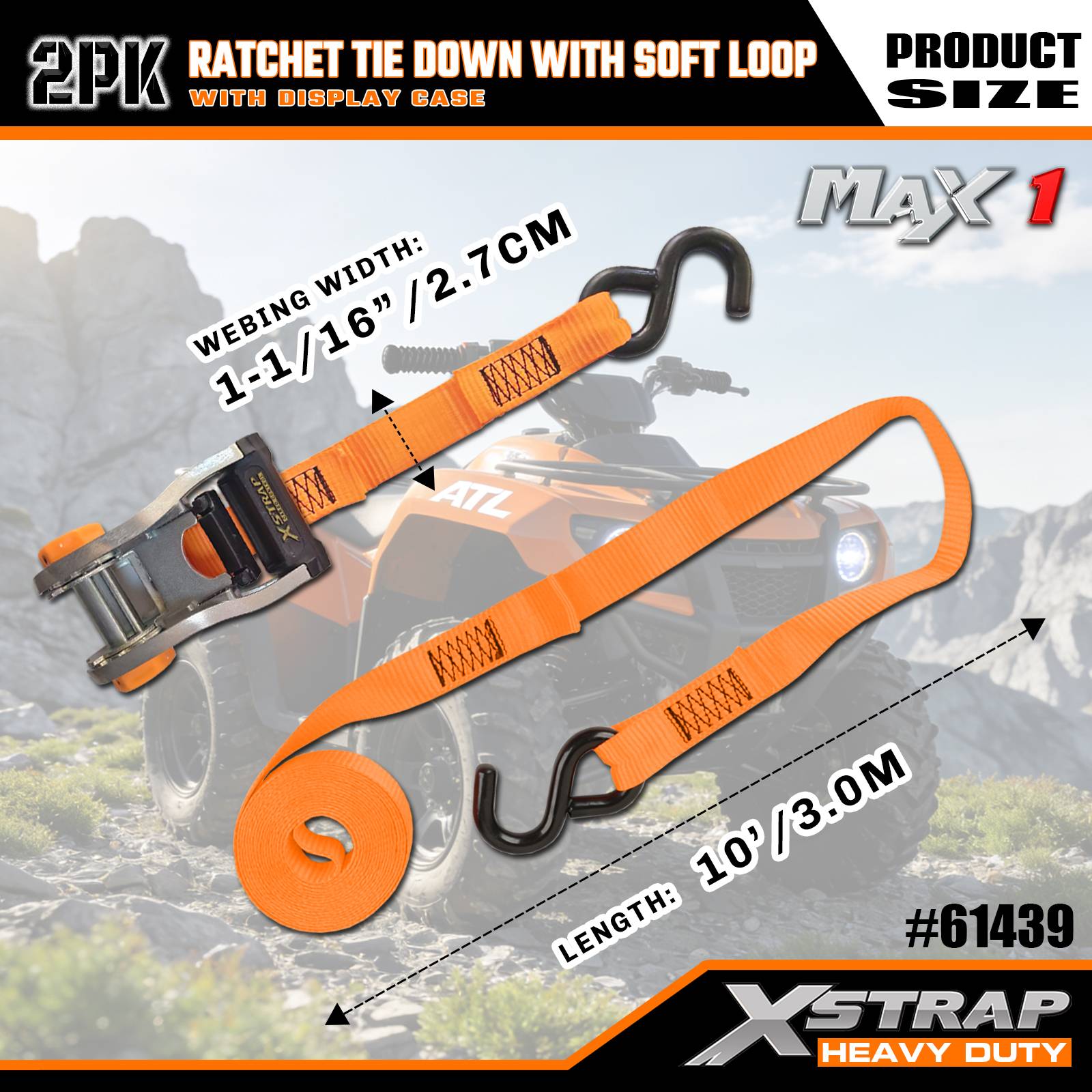Xstrap 2-pack ratelbinder met zachte lus, 1-1/16" x 10' polyester spanband Trek-ratelriem, 1000 lbs capaciteit vrachtspanbanden met S-haken voor vrachtwagen, SUV, auto-toprekken motorfiets.