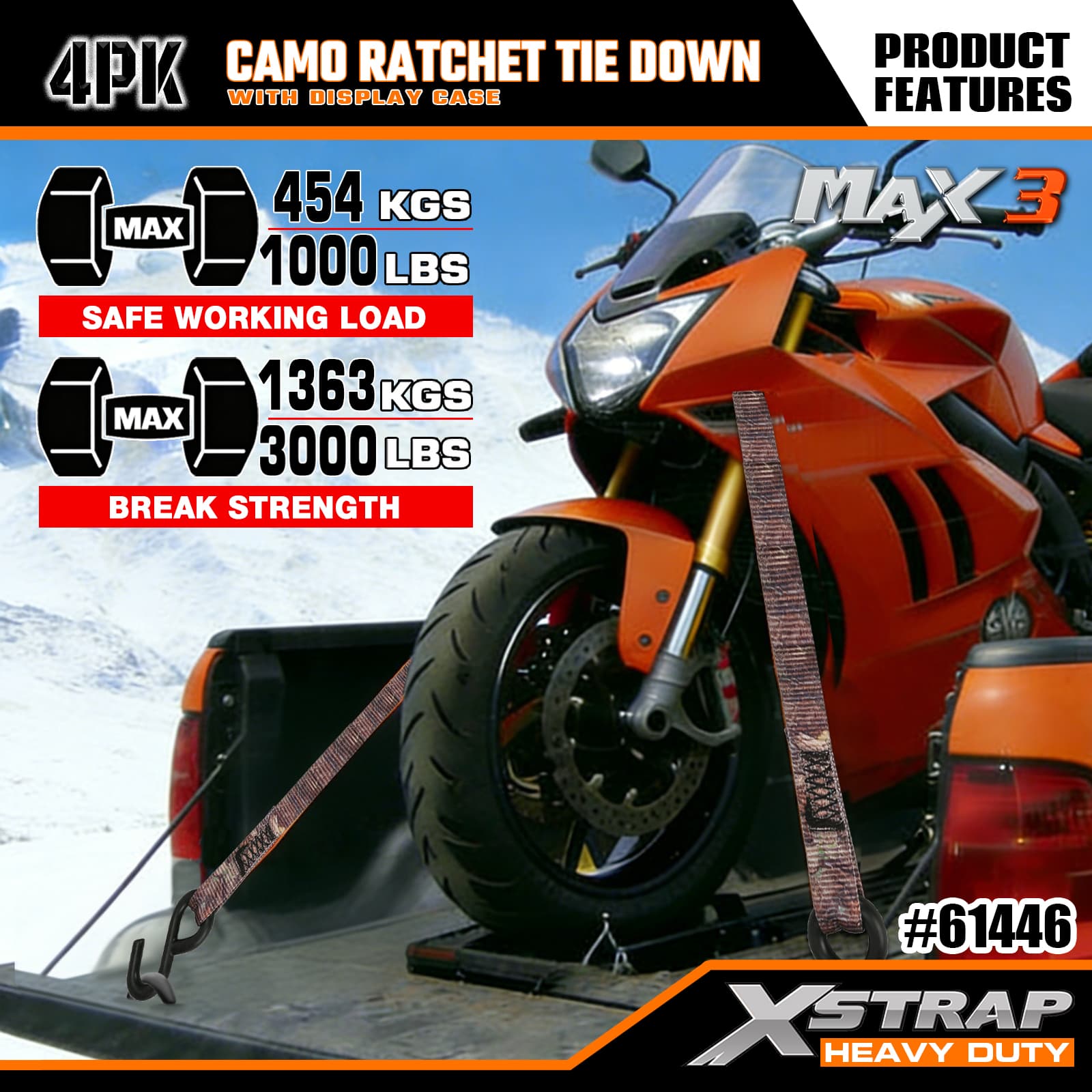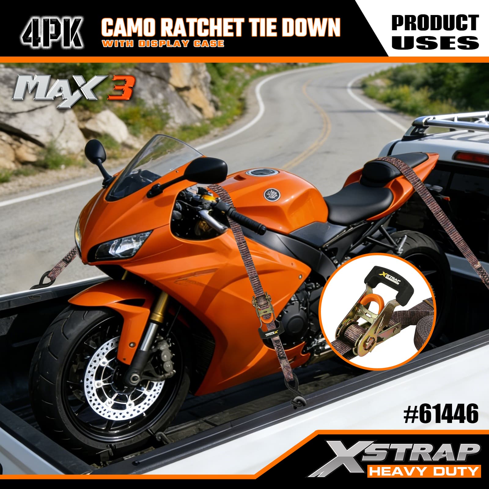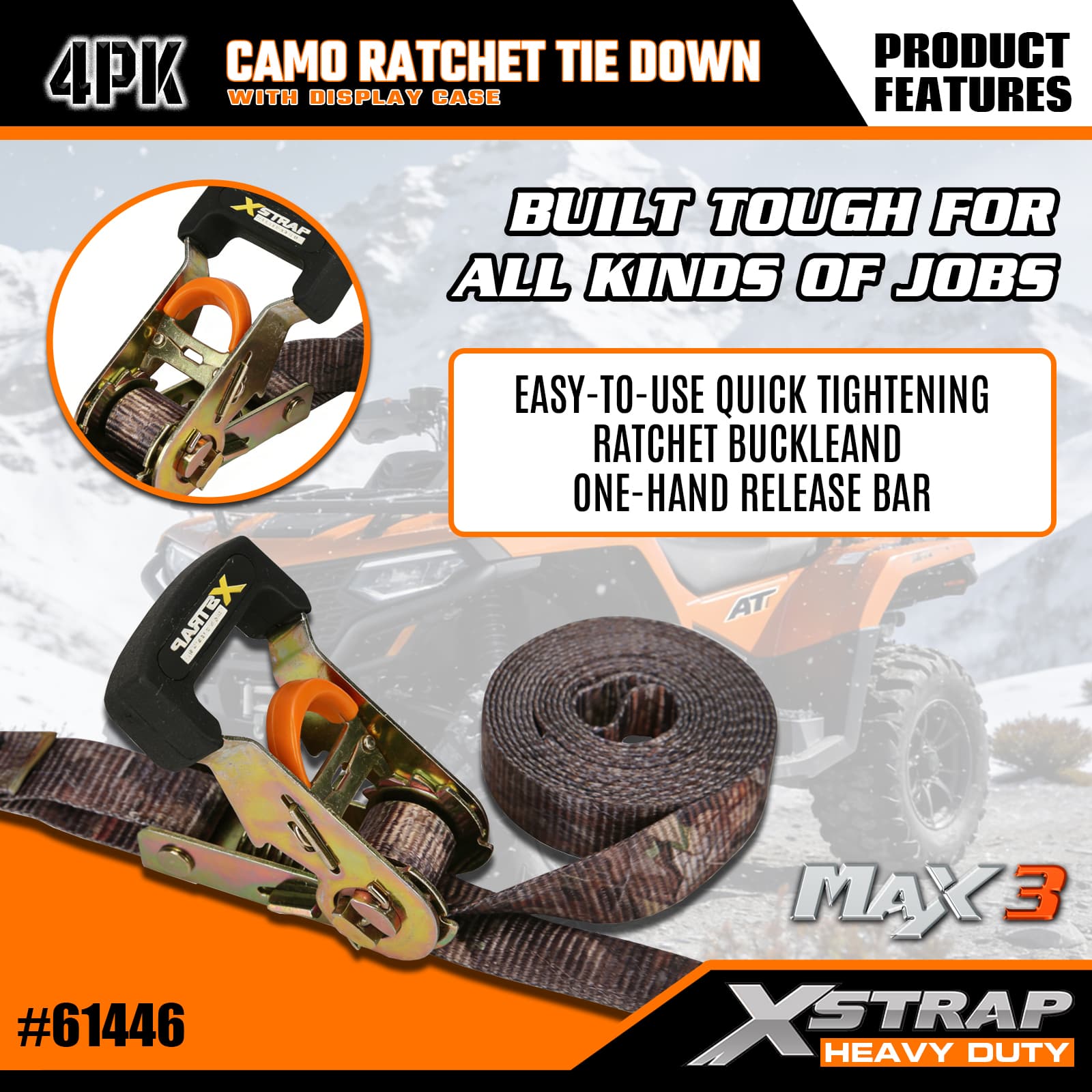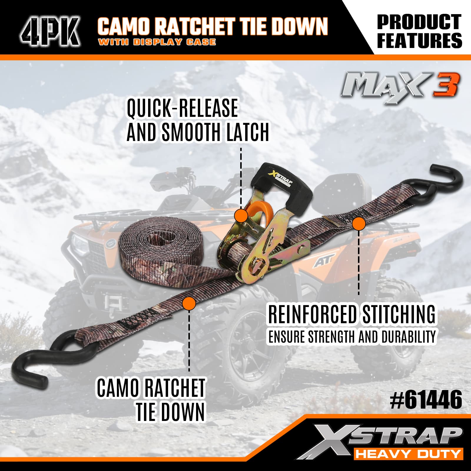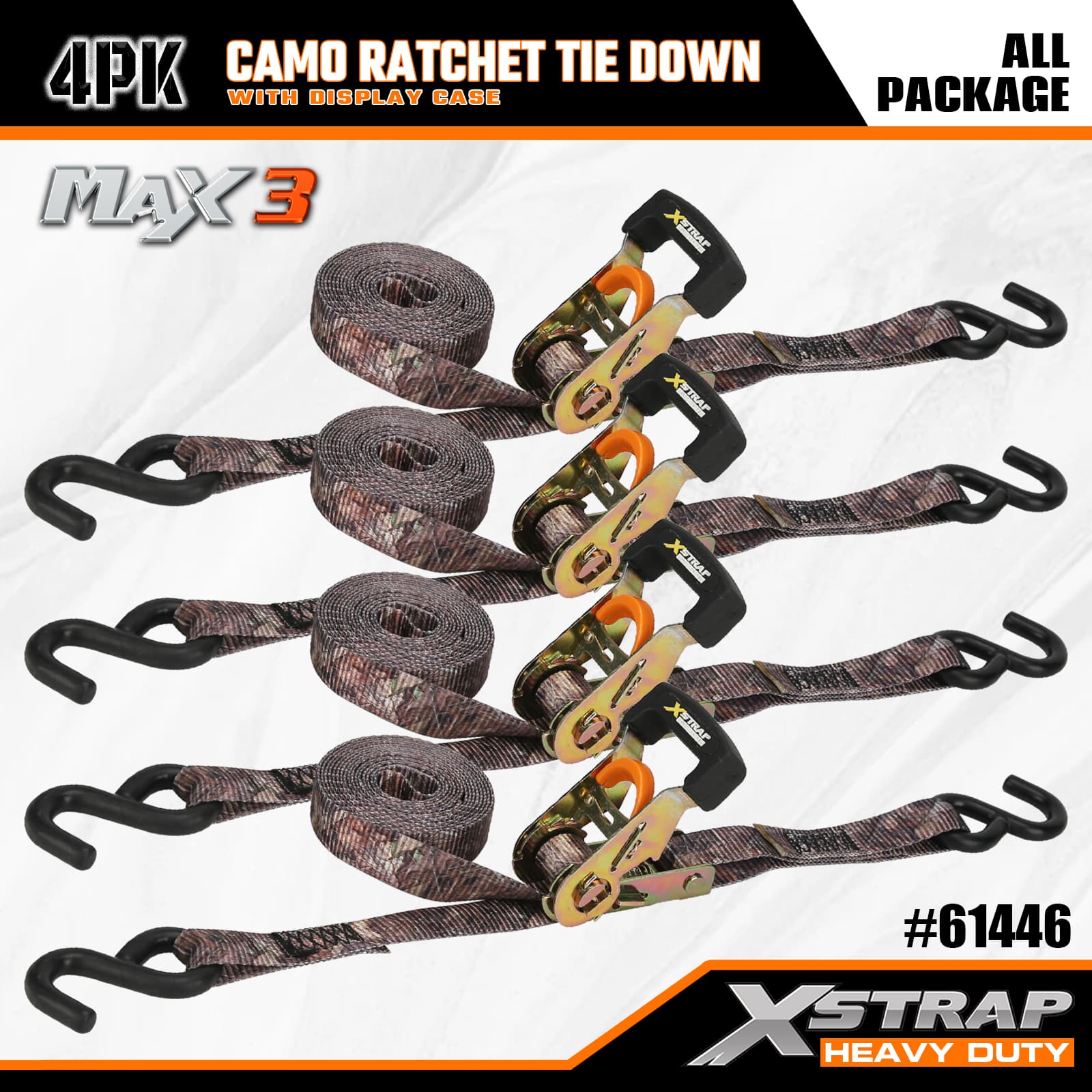 Xstrap 4-pack Camo-ratelspanbanden, 1-1/16" x 12' polyester spanband Trek-ratelband, capaciteit van 1000 lbs Ladingspanbanden met S-haken voor pick-up, SUV, auto-toprekken, motorfiets, lichte vissersboot, jetski, sneeuwscooter, gazontractor.