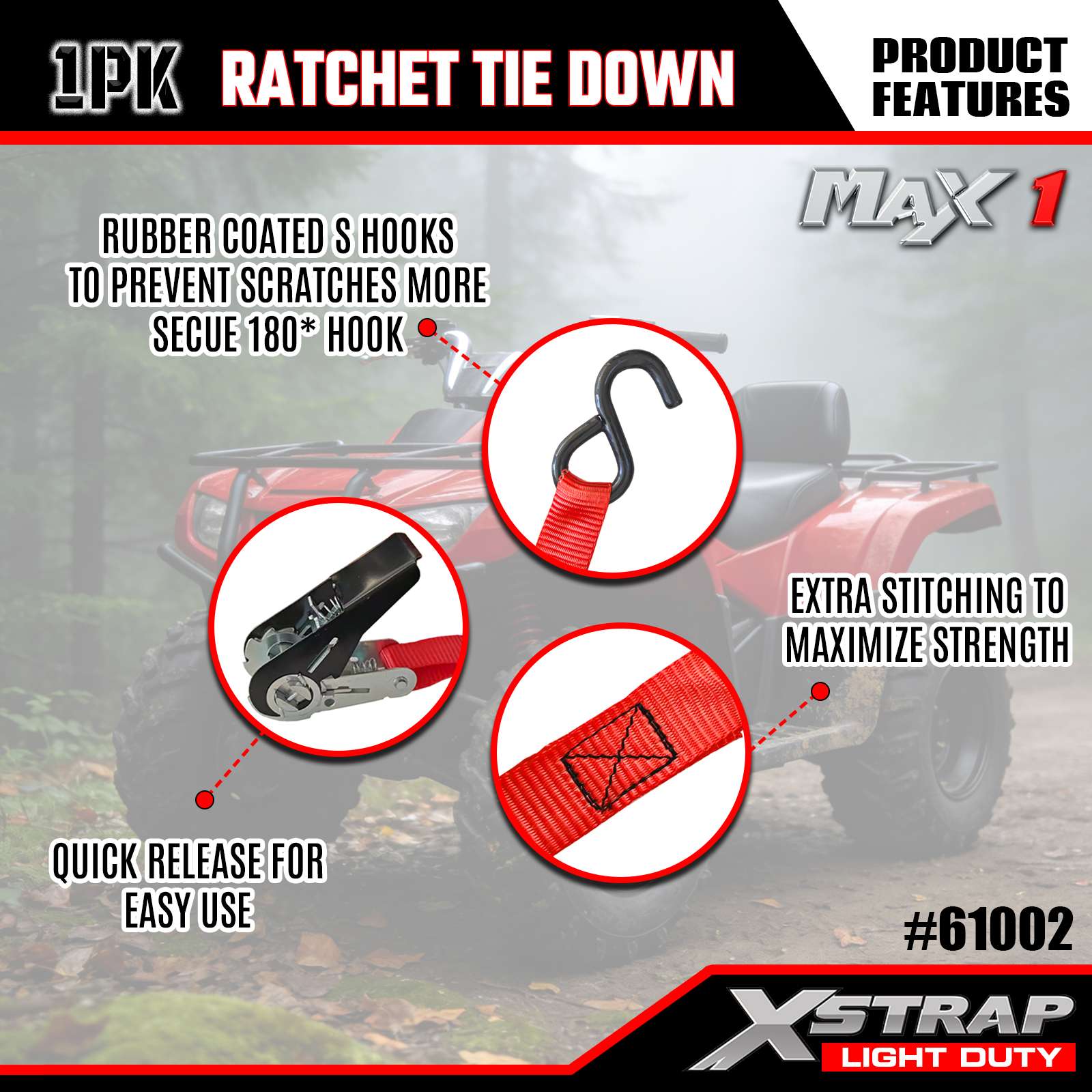 - Veilige en beschermende met rubber beklede S-haken: De 180° te openen S-haken zijn volledig bedekt met rubber, waardoor een antisliphandgreep ontstaat om onbedoeld loskomen tijdens transport te voorkomen. De rubberen laag fungeert ook als buffer en voorkomt krassen, slijtplekken of deuken op gevoelige vrachtoppervlakken (bijvoorbeeld geverfde dozen, fietsframes) en voertuigankerpunten (bijvoorbeeld vrachtwagenbedrails).