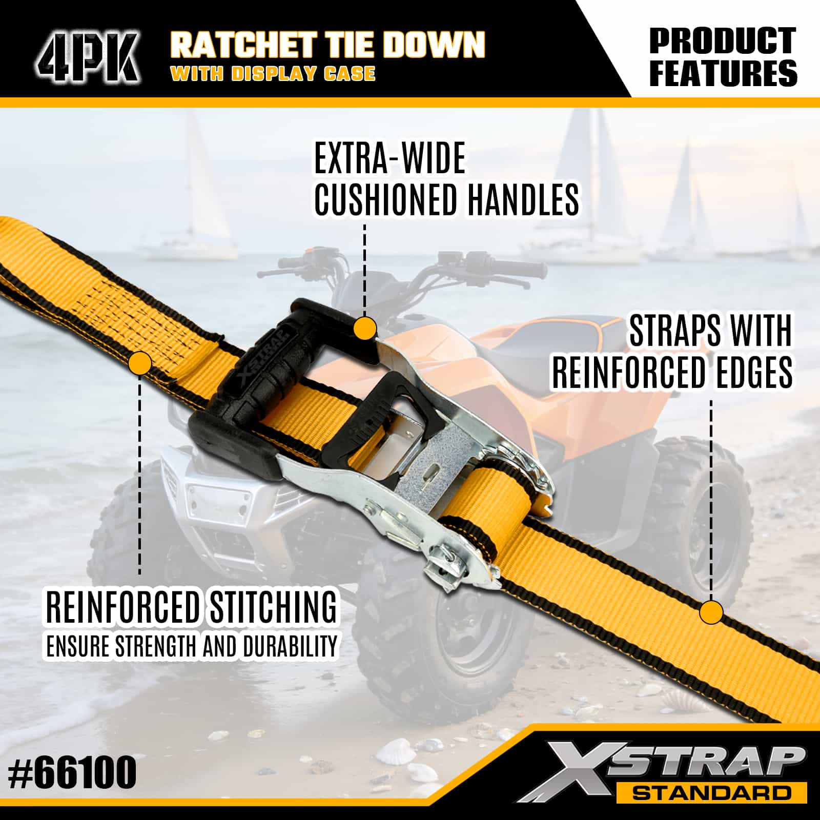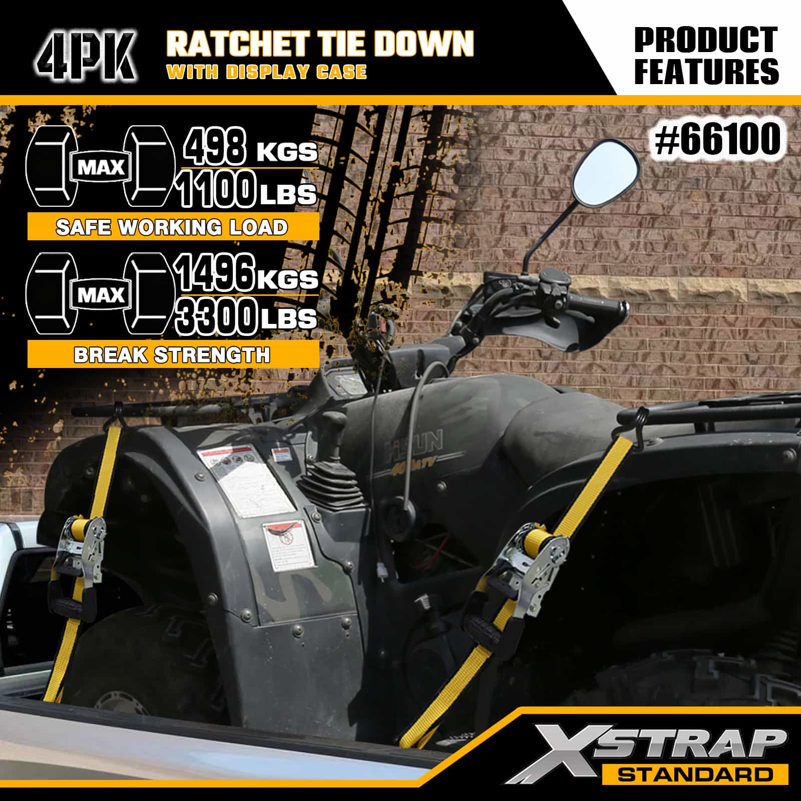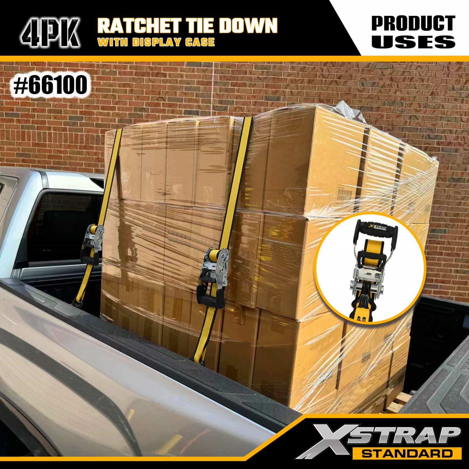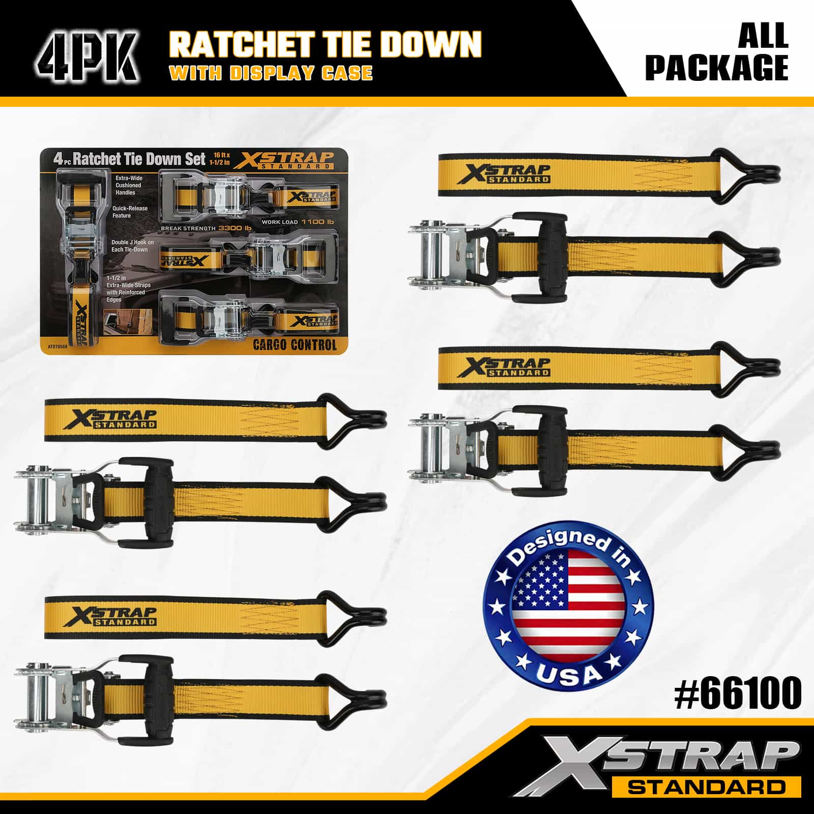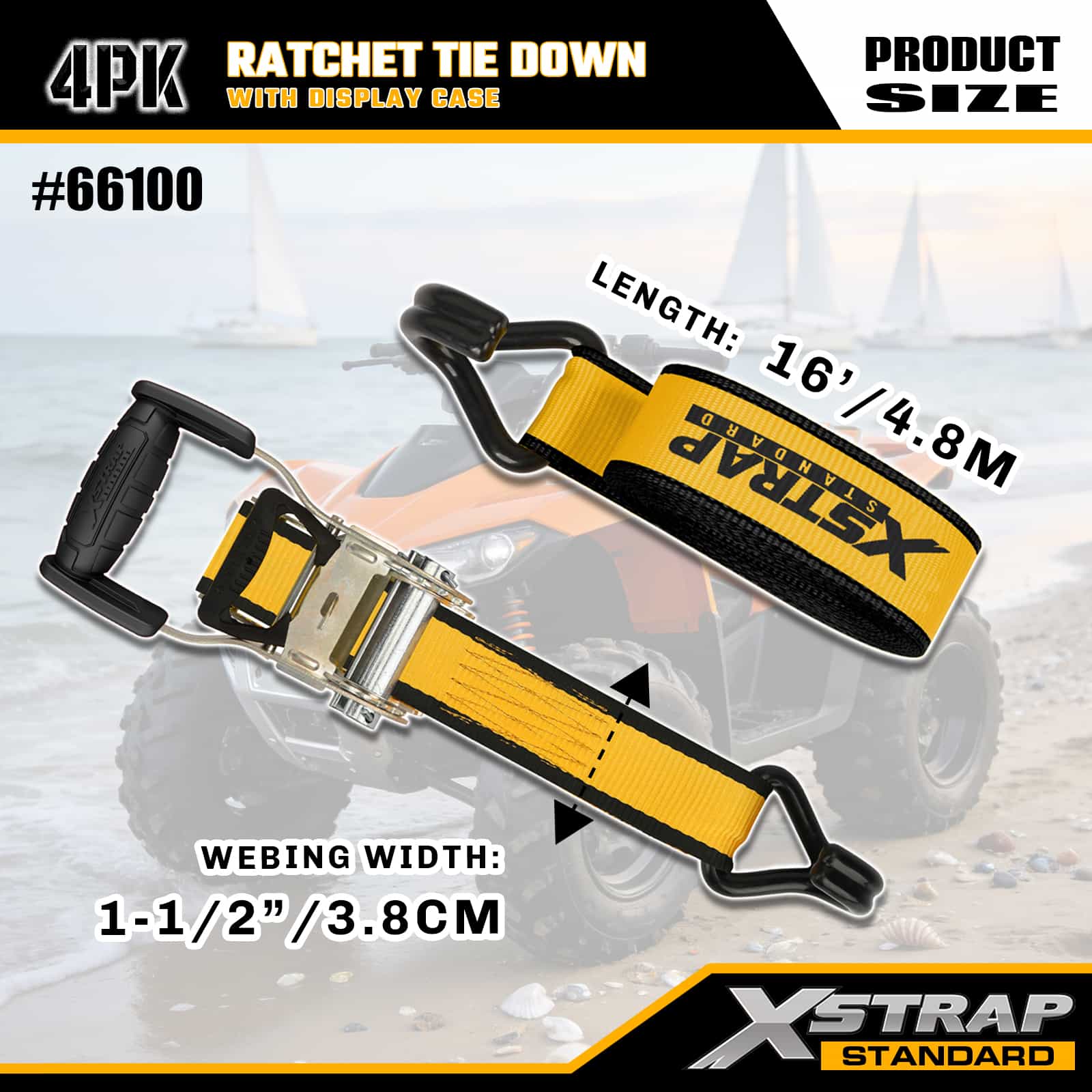 Xstrap 4-pack spanbanden met dubbele J-haken, 1-1/2" x 16' polyester spanband Trek-ratelband, capaciteit van 1100 lbs Ladingspanbanden met dubbele J-haken voor pick-up, SUV, auto-toprekken, motorfiets, lichte vissersboot, jetski, sneeuwscooter, gazontractor.