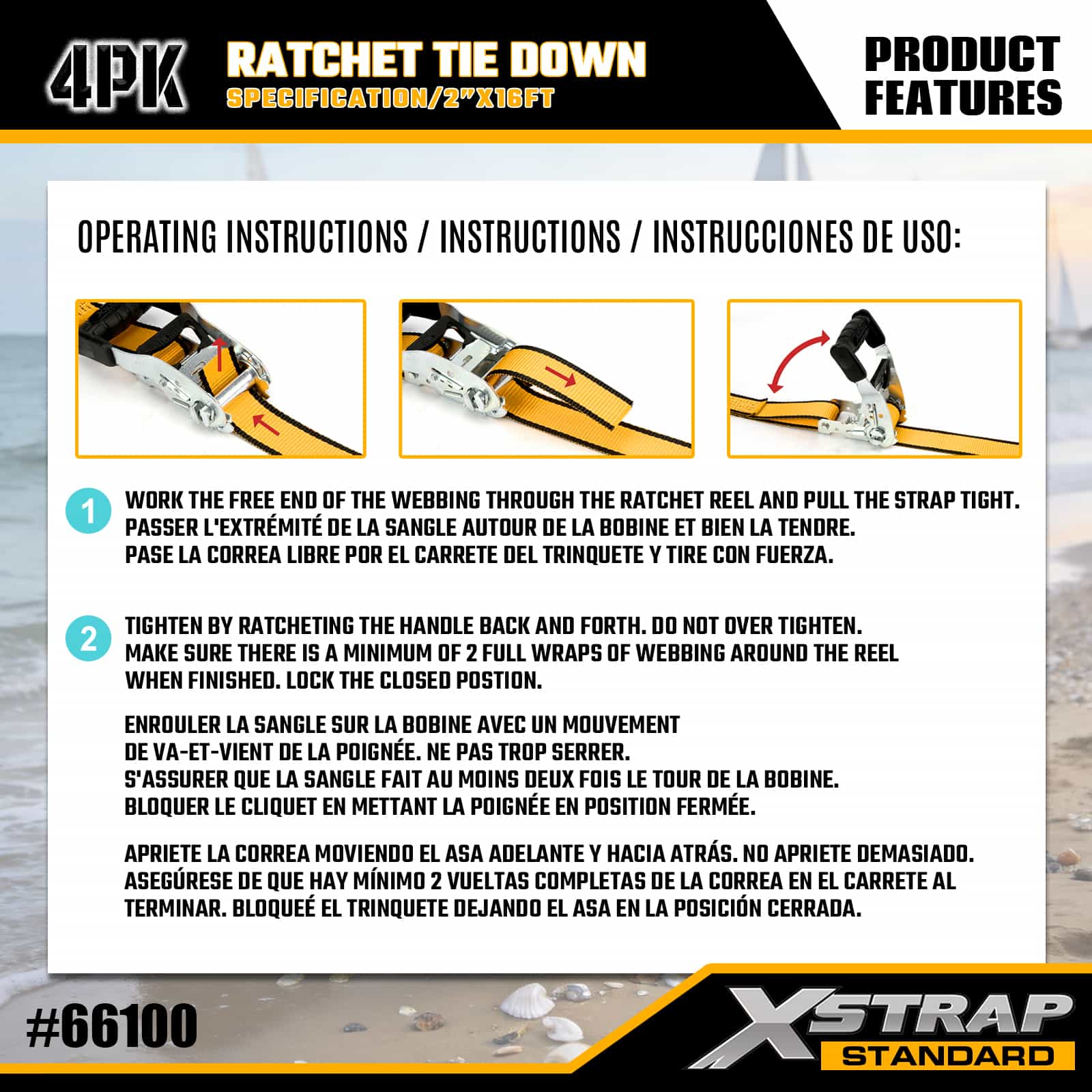 - Prominente etikettering van het draagvermogen: Elke spanband is duidelijk gemarkeerd met een veilige werklast (SWL) van 498 kg / 1100 lbs en een breeksterkte van 1496 kg / 3300 lbs, wat duidelijke veiligheidsrichtlijnen biedt om een juiste, risicovrije toepassing voor alle soorten lading te garanderen.